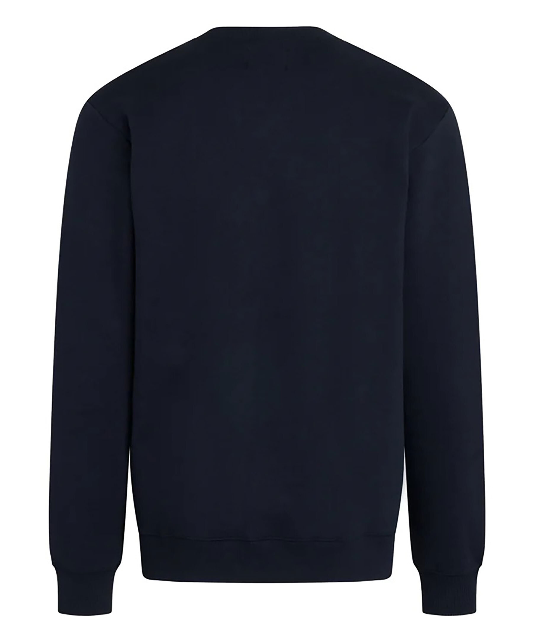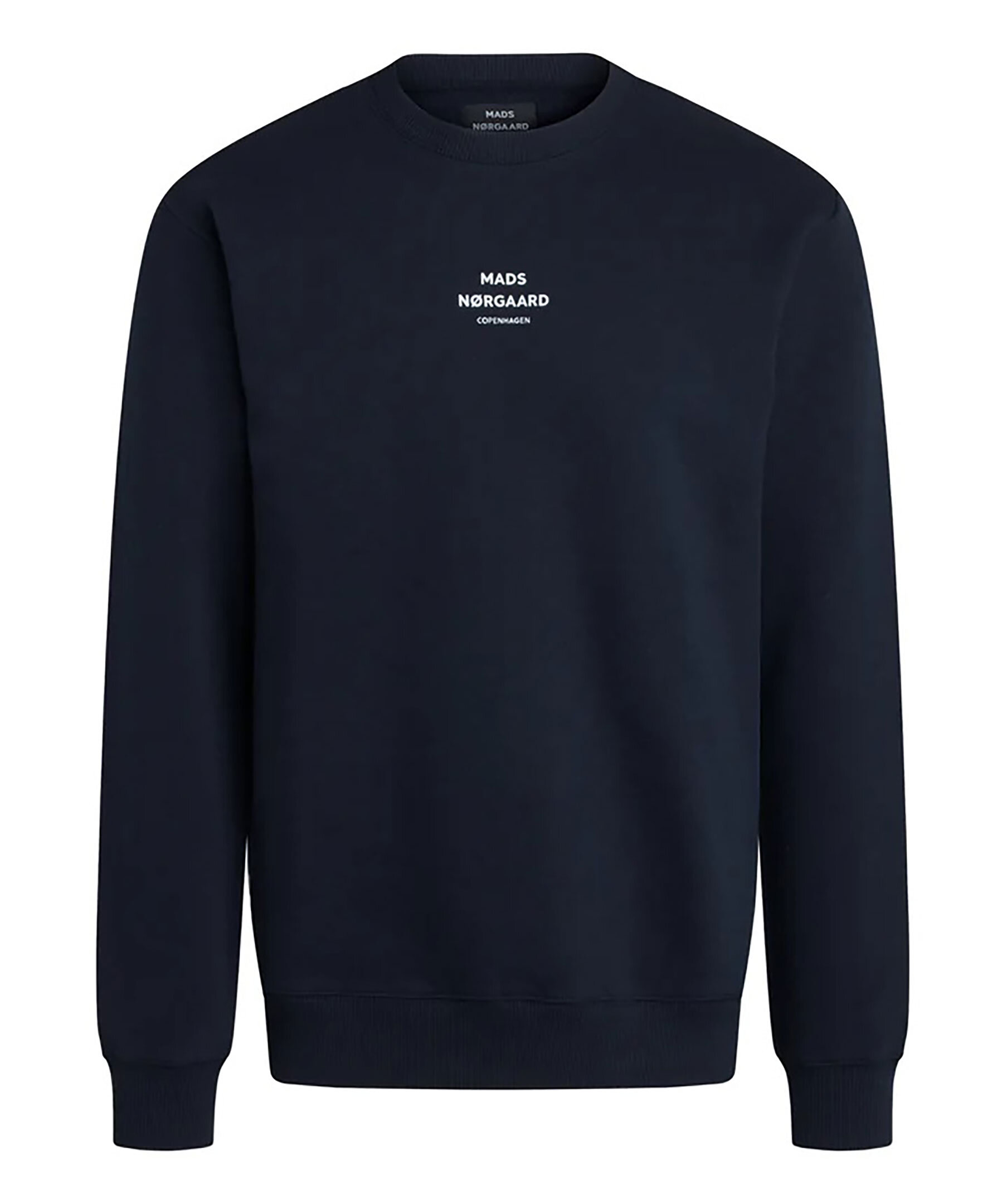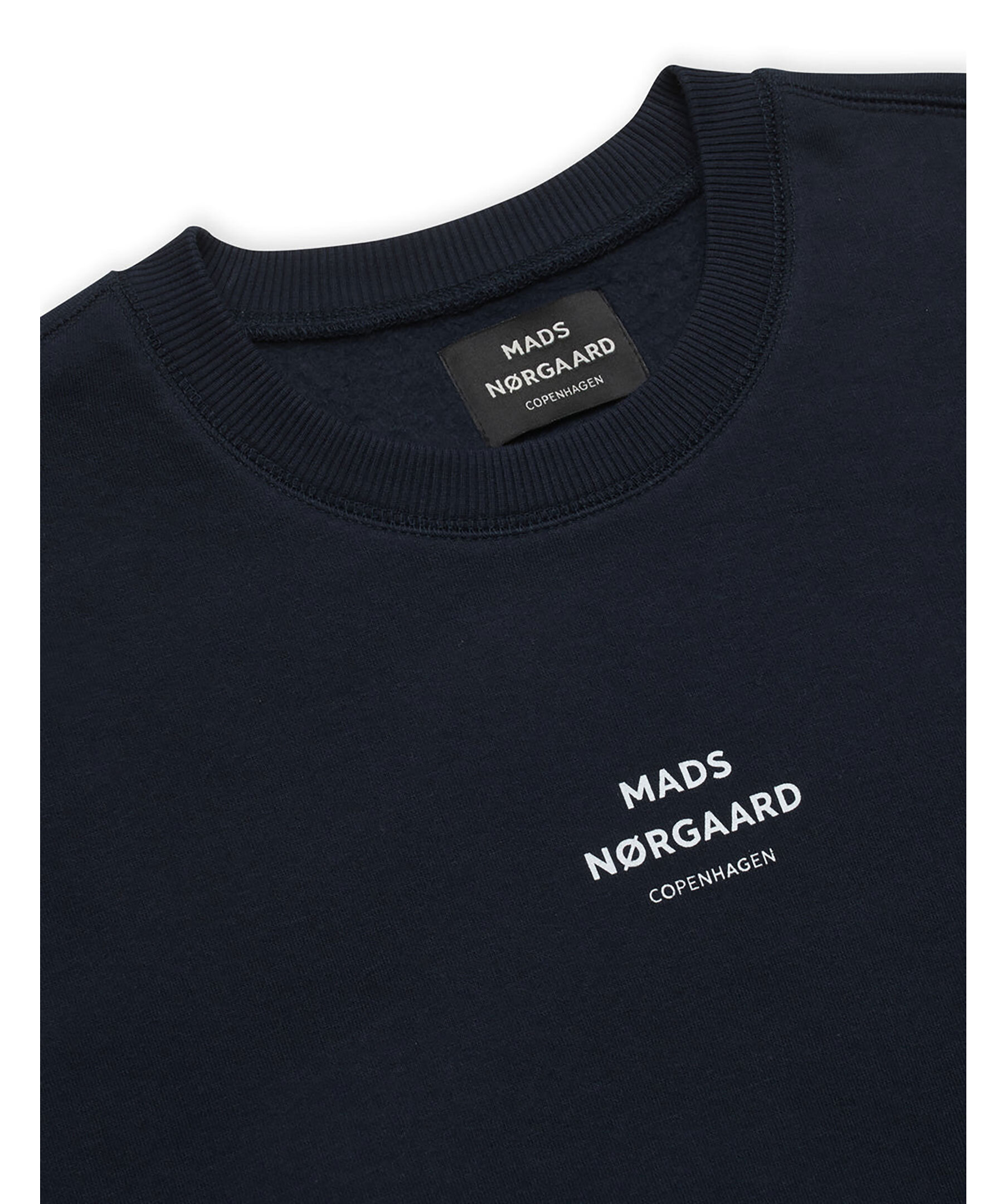 Marinblå sweatshirt från Mads Nørgaard. En enkel, klädsam och skön sweatshirt tillverkad av mjuk bomull och polyester med en mjuk, borstad baksida. Den har en normal passform, ribbade muddar vid halsringning, handleder och midja samt har en liten logotyp tryckt högt upp mitt på bröstet.