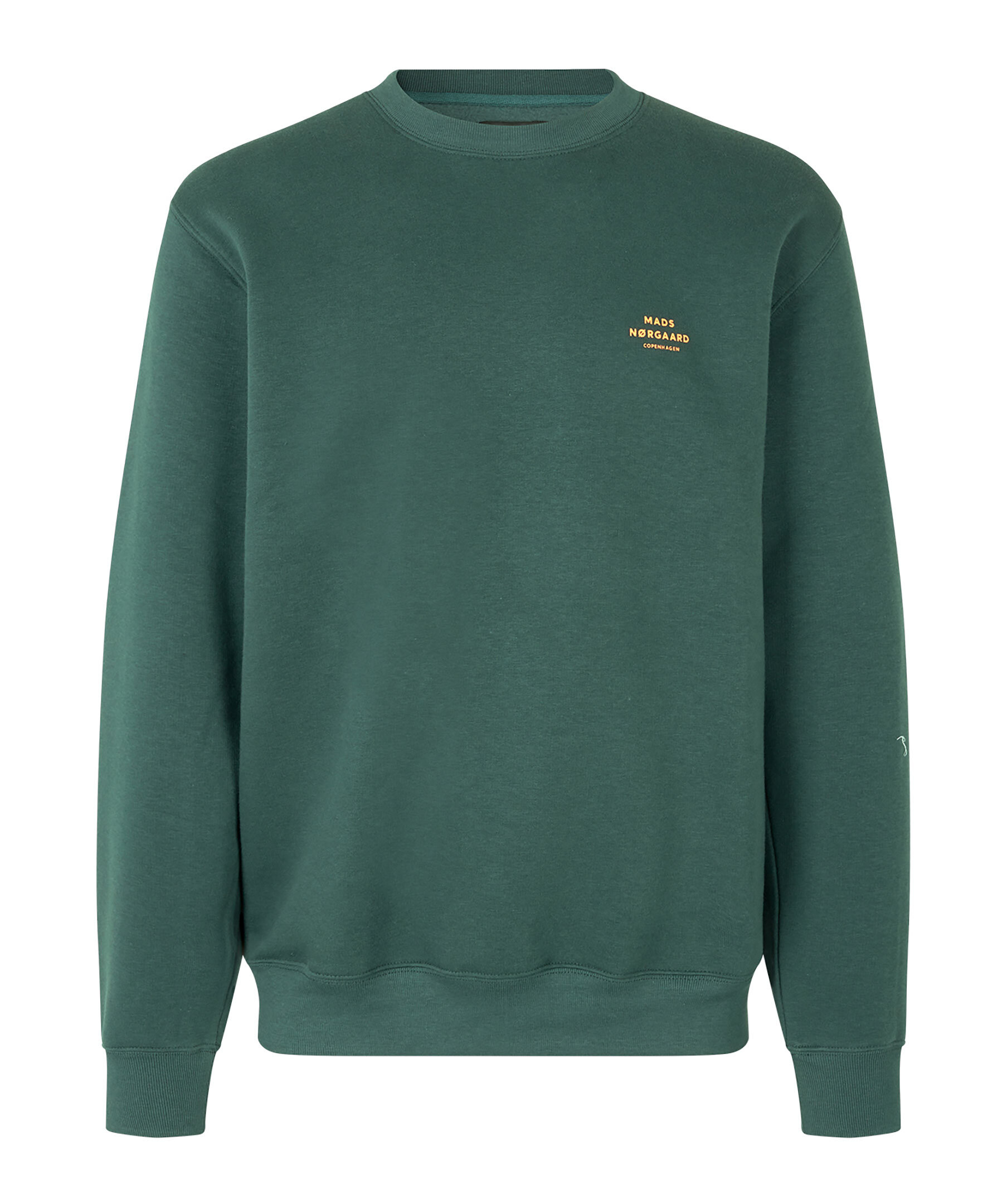 Skogsgrön sweatshirt från Mads Nørgaard. Tillverkad i en bomullsblandning och har en mjuk borstad insida. Passformen är vanlig, den har ribbad kant och på bröstet är en liten logga tryckt.