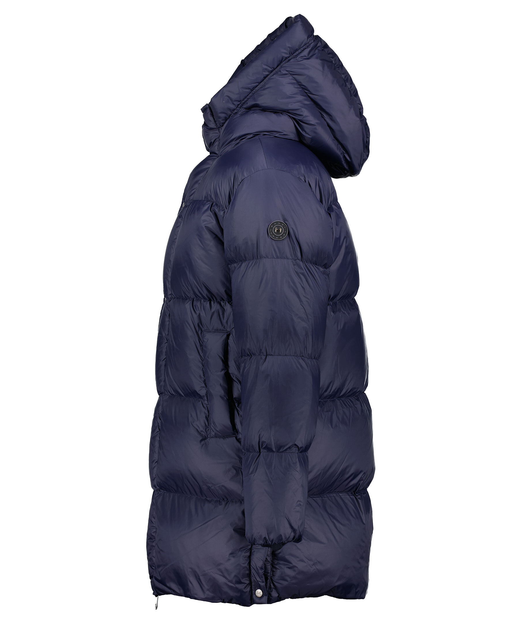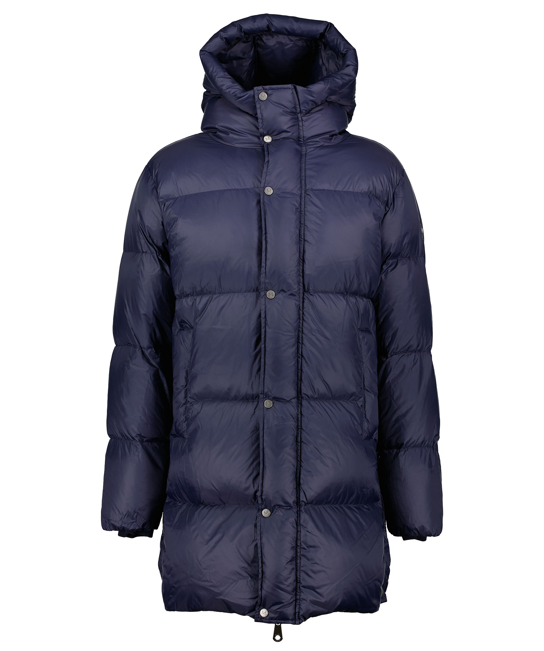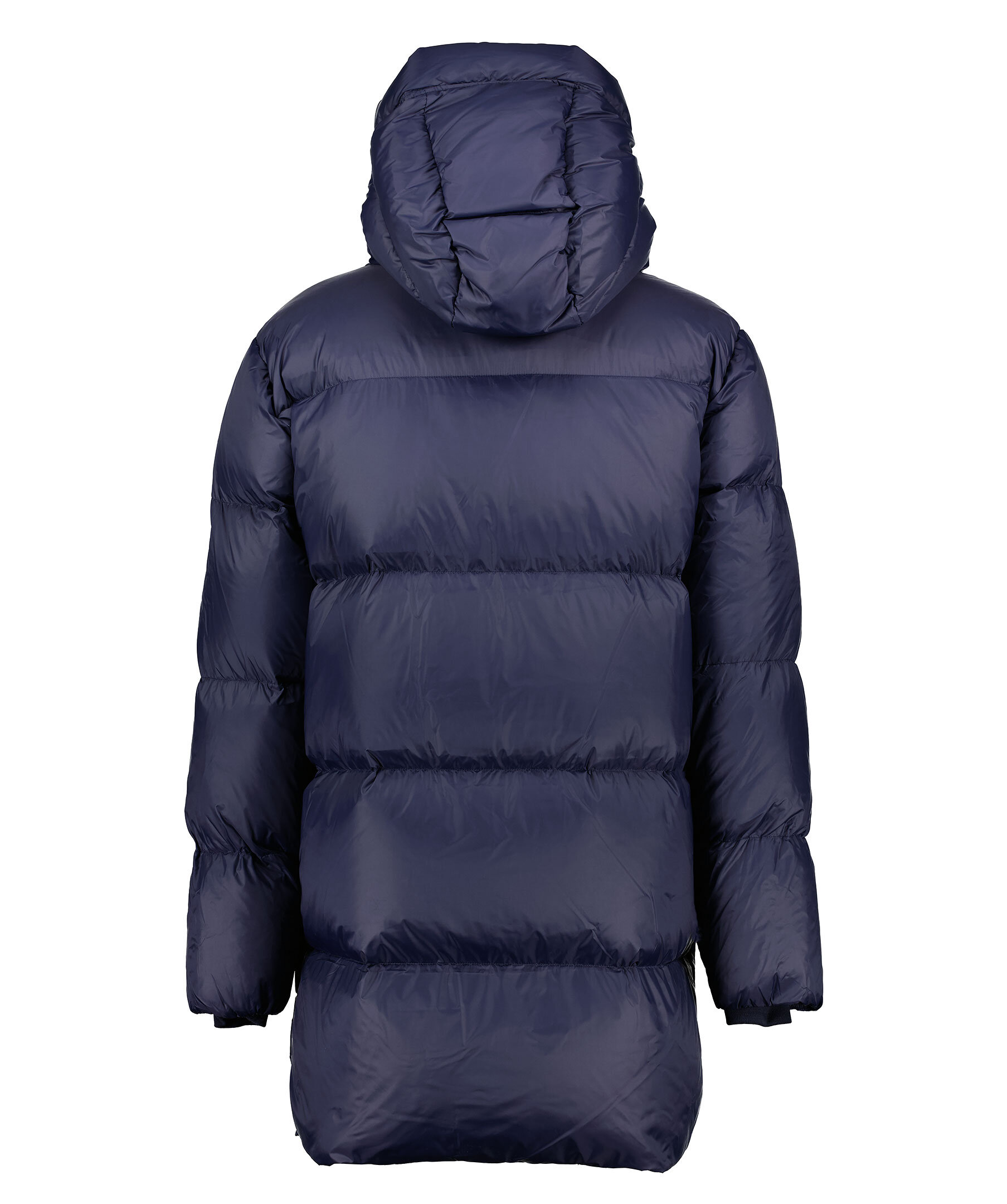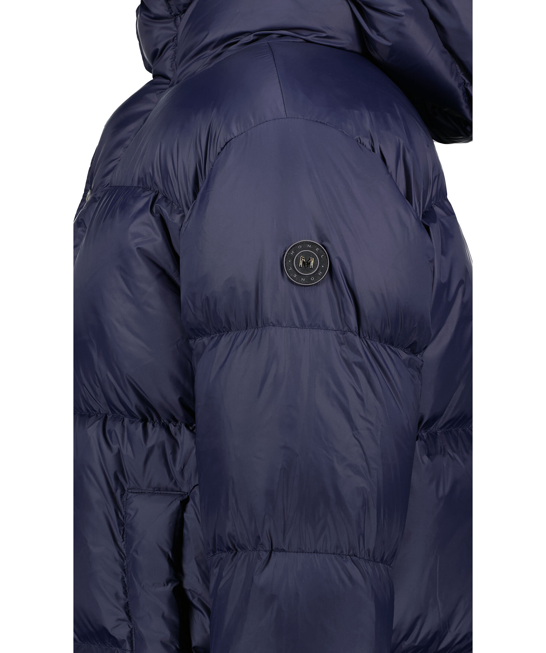 Marinblå quiltad dunjacka från Monel som stängs med tryckknappar och dragkedja. Två fickor framtill som stängs med tryckknappar. Innerfickor som stängs med dragkedja. Ribbstickade muddar vid ärmslut. Slitsar i sidorna med tryckknappar. Gummerad logotyp med metall på vänster ärm.