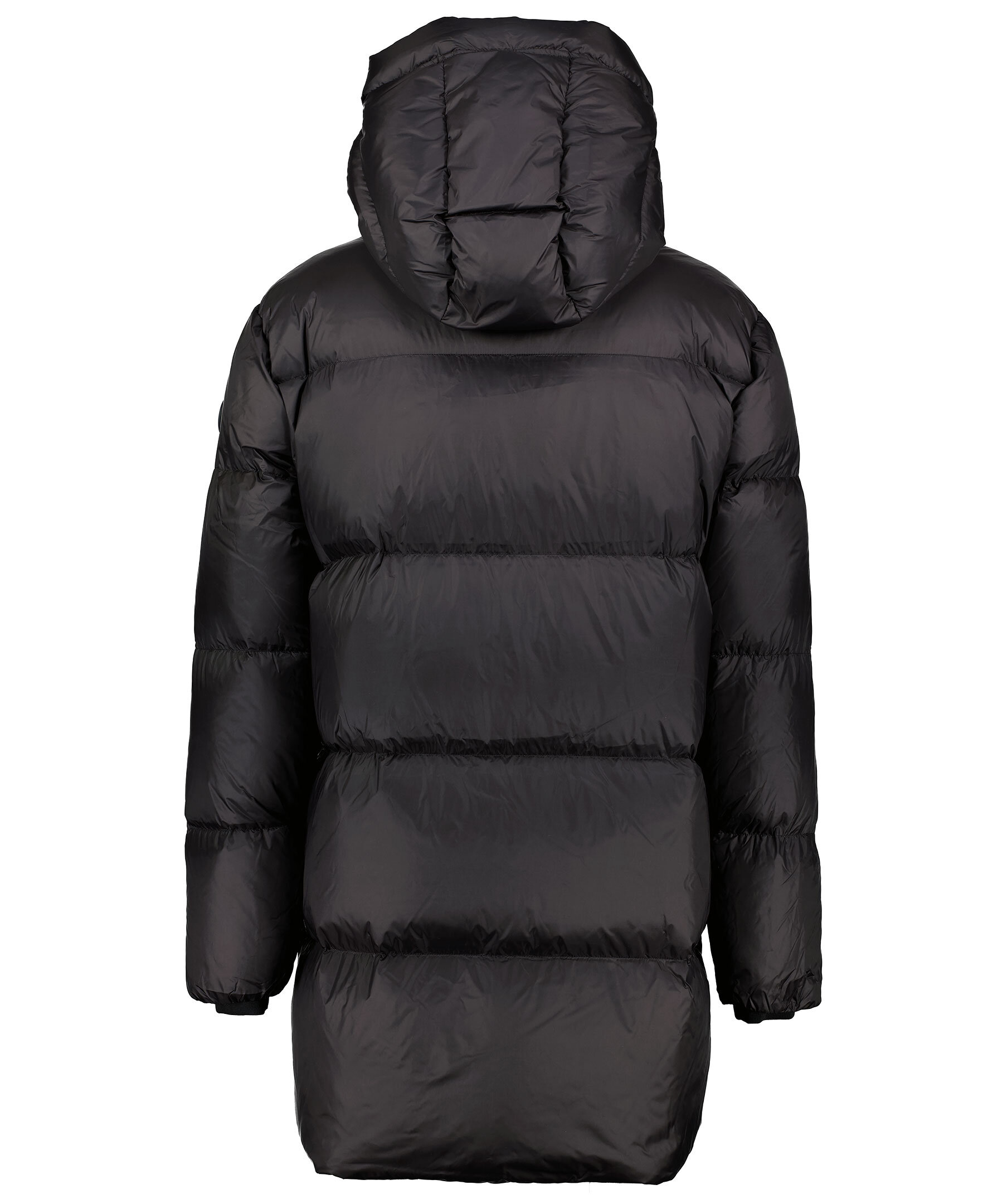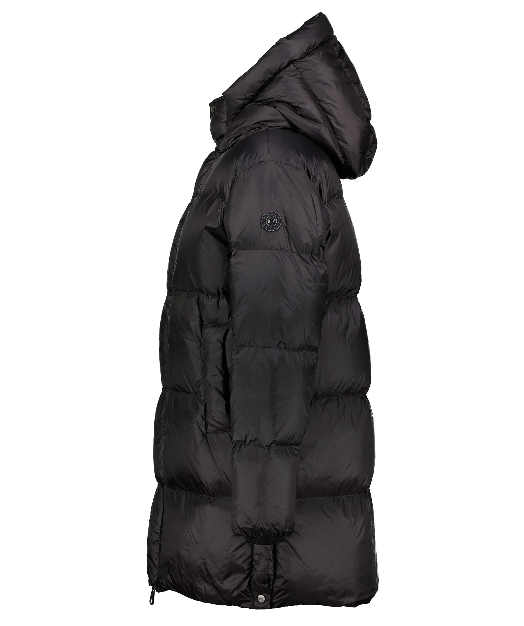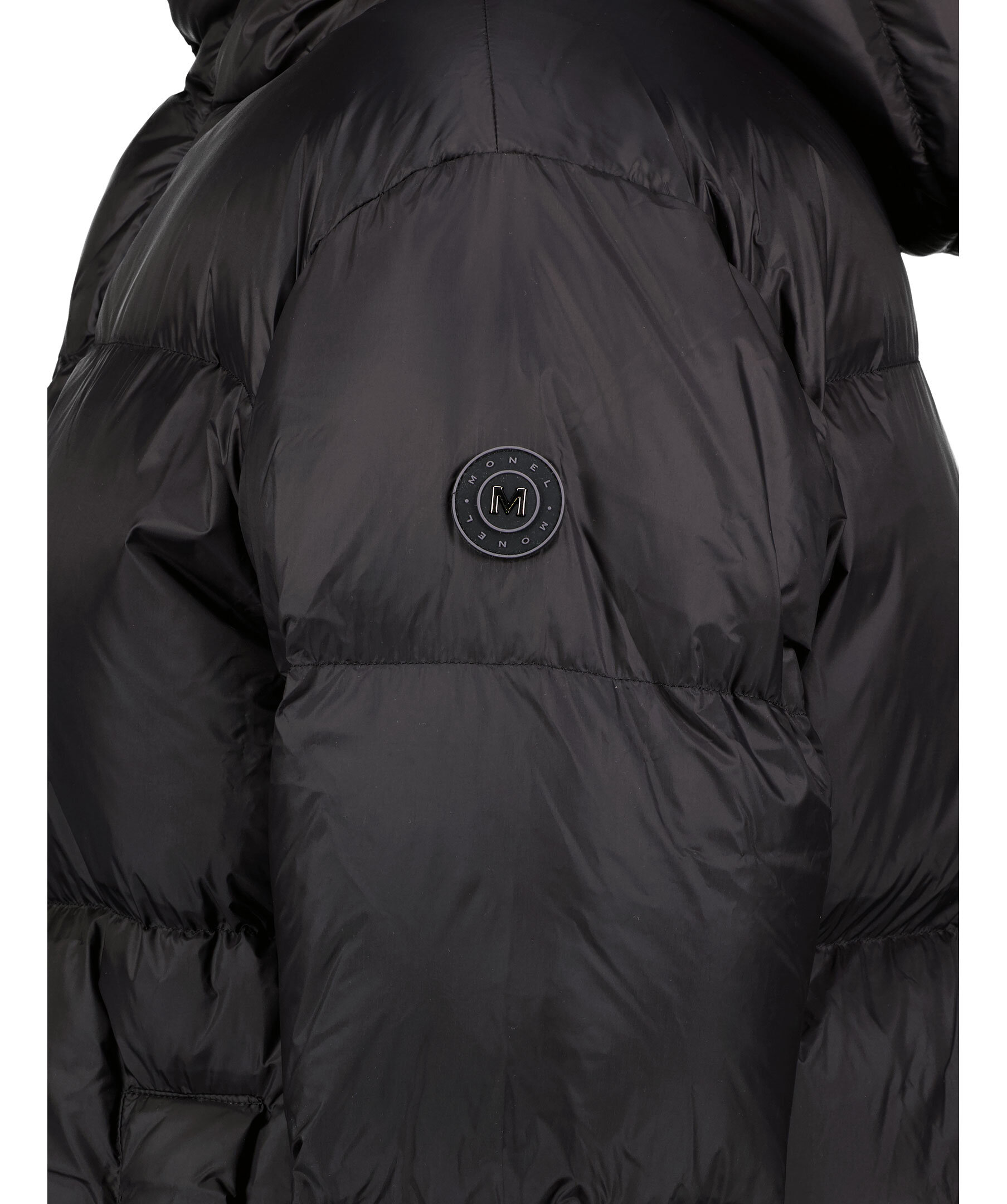 Svart quiltad dunjacka från Monel som stängs med tryckknappar och dragkedja. Två fickor framtill som stängs med tryckknappar. Innerfickor som stängs med dragkedja. Ribbstickade muddar vid ärmslut. Slitsar i sidorna med tryckknappar. Gummerad logotyp med metall på vänster ärm.
