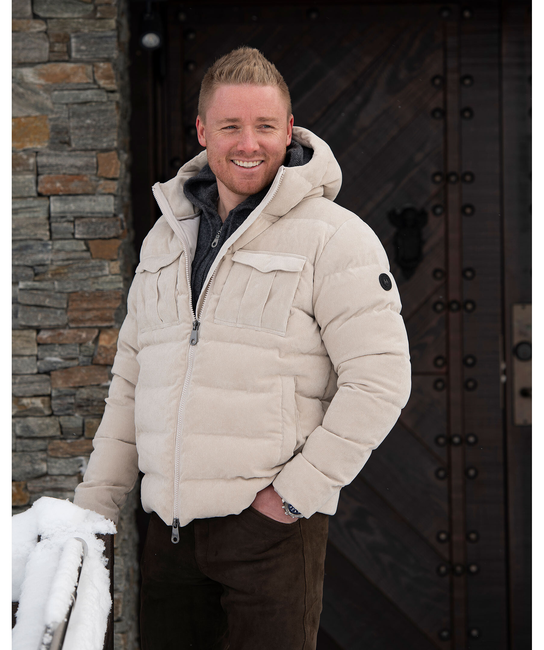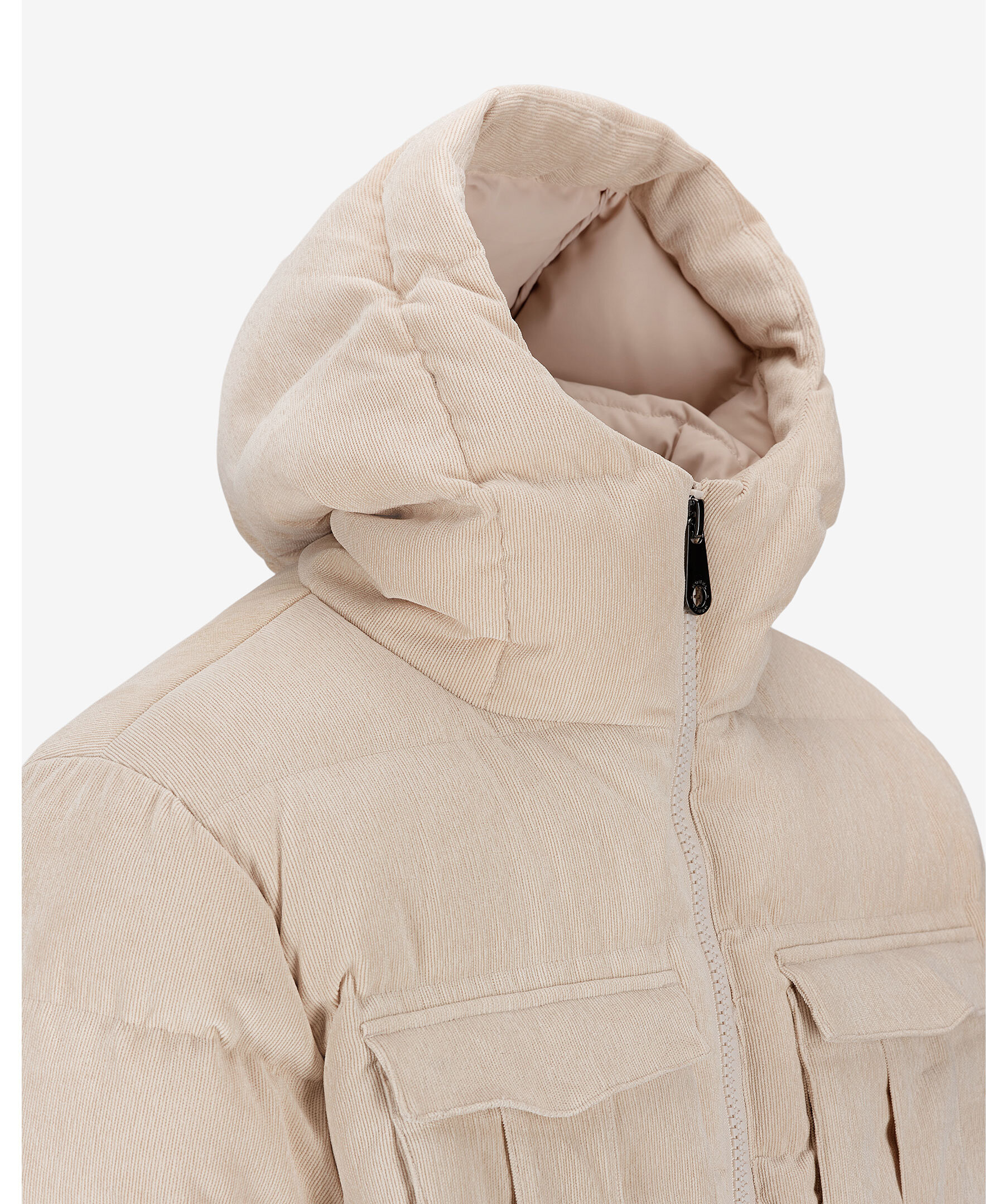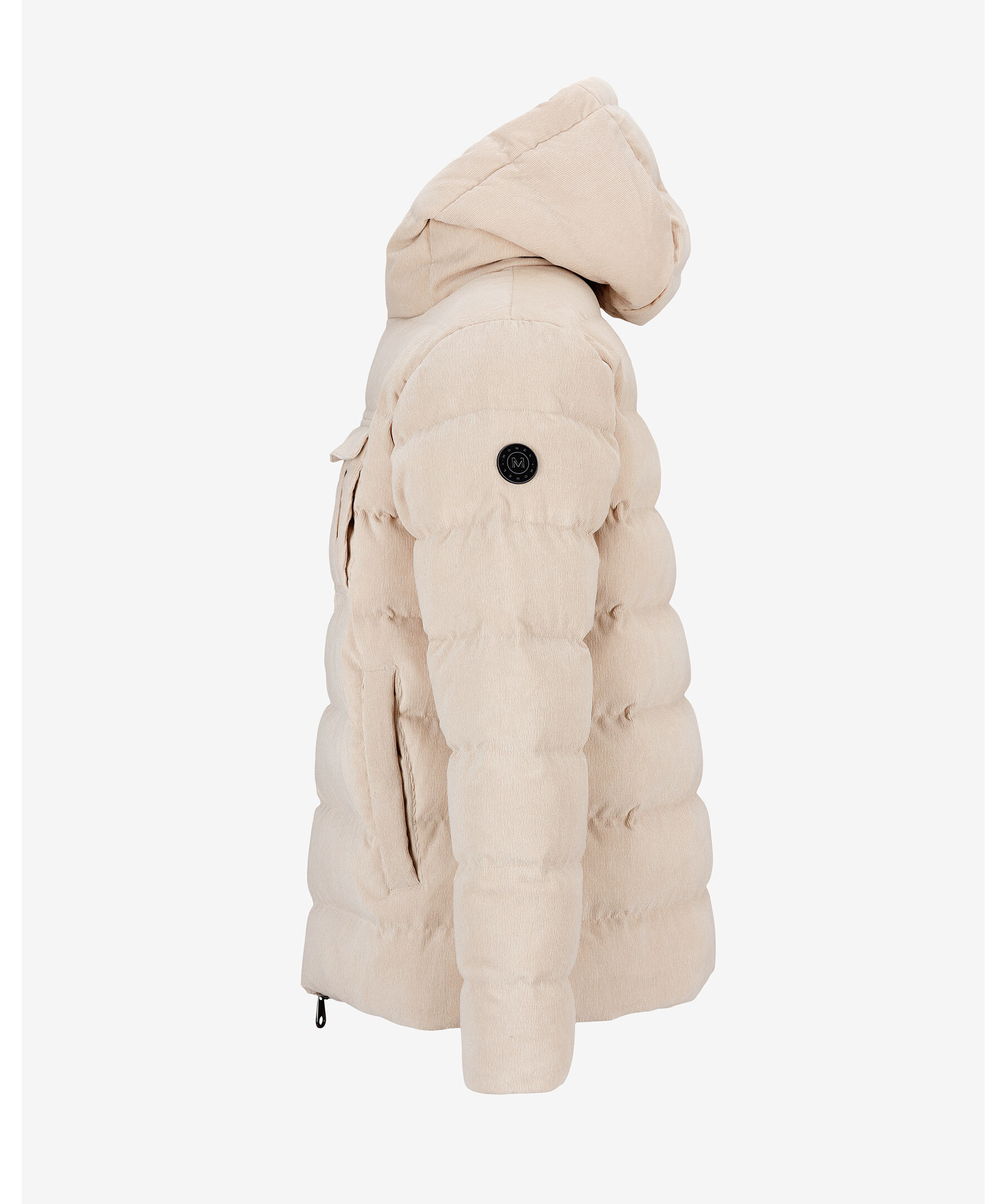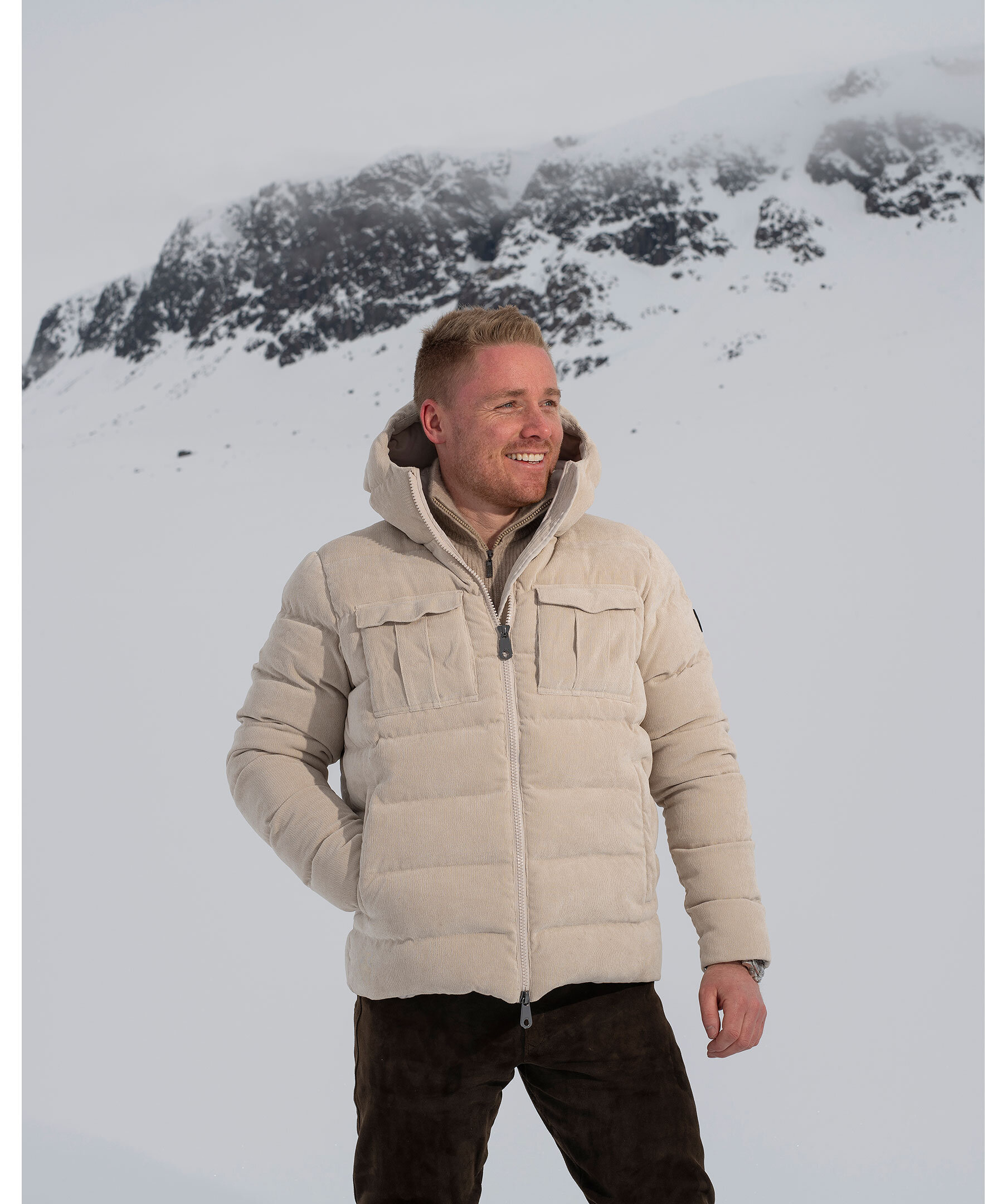 Sandfärgad pufferjacka i manchestertyg från Monel. Jackan stängs med tvåvägsdragkedja och har ett sportigt och dynamiskt uttryck med två bröstfickor, två sidfickor med magnetstängning och en innerficka med dragkedja. Tillverkad i en polyesterblandning med dunfyllning.