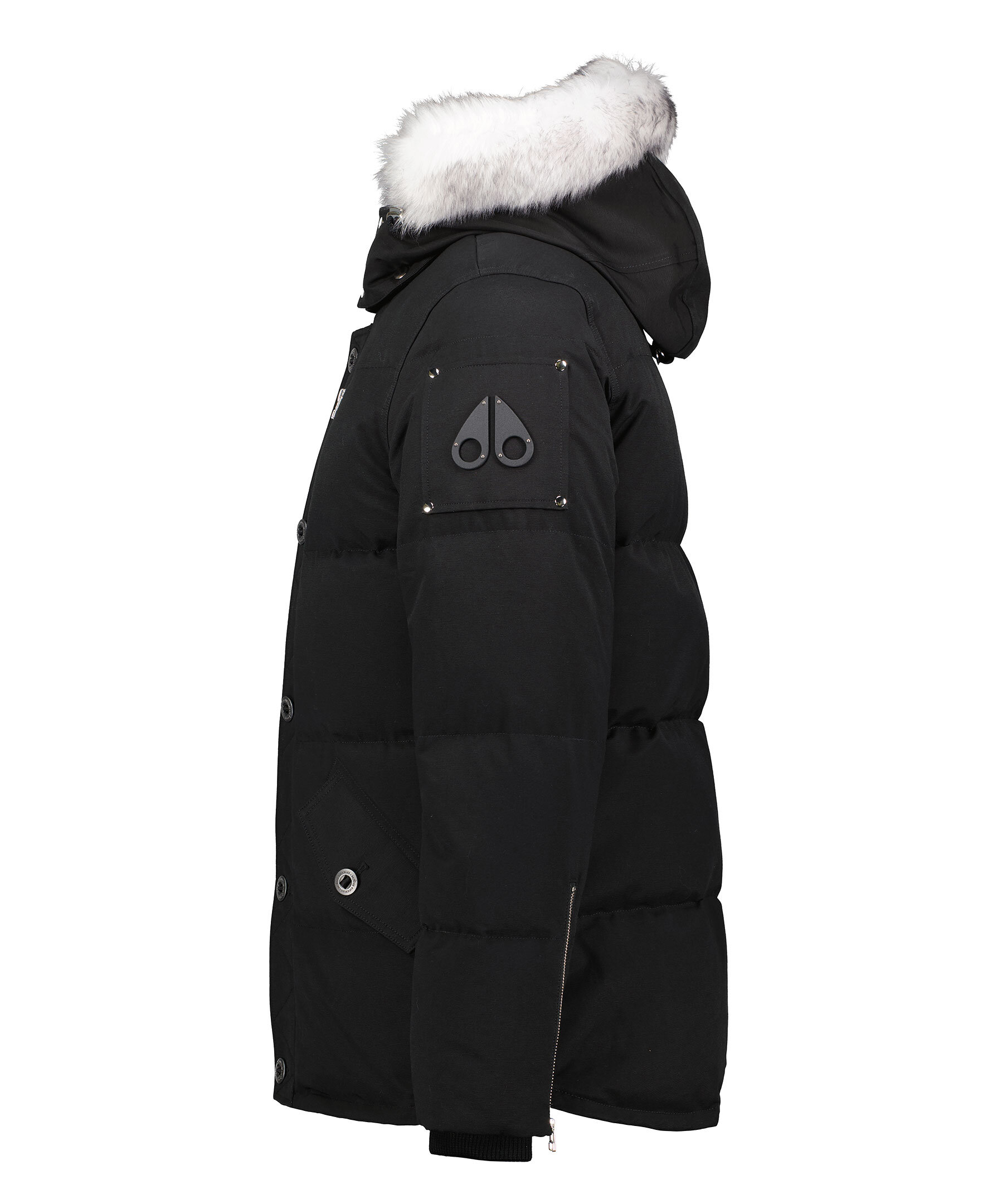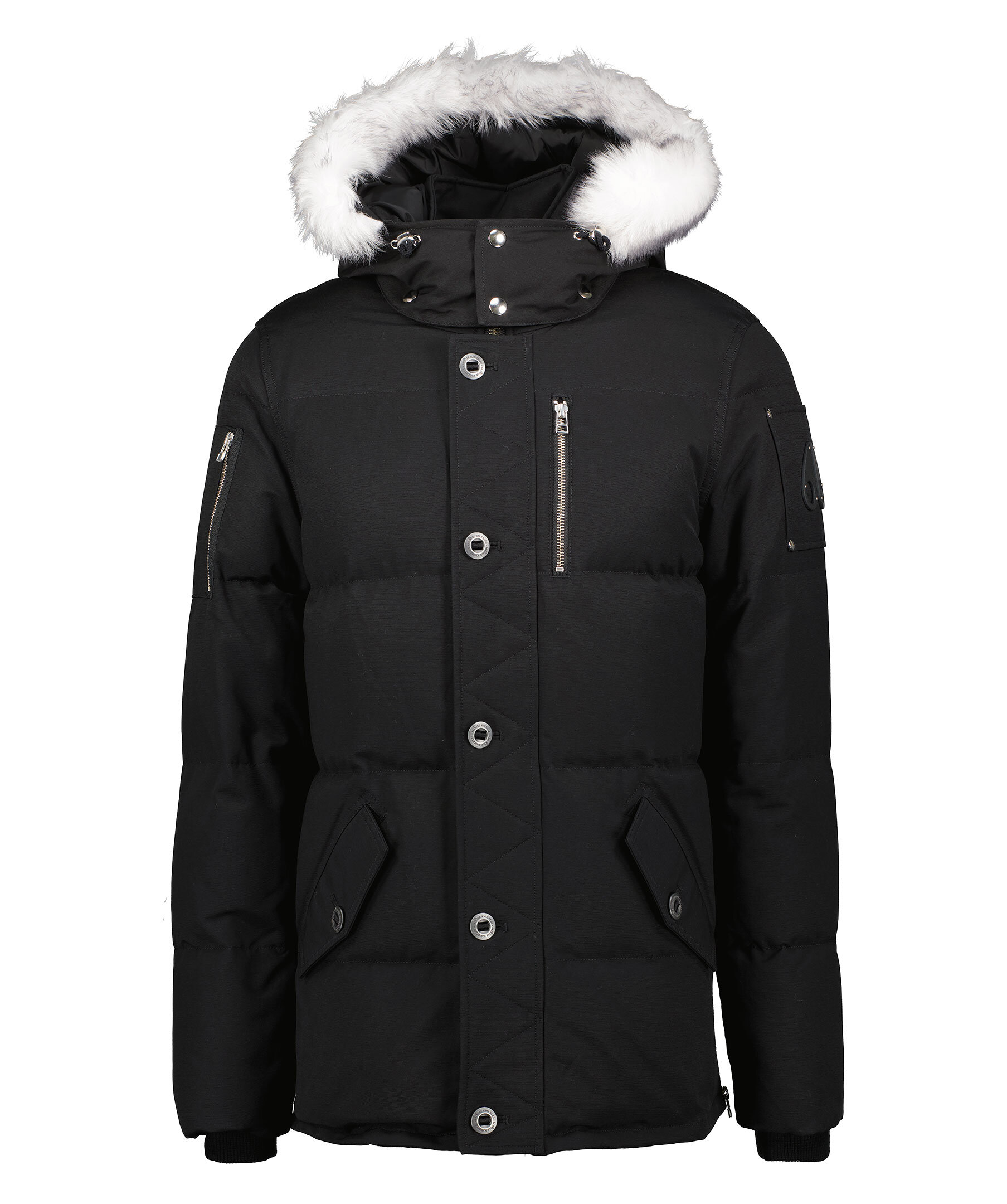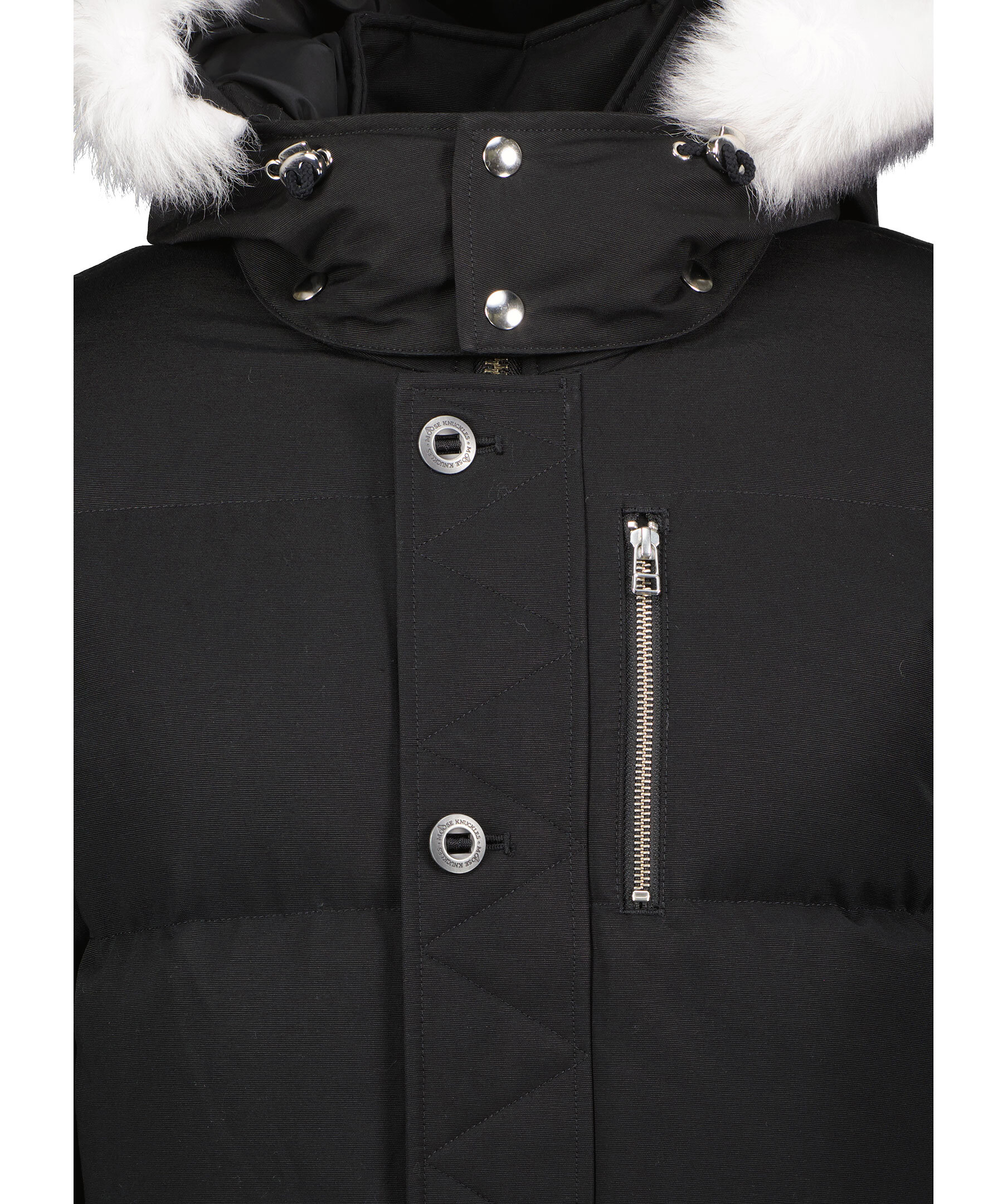 Svart jacka från Moose Knuckles. Skräddarsydd och konstruerad speciellt för att uthärda den extrema kylan i Kanada - True North. Jackan är tillverkad i en nylon och bomulls-blandning och har snap-off huva med fast pälskant och dragsko. Ståkrage, bröstfickor med dragkedjor, mikrofleecefodrade midjefickor med knappstängning. Metall-logotyp på vänster arm. Sidodragkedjor, Rib Knit Storm CuffsNeoshear™ är en shearling utvecklad exklusivt av Moose Knuckles som erbjuder grundläggande värme och skydd utan att förlora sin naturligt silkesmjuka textur efter exponering för väder och vind. Den är Leather Working Group-certifierad i enlighet med djurskydds- och miljöåtgärder.