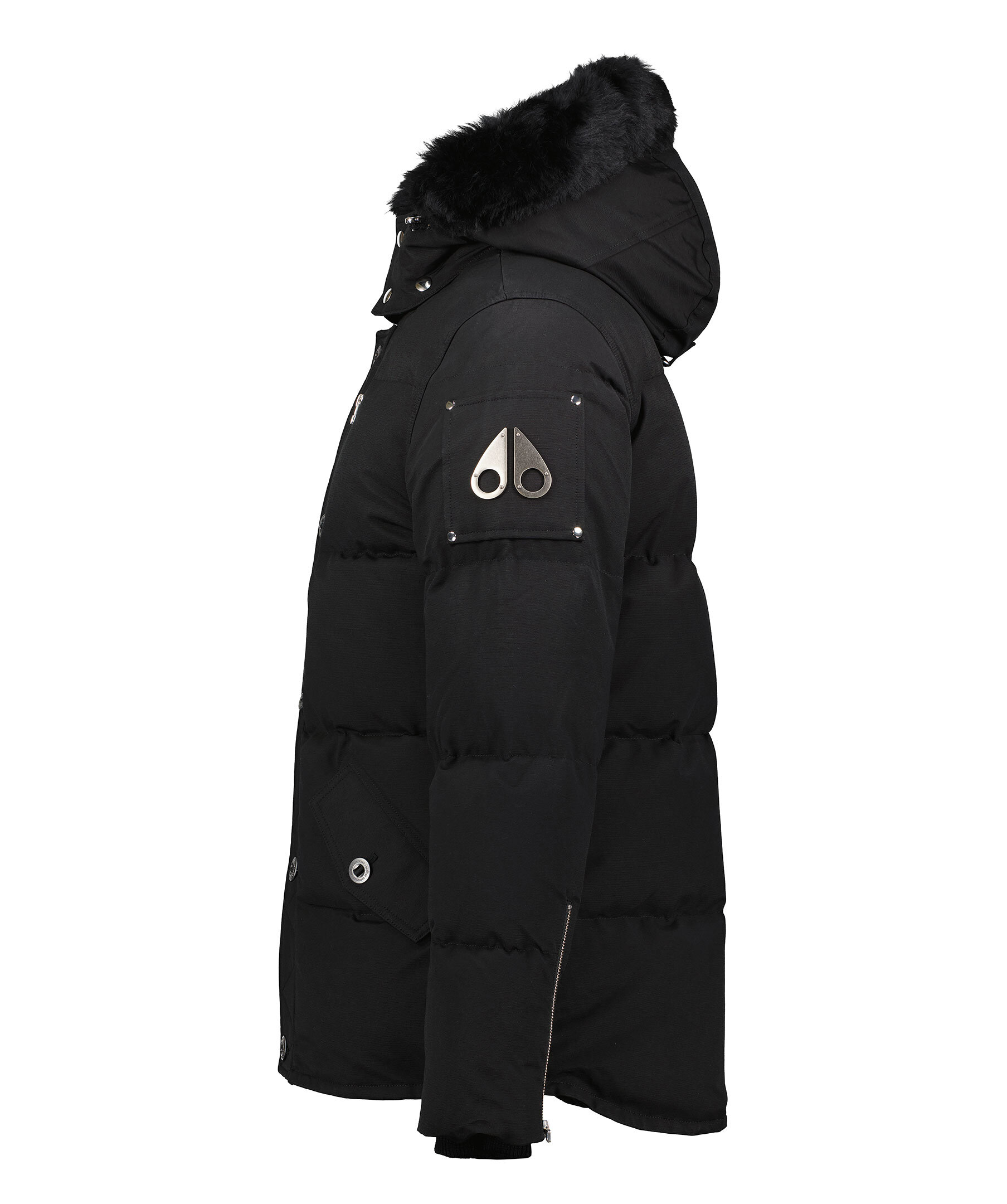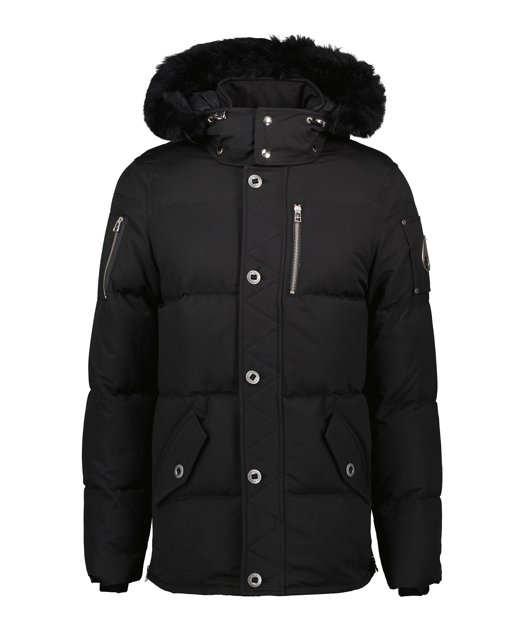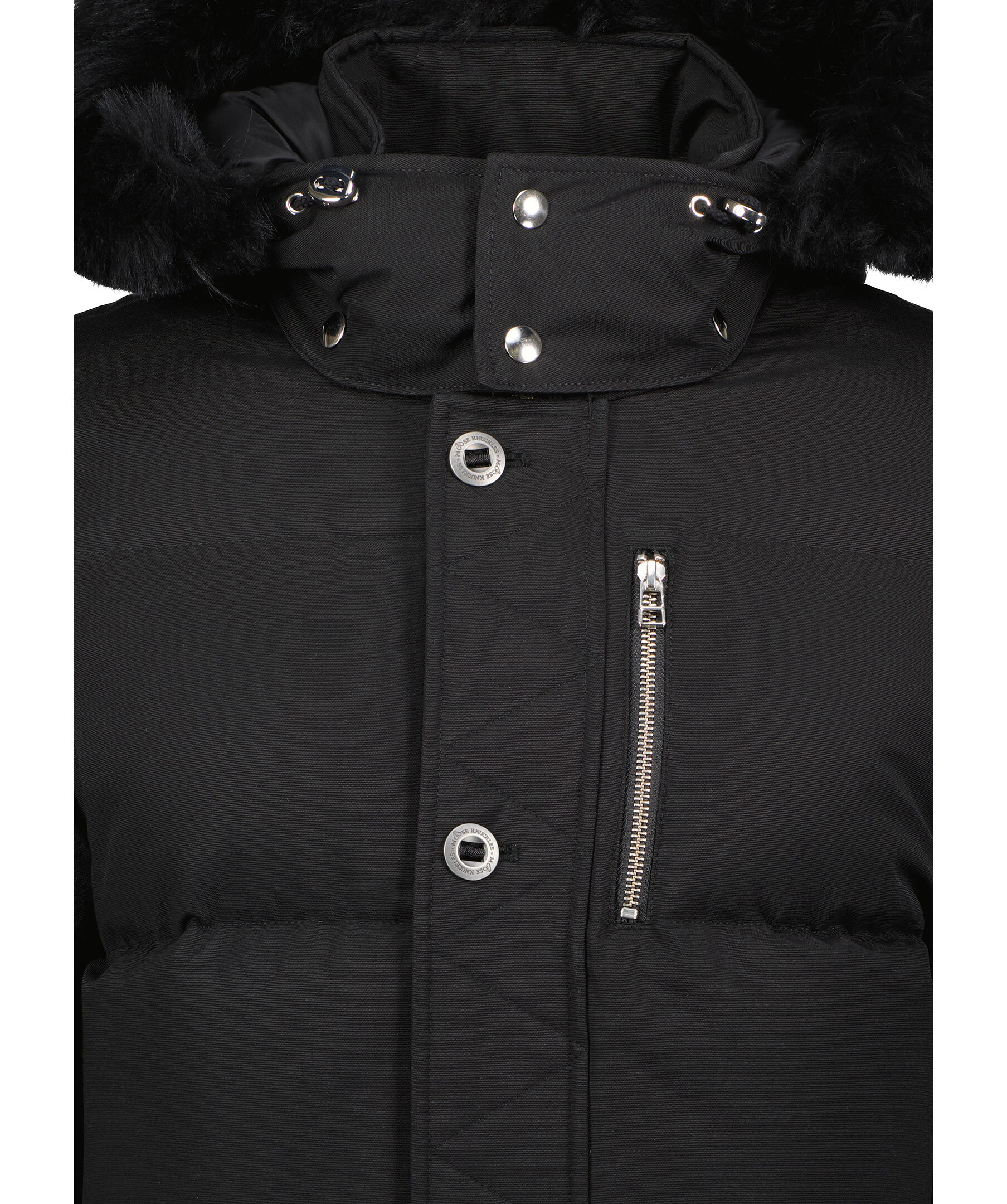 Svart jacka från Moose Knuckles. Skräddarsydd och konstruerad speciellt för att uthärda den extrema kylan i Kanada - True North. Jackan är tillverkad i en nylon och bomulls-blandning och har snap-off huva med fast pälskant och dragsko. Ståkrage, bröstfickor med dragkedjor, mikrofleecefodrade midjefickor med knappstängning. Metall-logotyp på vänster arm. Sidodragkedjor, Rib Knit Storm CuffsNeoshear™ är en shearling utvecklad exklusivt av Moose Knuckles som erbjuder grundläggande värme och skydd utan att förlora sin naturligt silkesmjuka textur efter exponering för väder och vind. Den är Leather Working Group-certifierad i enlighet med djurskydds- och miljöåtgärder.