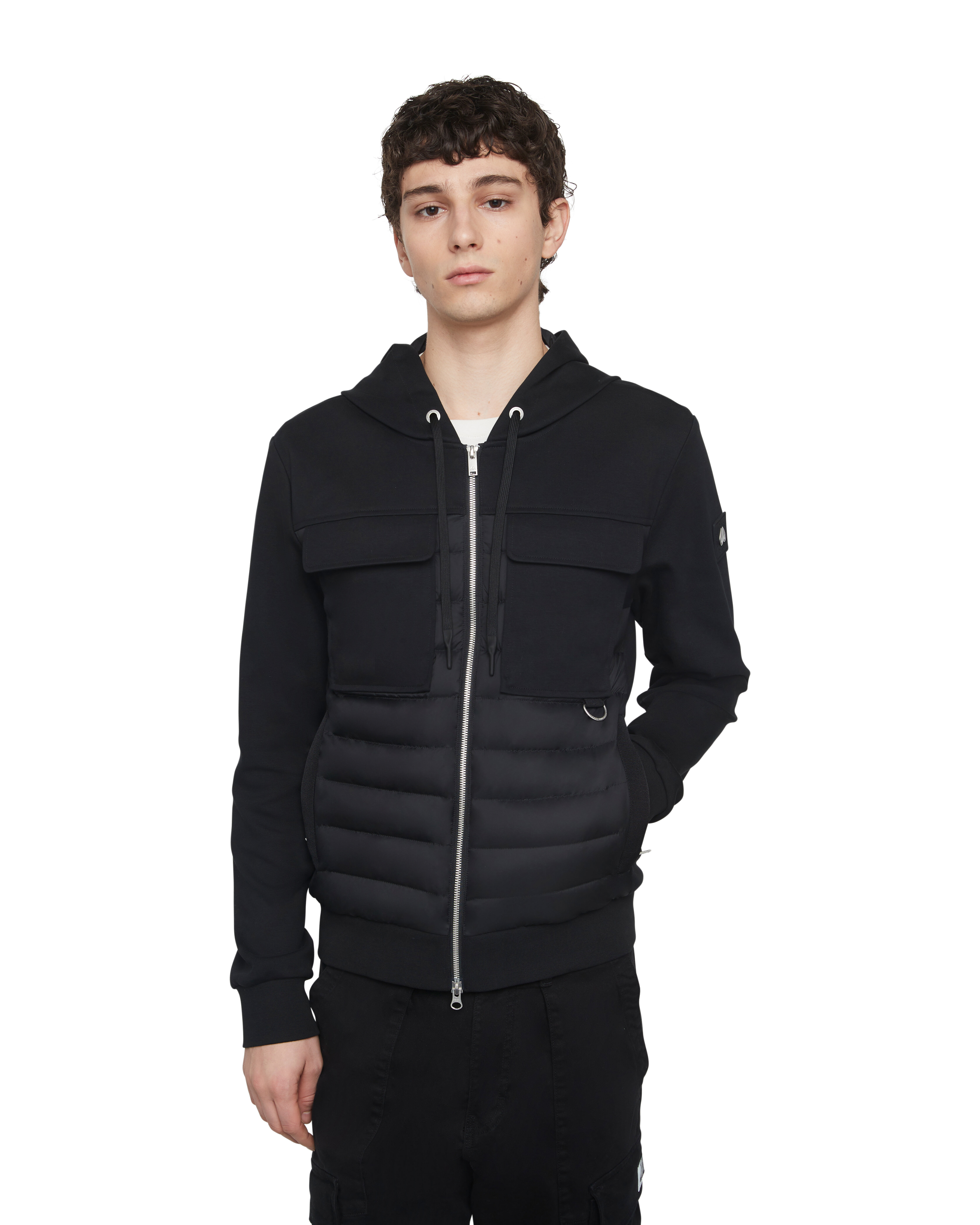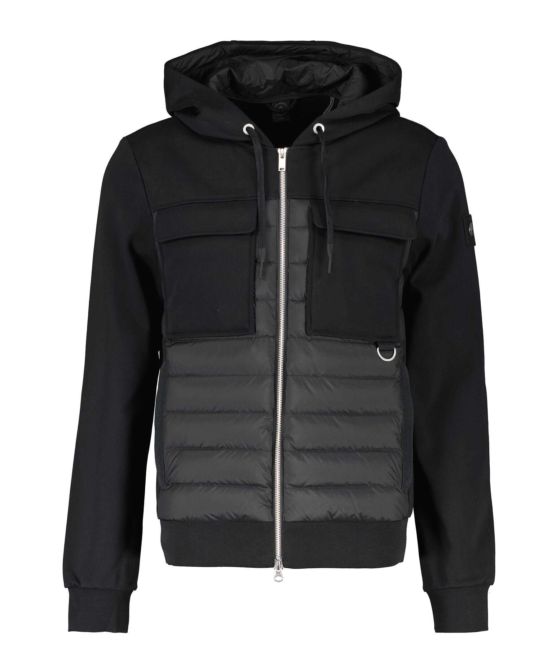 Svart hybridjacka med huva från Moose Knuckles. Stängs med tvåvägsdragkedja, en innerficka med dragkedja, två sidfickor med dragkedja, två patch bröstfickor med lock samt dragsko i huvan. Gummerad logotyp på vänster ärm. Tillverkad i nylon- och bomullsblandning.