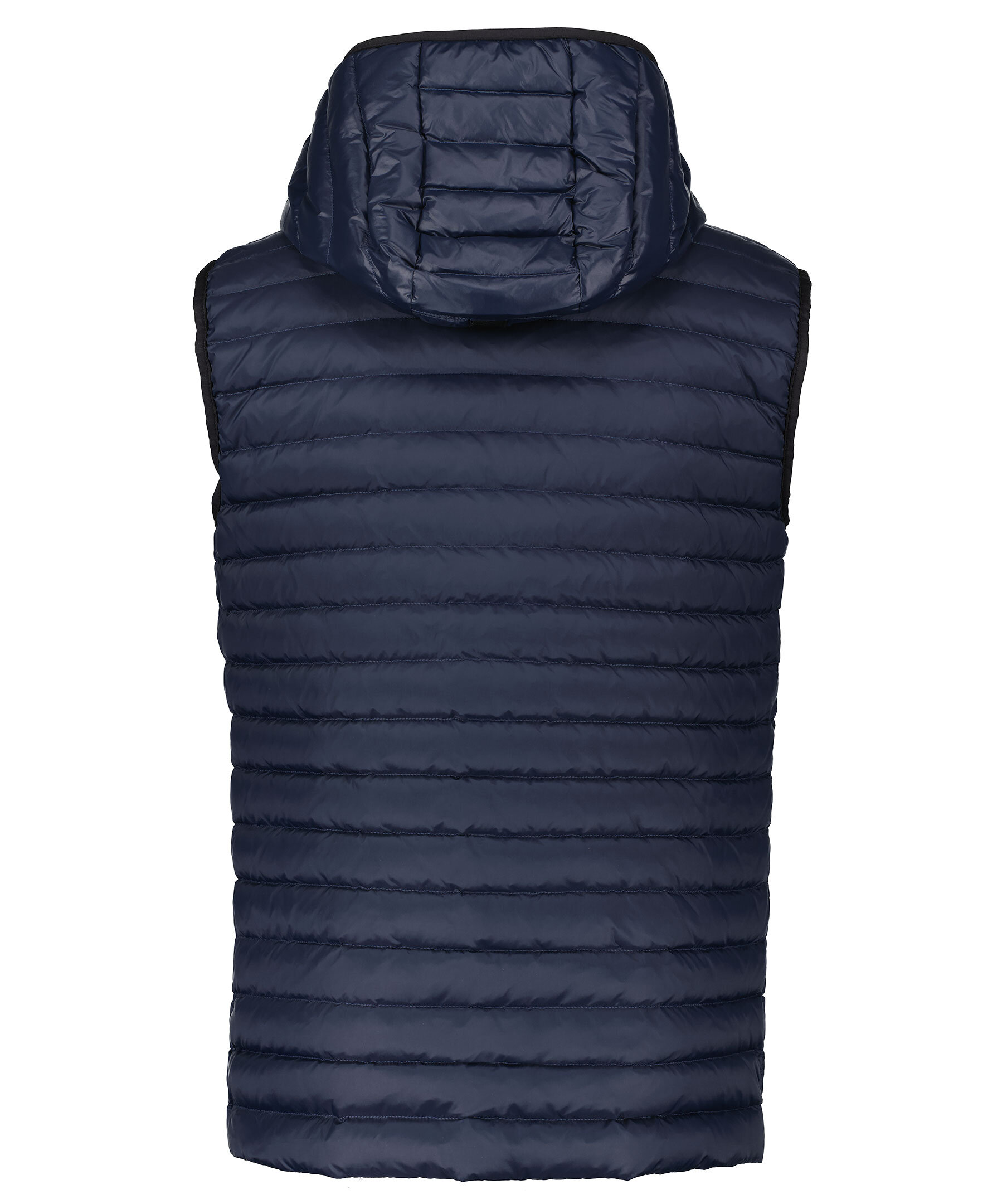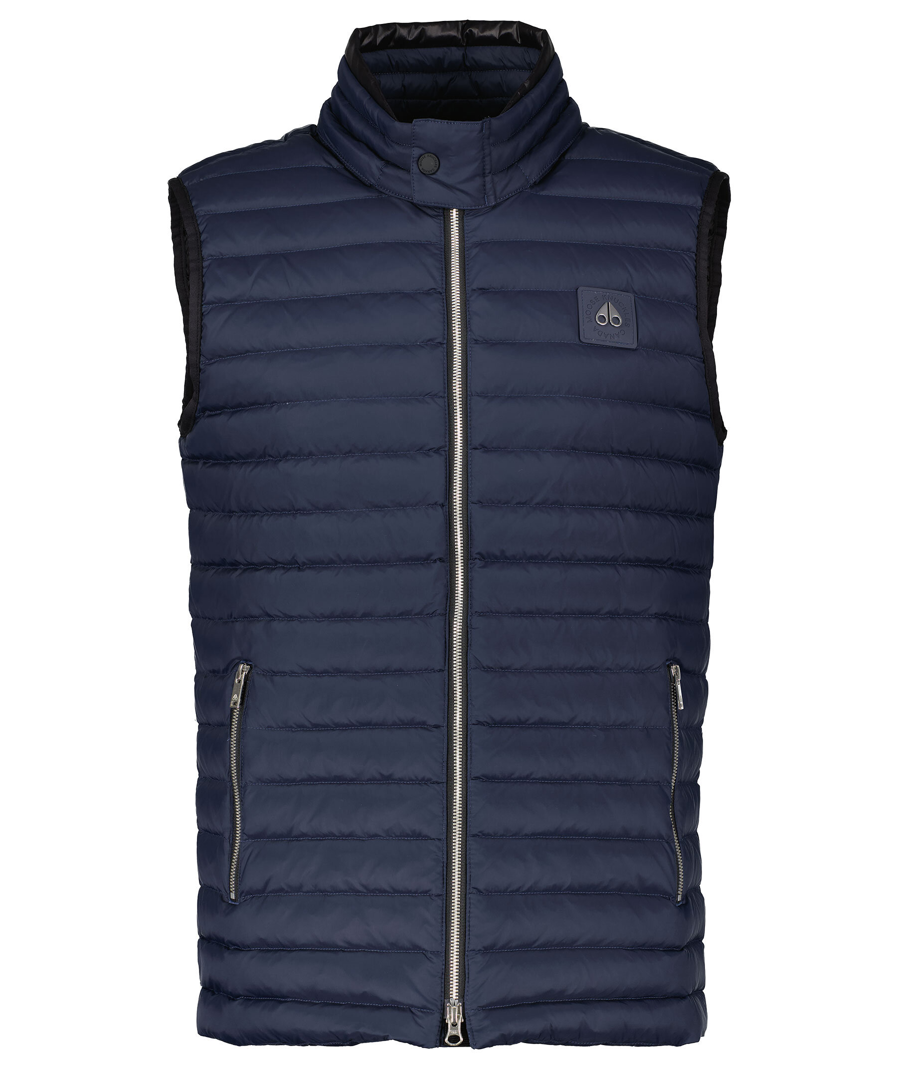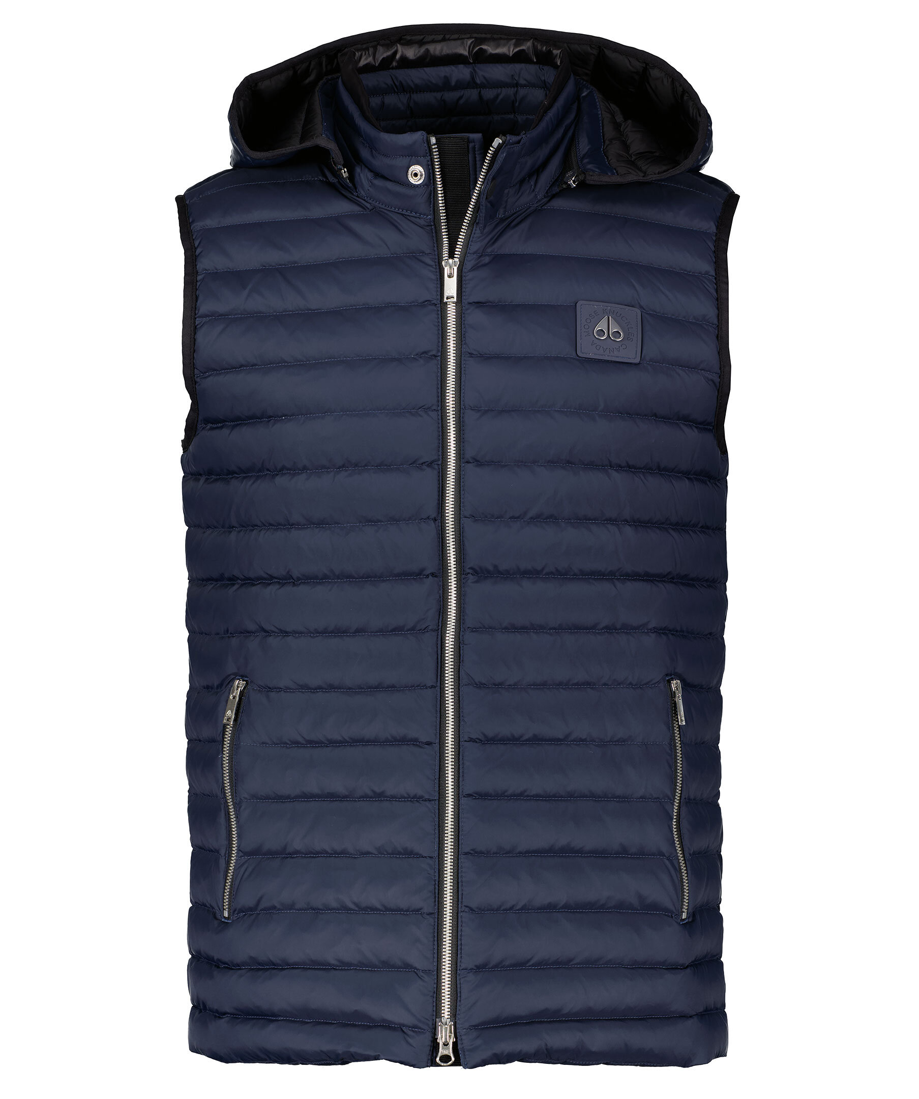 Marinblå, quiltad väst med svart foder och lätt fyllning från Moose Knuckles. Vattenavvisande och vind resistent. Rak passform, avtagbar luva med dragkedja och en kort krage. Patch i gummi med logotyp i silverfärgad metall på vänster sida på bröstet. Silverfärgad dragkedja fram, två framfickor med dragkedja i midjan och en innerficka med dragkedja.