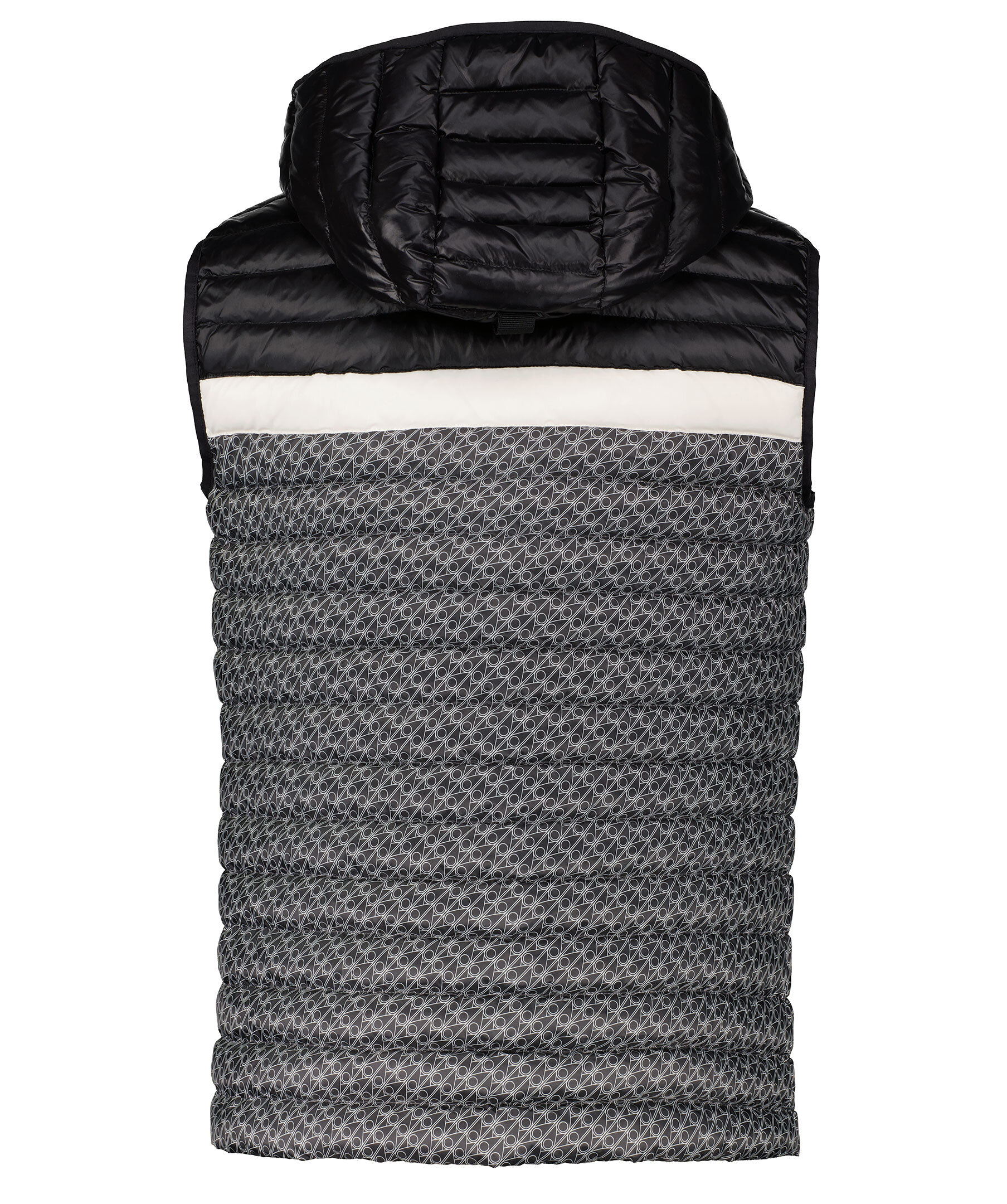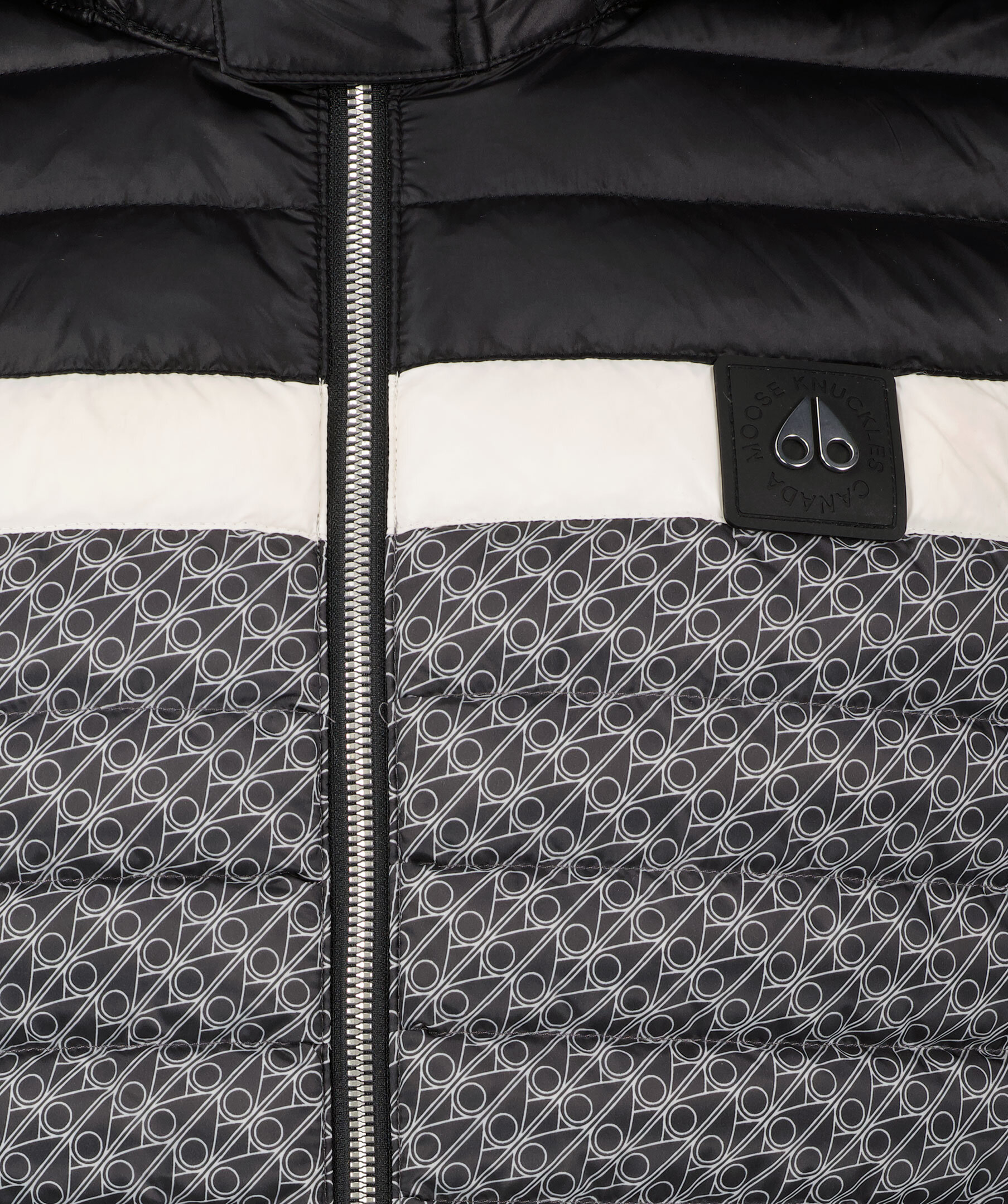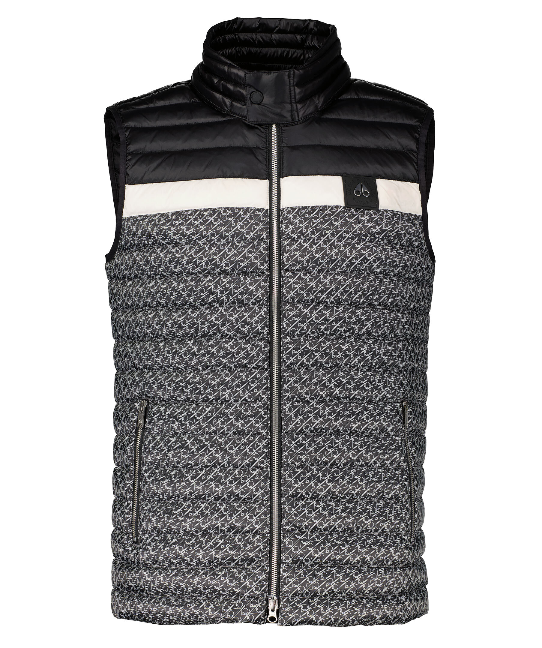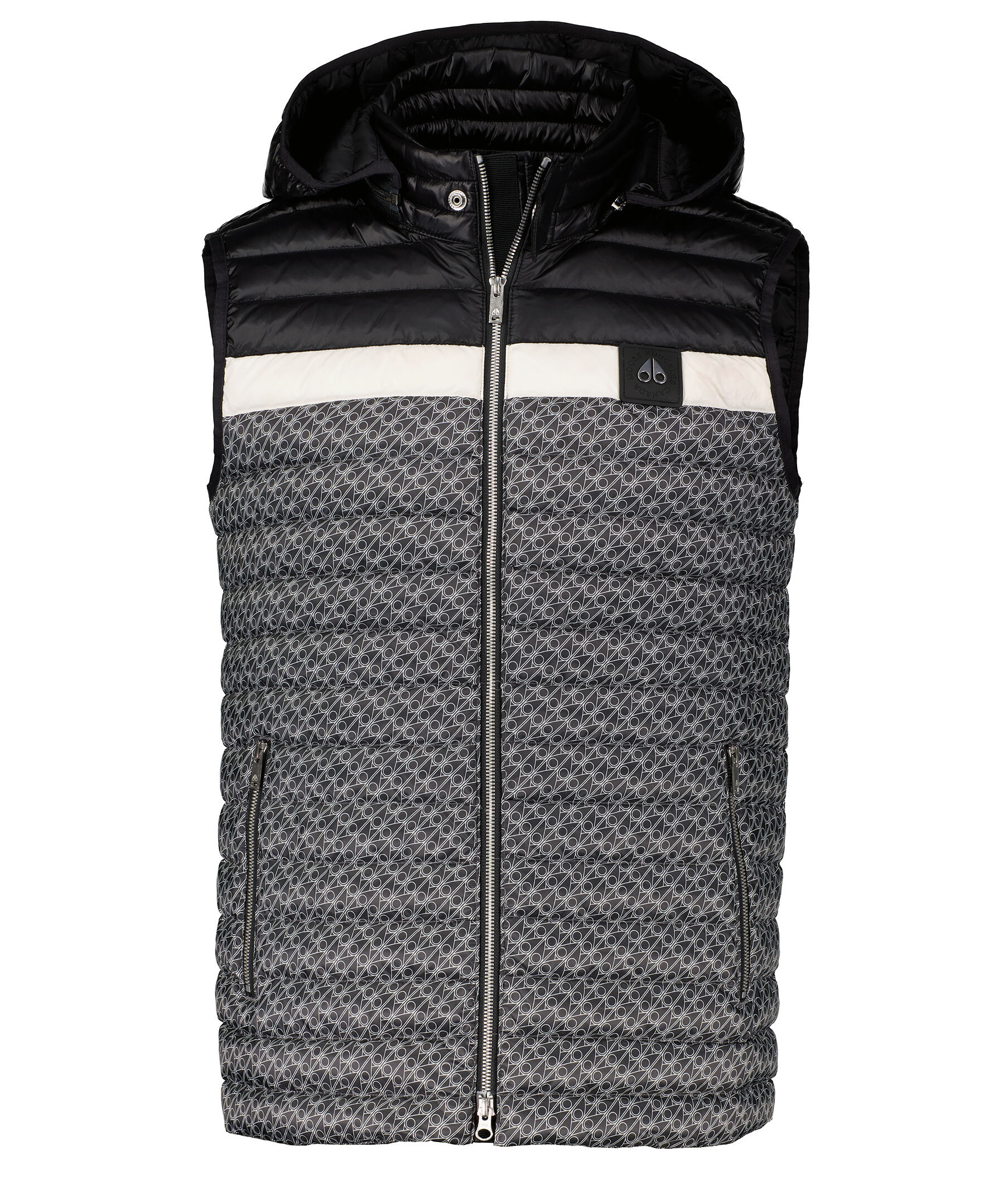 Mönstrad, quiltad väst med lätt fyllning från Moose Knuckles. Mönster med logotypmonogram över större delen av västen och överdel i svart med en vit rand som avgränsar mönstret mot det svarta. Vatten avvisande och vind resistent. Rak passform, avtagbar luva med dragkedja och en kort krage. Patch i gummi med logotyp i silverfärgad metall på vänster sida på bröstet. Silverfärgad dragkedja fram, två framfickor med dragkedja i midjan och en innerficka med dragkedja.