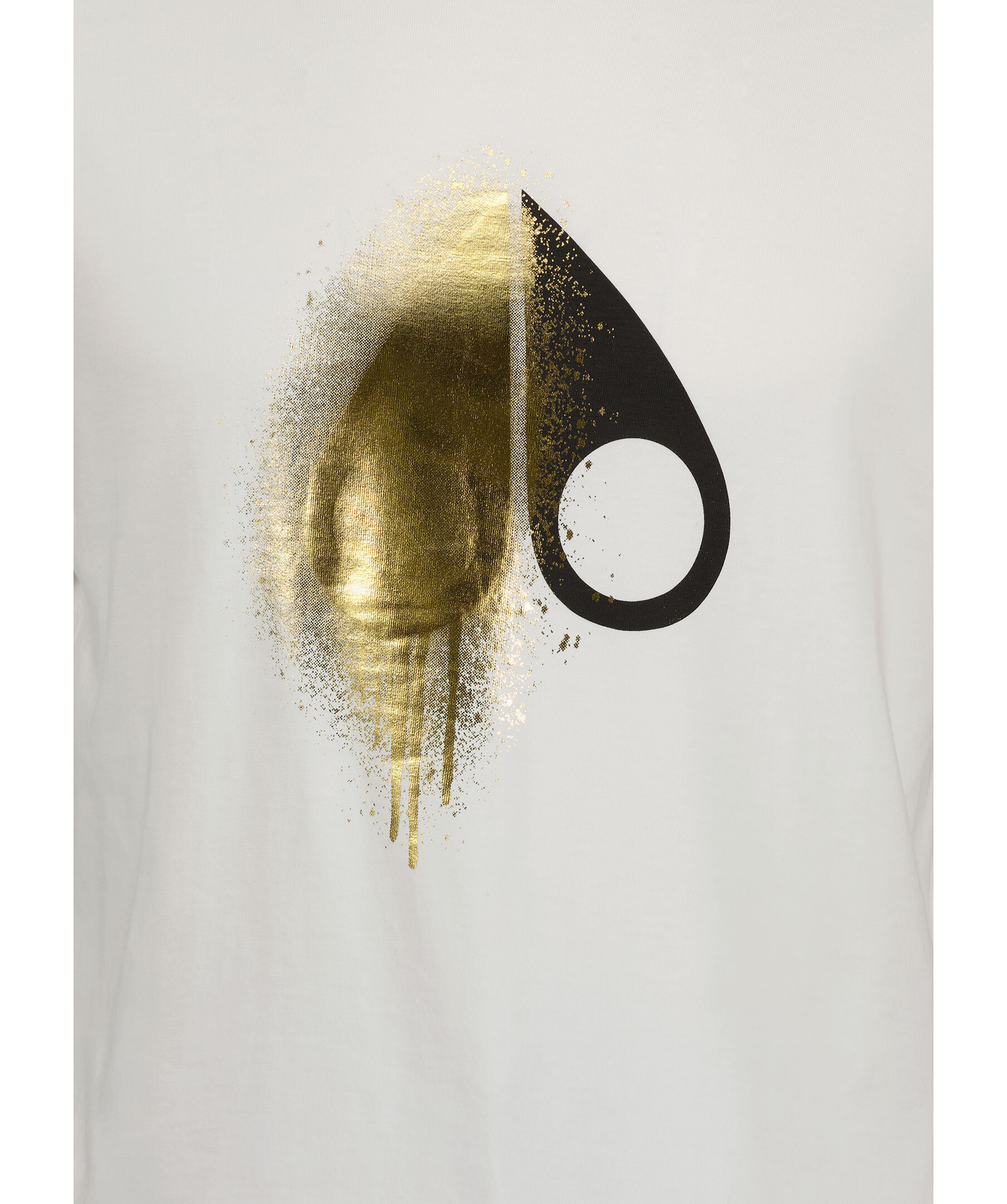 Vit t-shirt från Moose Knuckles. T-shirten har rundad halsringning och ett stort, svart och guldfärgat logotyptryck på framsidan. Tillverkad i bomull.