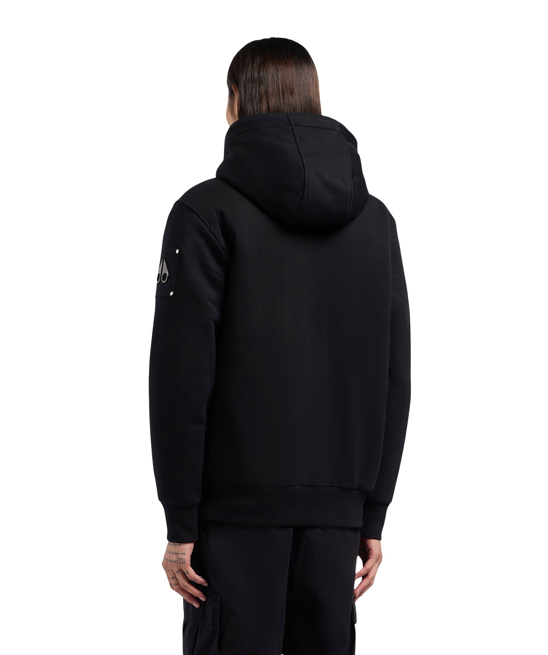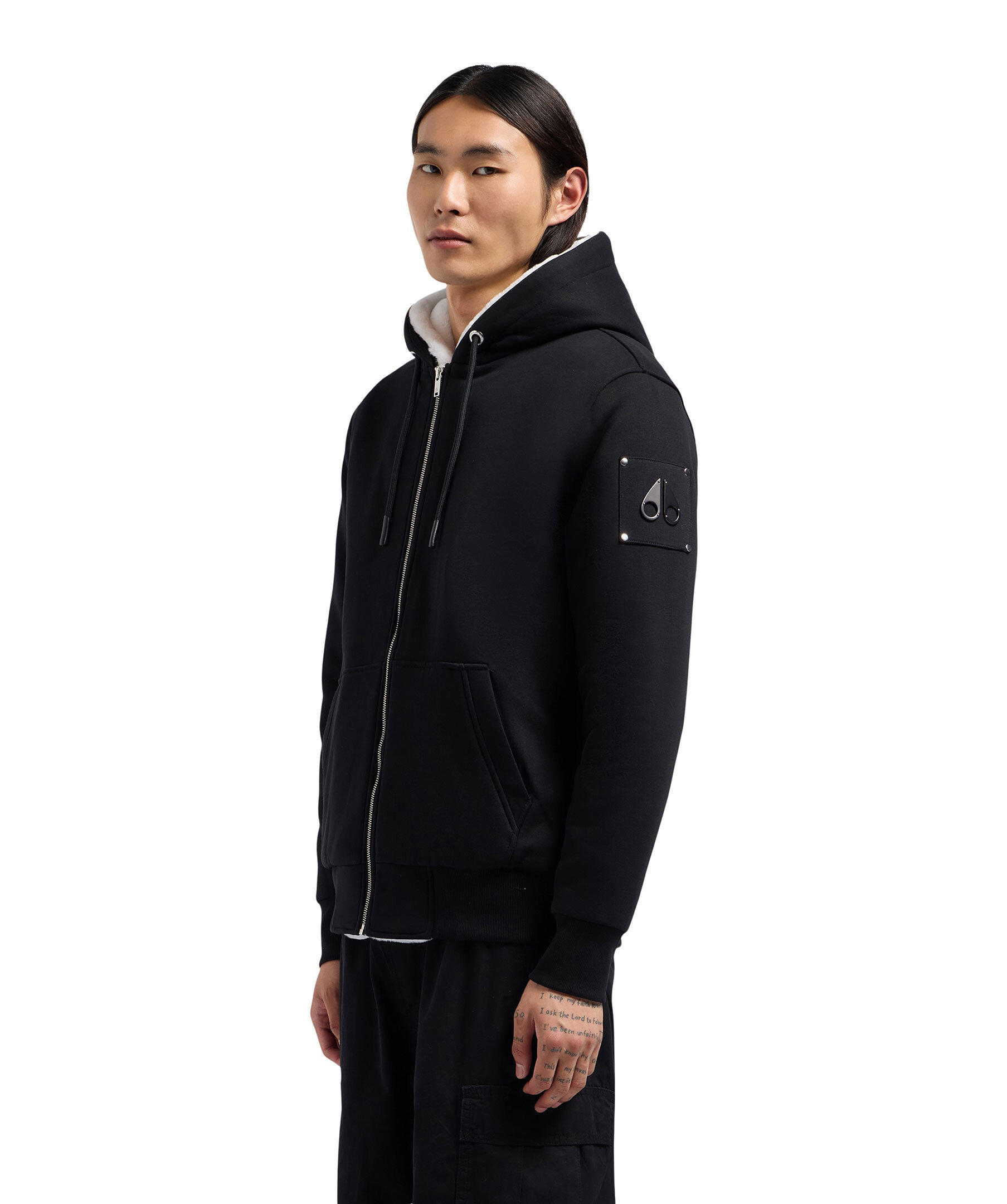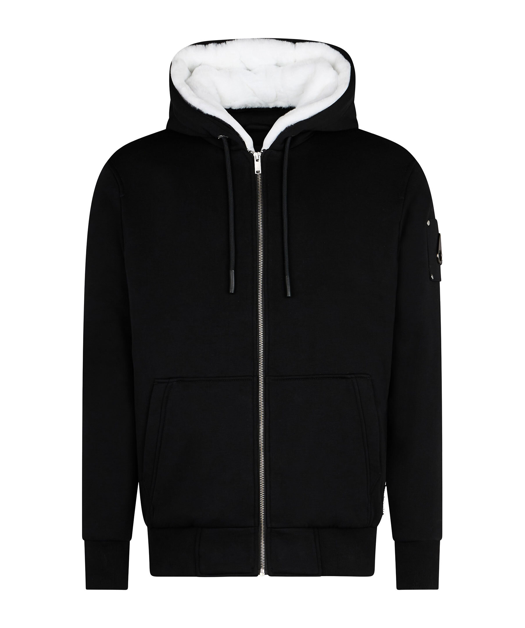 Svart fodrad hoodie från Moose Knuckles. Stängs framtill med dragkedja. Luva med dragsko och vitt avtagbart foder i konstpäls. Ficka på magen. Patch och logotyp i metall på vänster ärm. Ribbstickad mudd vid ärm- och plaggslut.