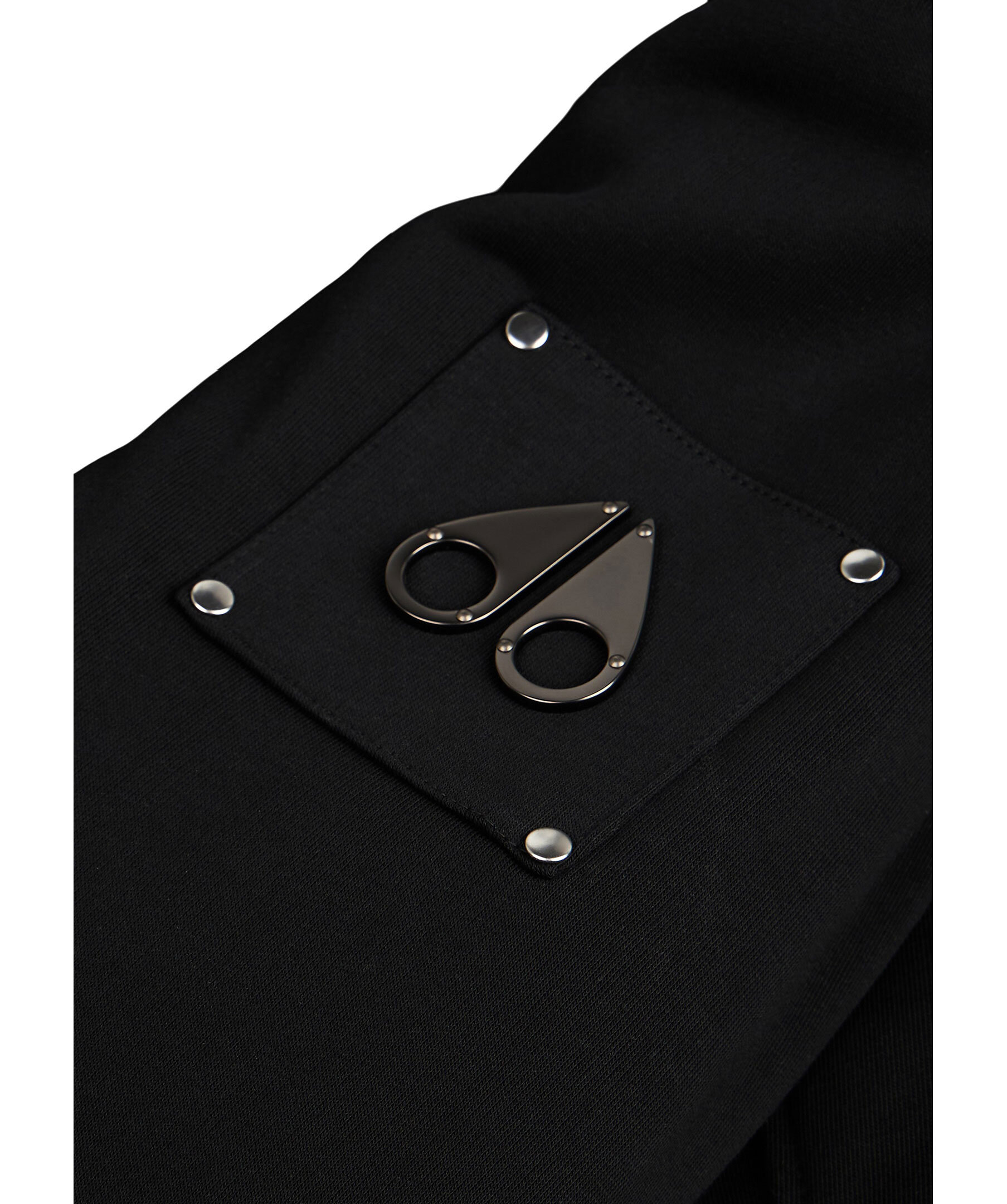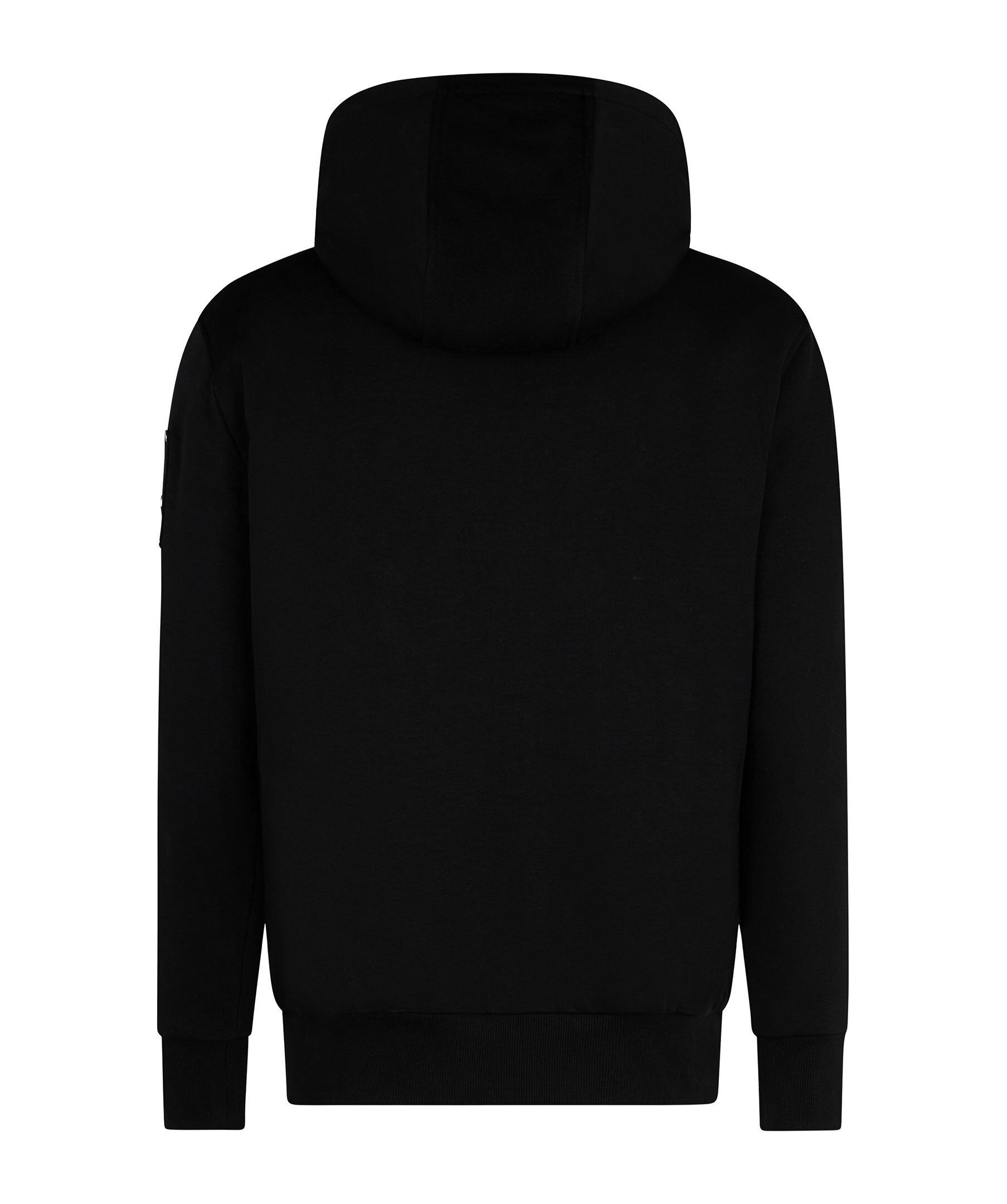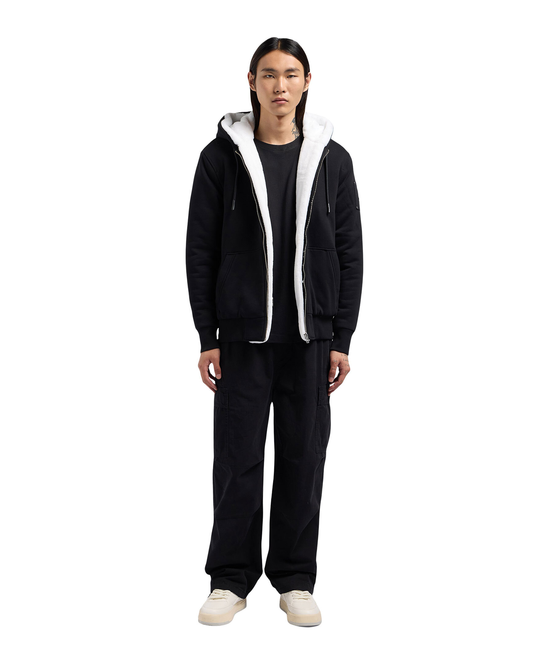 Svart fodrad hoodie från Moose Knuckles. Stängs framtill med dragkedja. Luva med dragsko och vitt avtagbart foder i konstpäls. Ficka på magen. Patch och logotyp i metall på vänster ärm. Ribbstickad mudd vid ärm- och plaggslut.