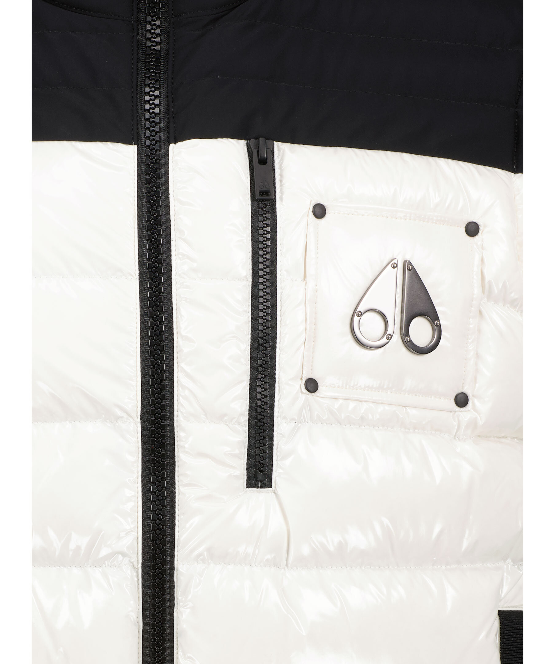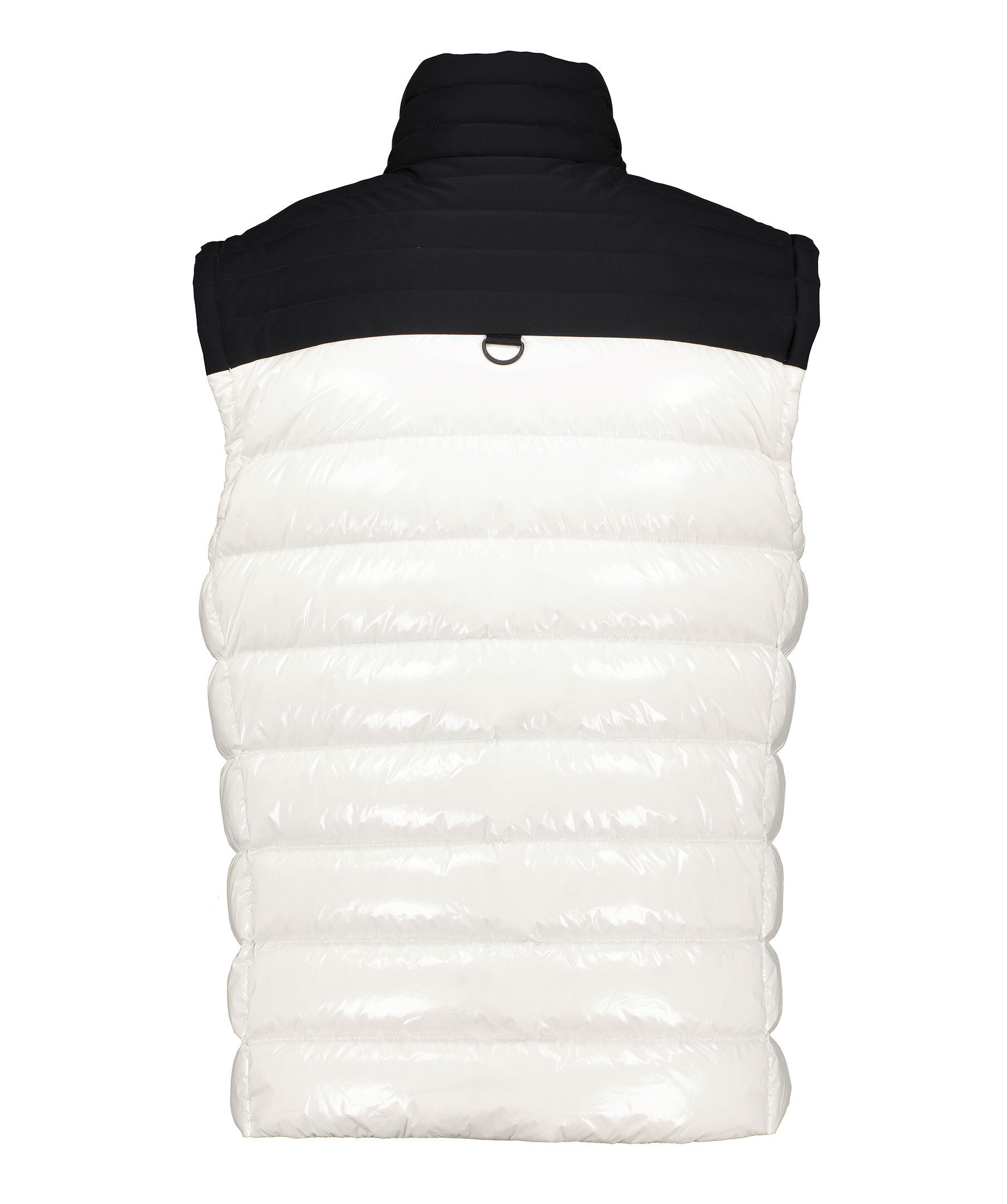 Vit glansig väst från Moose Knuckles. Svart, matt vävt tyg över axlarna framtill och bak. Stängs framtill med tvåvägsdragkedja. Två fickor framtill som stängs med dragkedja. Bröstficka på vänster sida som stängs med dragkedja. Gummerad patch med logotyp i metall på vänster bröst.
