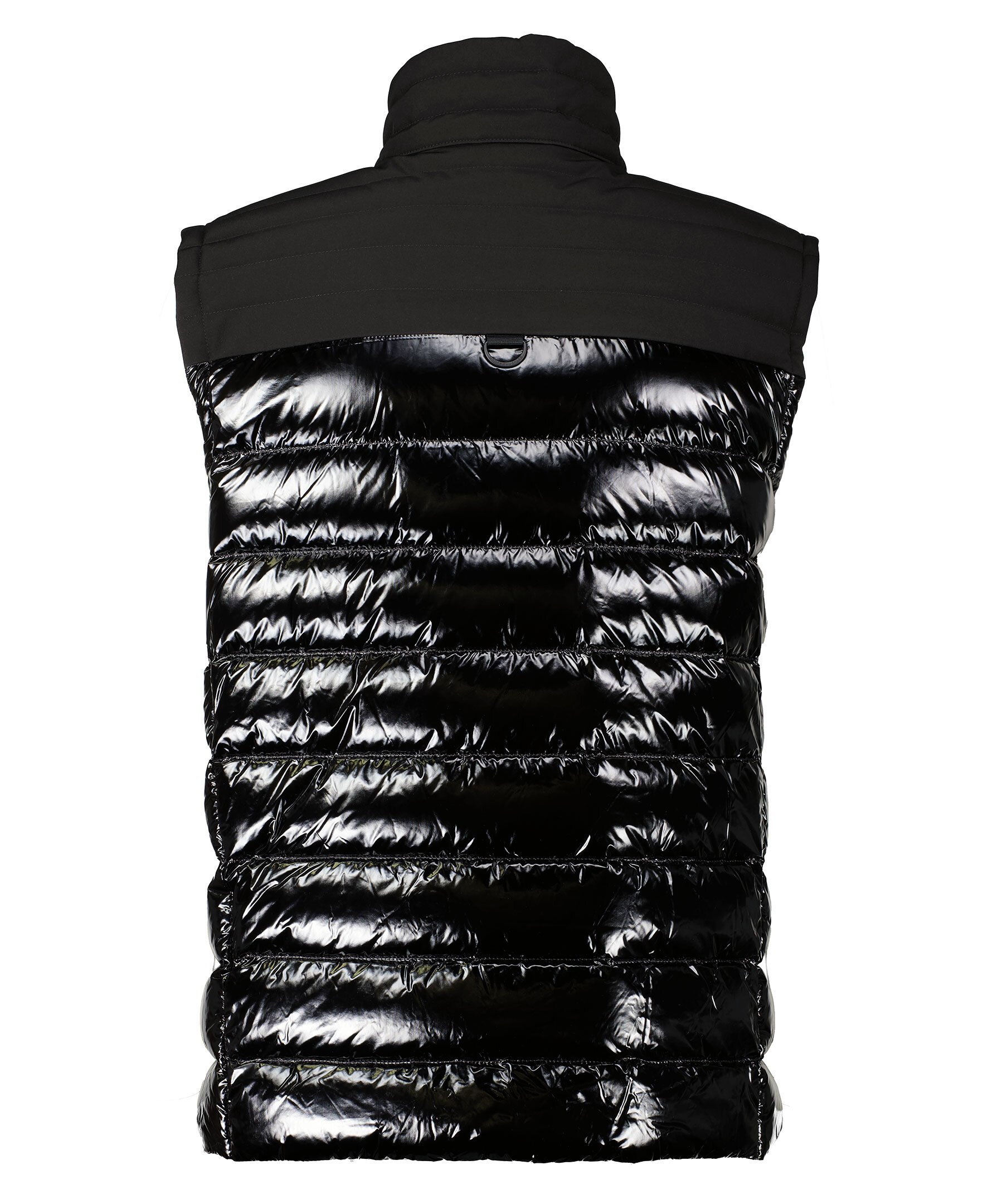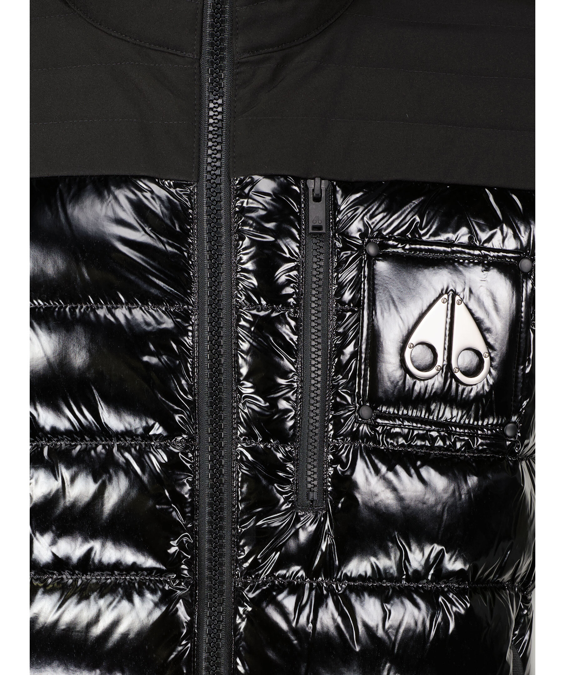 Svart Glansig väst från Moose Knuckles. Matt vävt tyg över axlarna framtill och bak. Stängs framtill med tvåvägsdragkedja. Två fickor framtill som stängs med dragkedja. Bröstficka på vänster sida som stängs med dragkedja. Gummerad patch med logotyp i metall på vänster bröst.