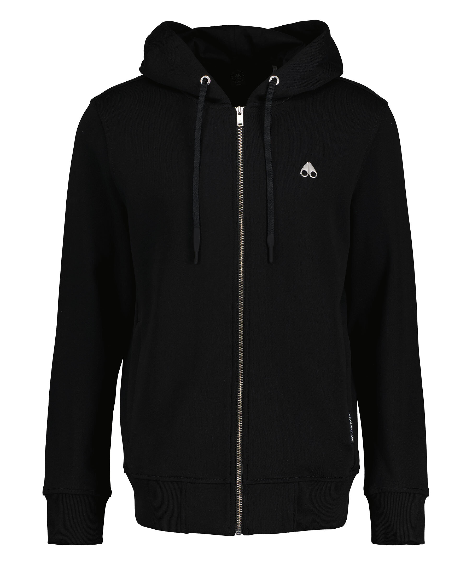 Svart zip tröja från Moose Knuckles. Silverfärgad logotyp på bröstet i metall, fickor med dragkedjor framtill, muddar i ärmslut.