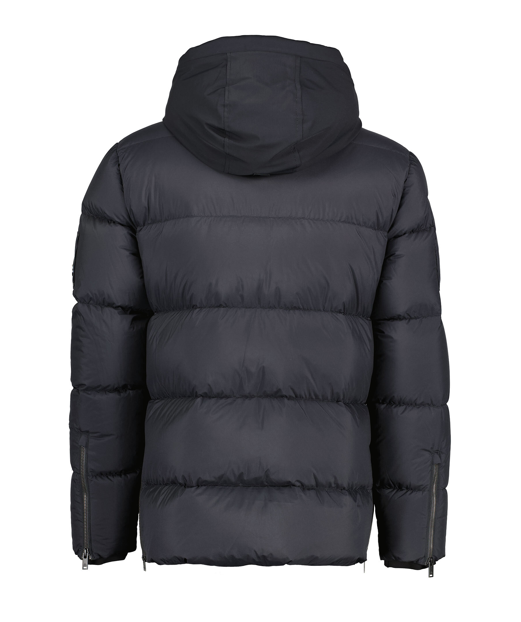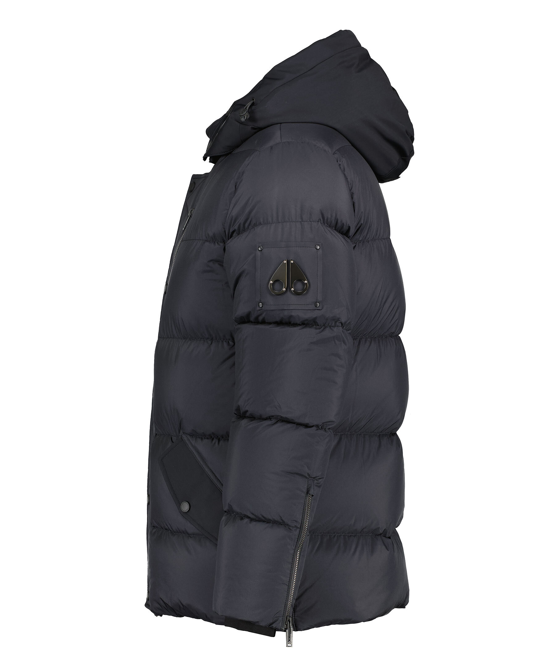 Svart pufferjacka med en avtagbar huva från Moose Knuckles. Jackan stängs med dold tvåvägsdragkedja och tryckknappar framtill och har två sidfickor med tryckknapp, en bröstficka med dragkedja och en ficka på höger ärm med dragkedja. Patch med metall-logotyp på vänster ärm. Dragsko i huvan. Tillverkad i en nylonblandning.