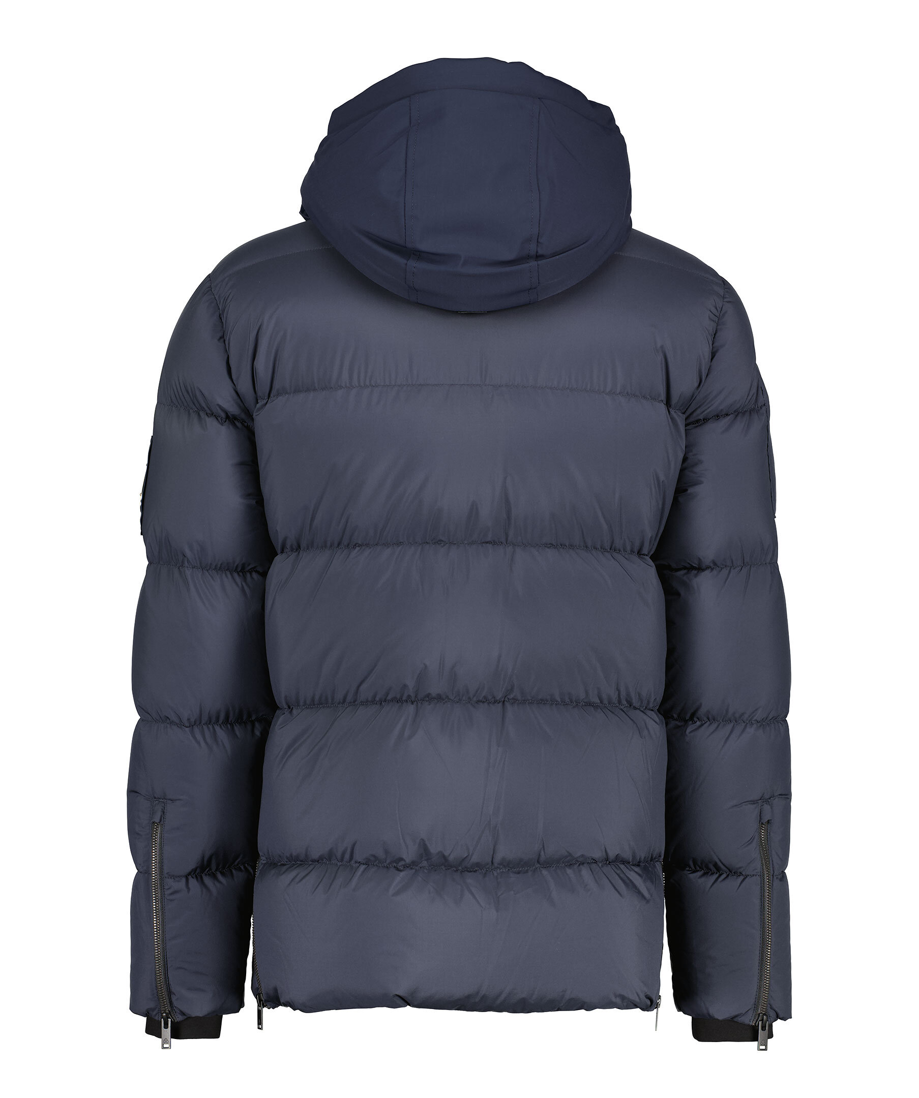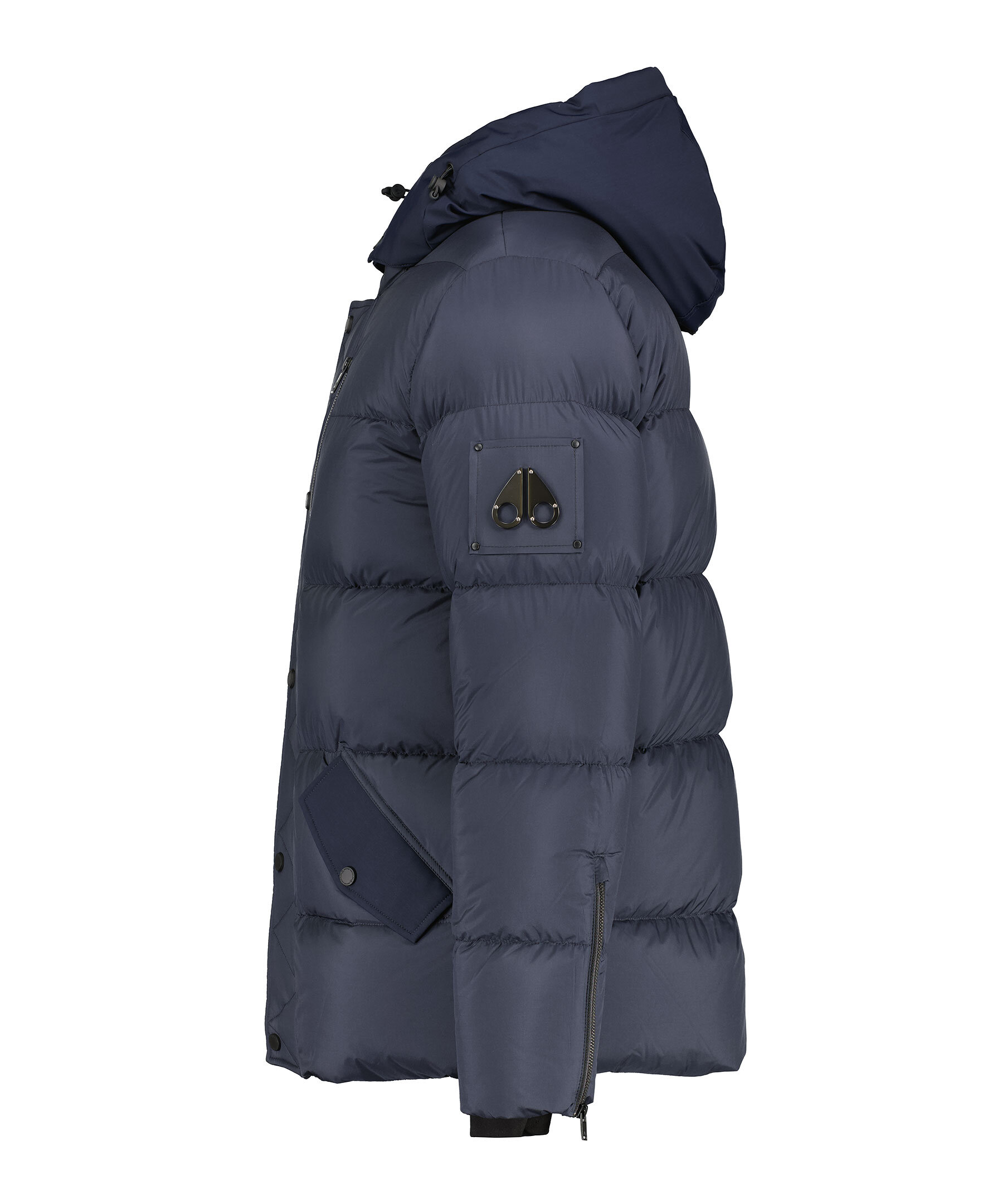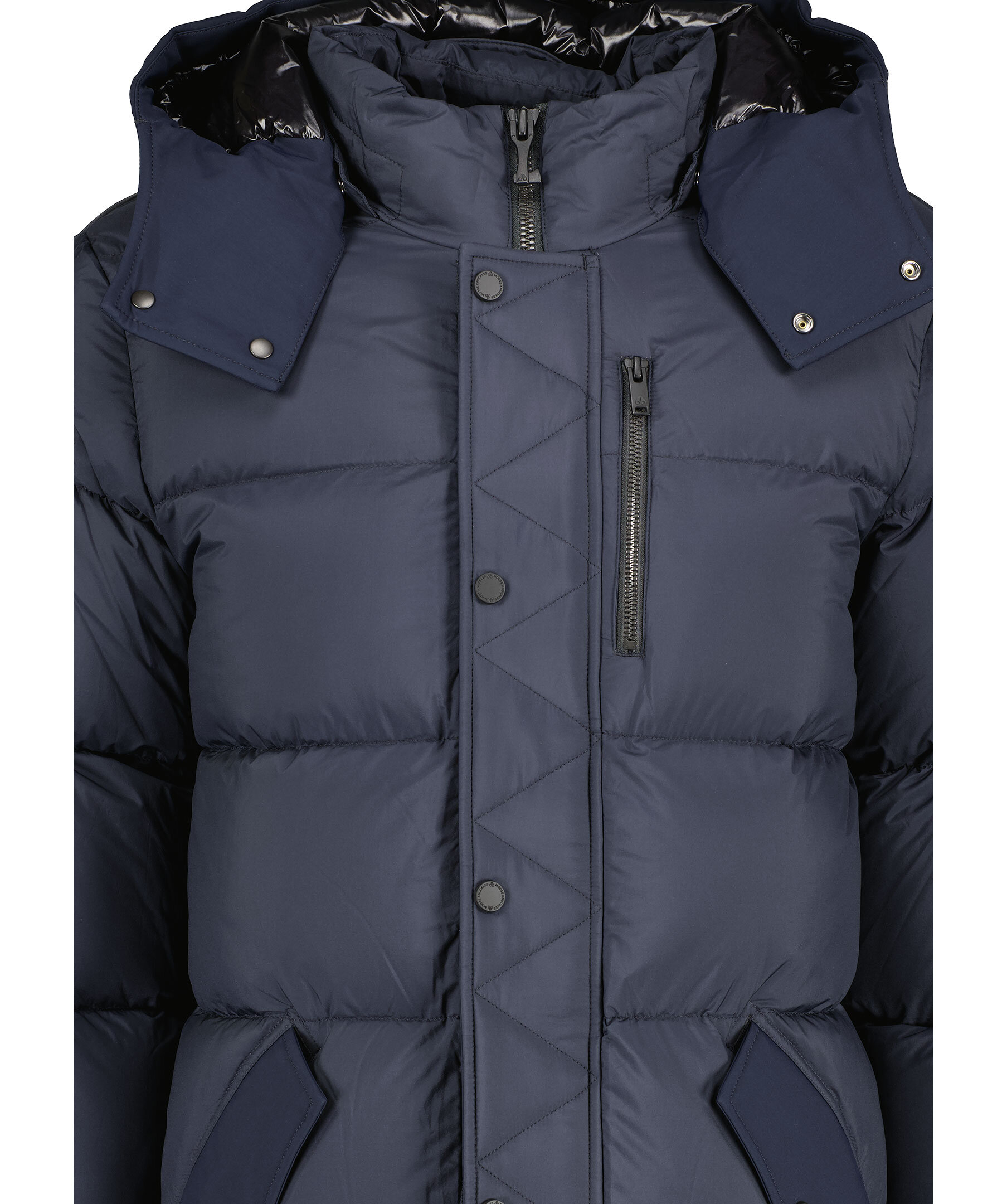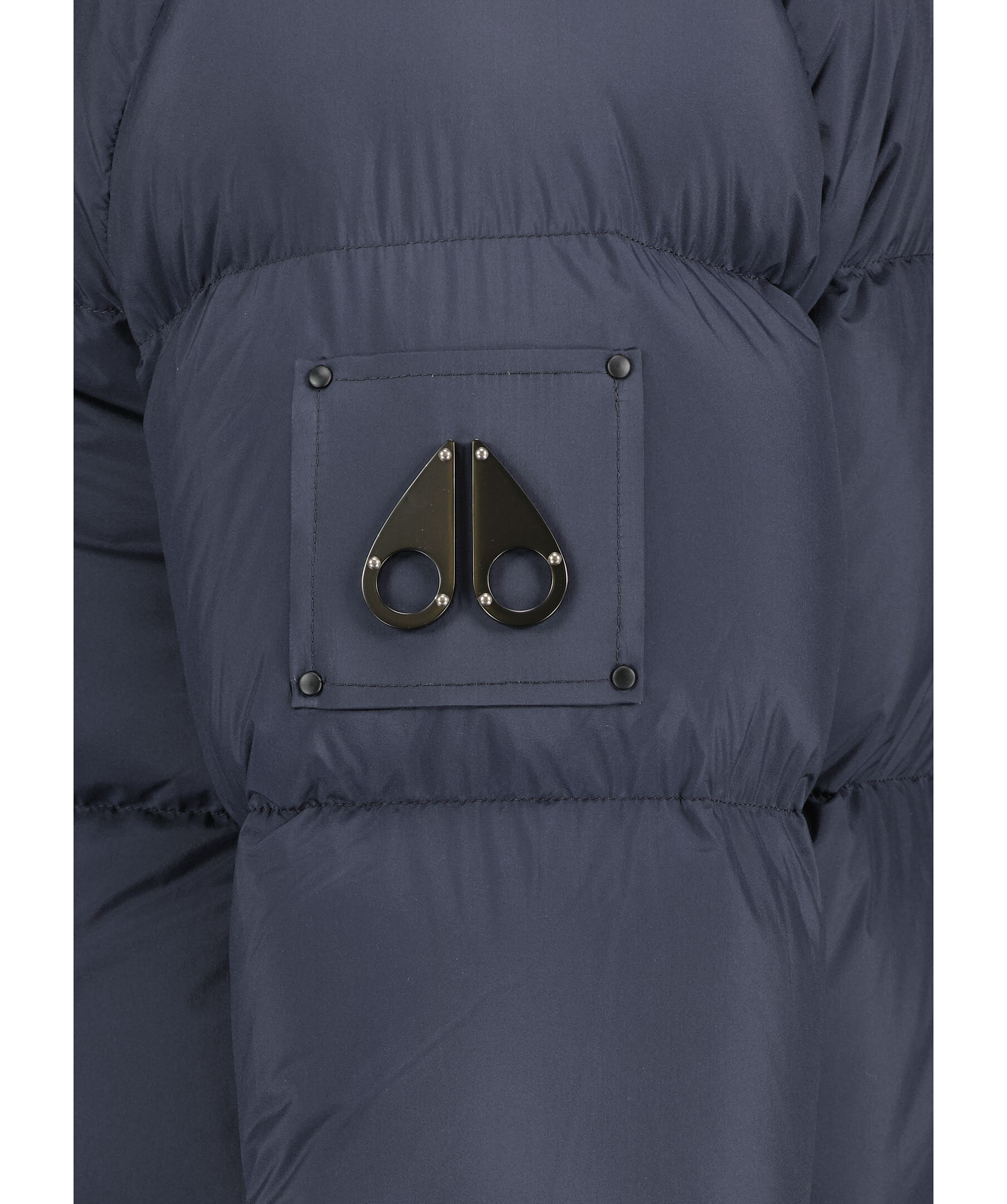 Marinblå pufferjacka med en avtagbar huva från Moose Knuckles. Jackan stängs med dold tvåvägsdragkedja och tryckknappar framtill och har två sidfickor med tryckknapp, en bröstficka med dragkedja och en ficka på höger ärm med dragkedja. Patch med metall-logotyp på vänster ärm. Dragsko i huvan. Tillverkad i en nylonblandning.