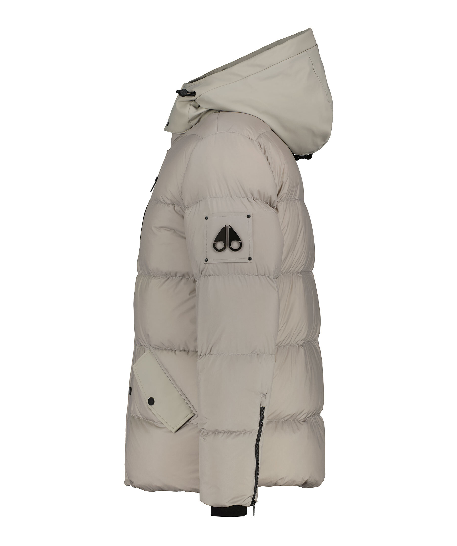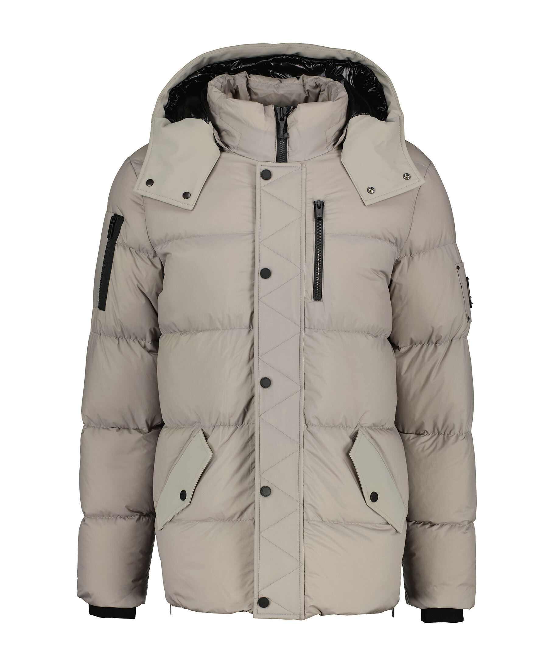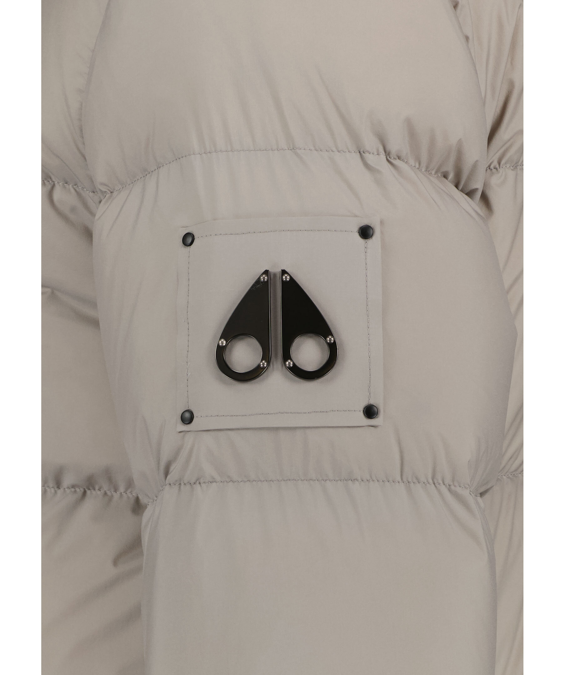 Greige pufferjacka med en avtagbar huva från Moose Knuckles. Jackan stängs med dold tvåvägsdragkedja och tryckknappar framtill och har två sidfickor med tryckknapp, en bröstficka med dragkedja och en ficka på höger ärm med dragkedja. Patch med metall-logotyp på vänster ärm. Dragsko i huvan. Tillverkad i en nylonblandning.