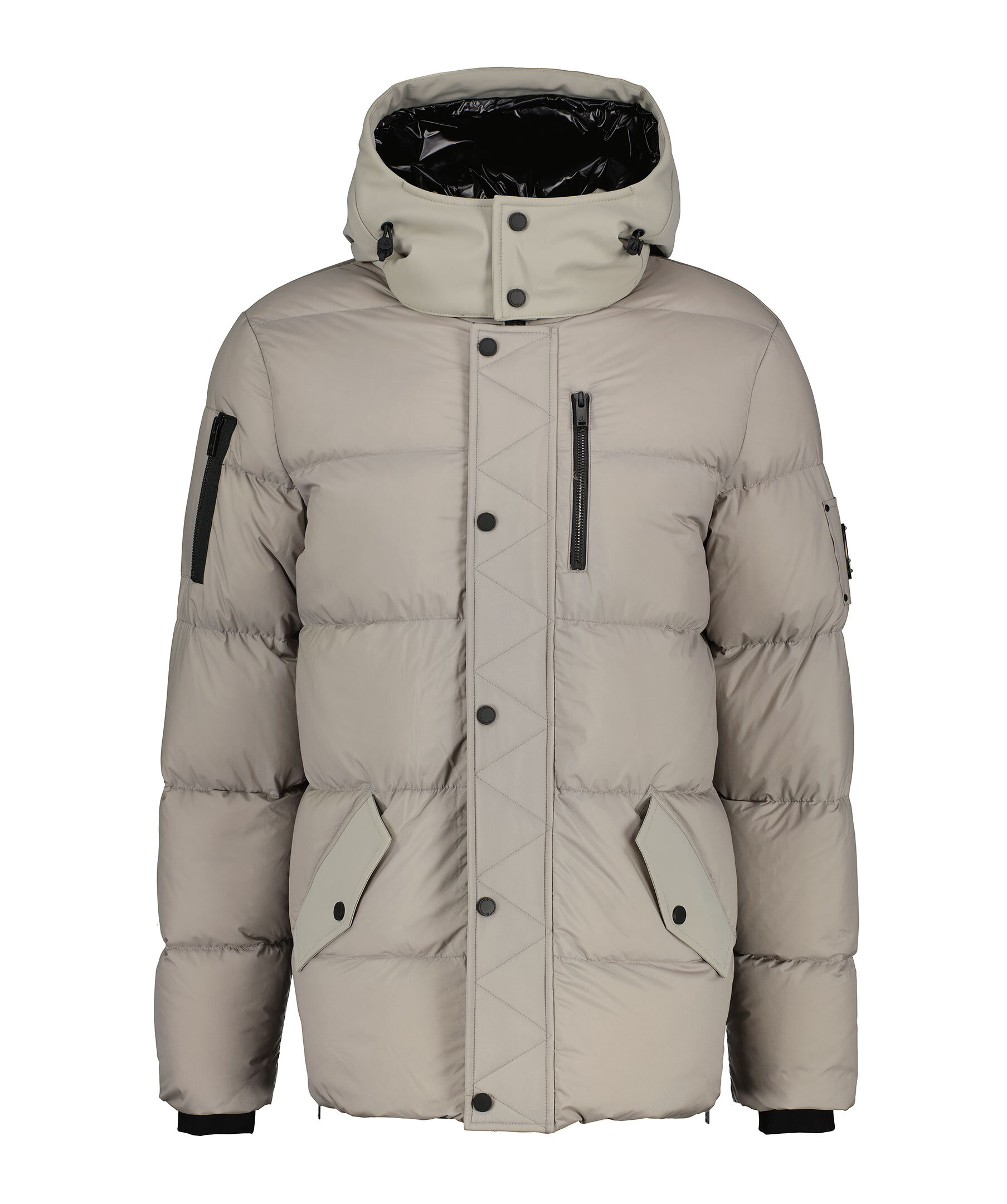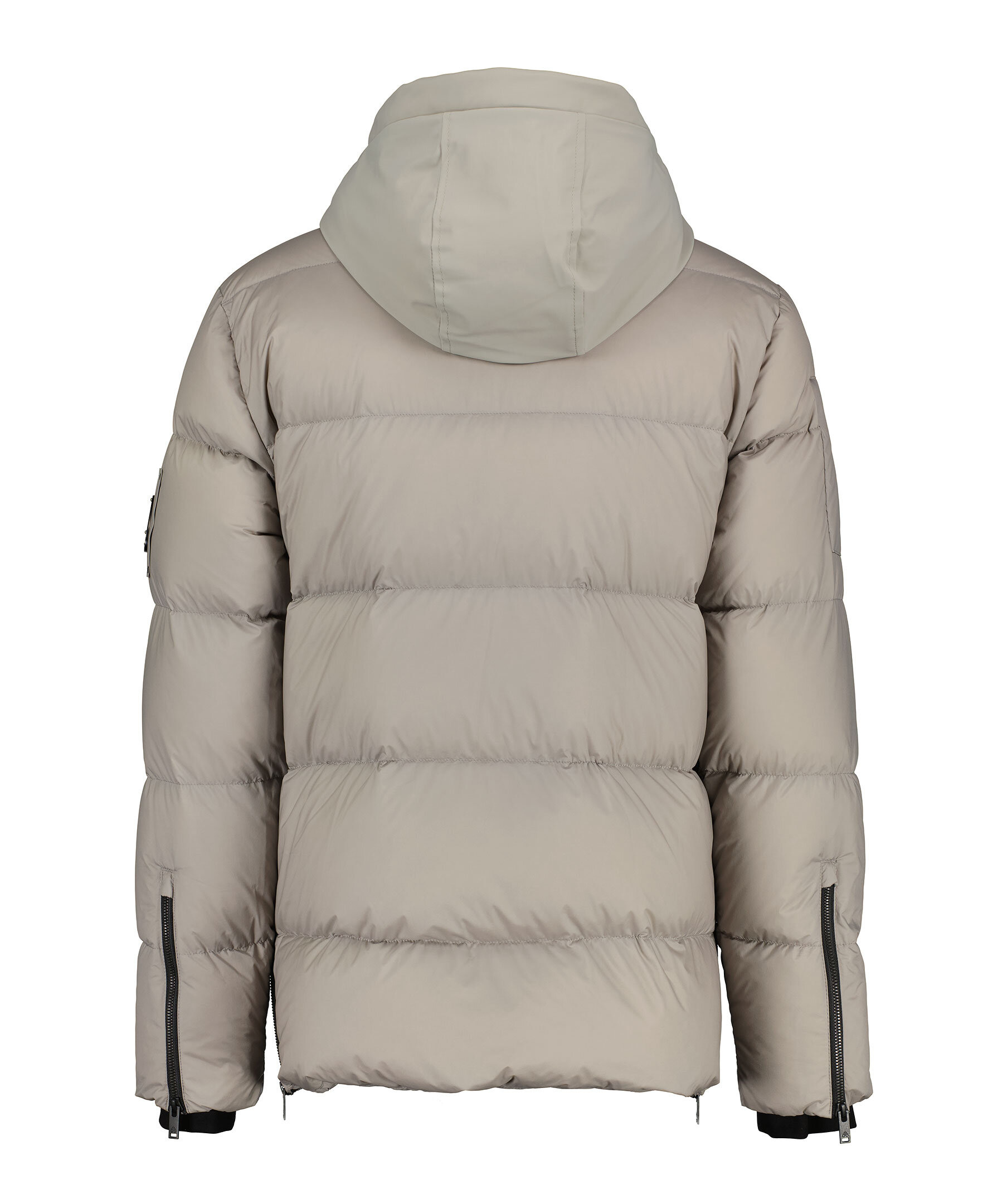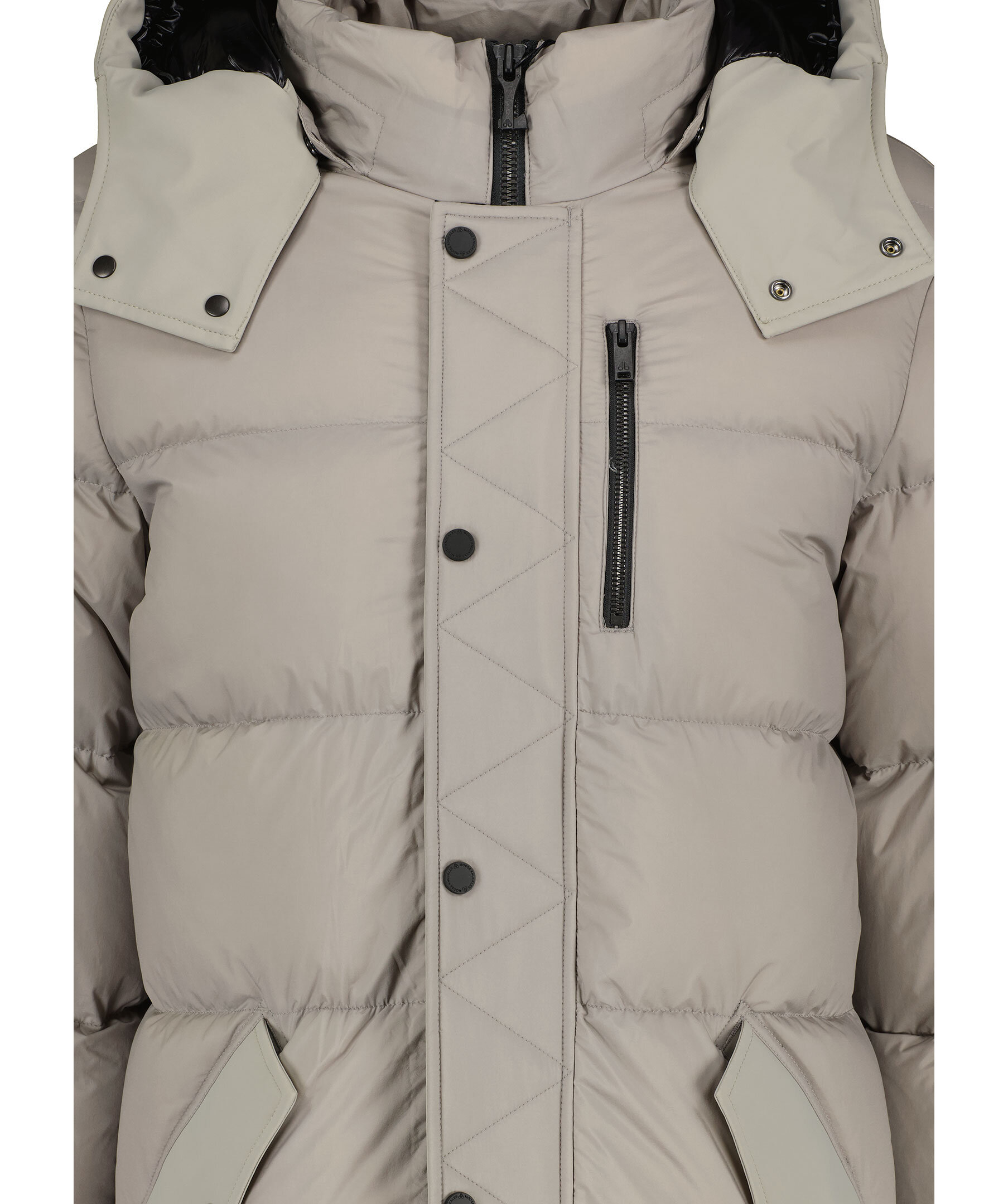 Greige pufferjacka med en avtagbar huva från Moose Knuckles. Jackan stängs med dold tvåvägsdragkedja och tryckknappar framtill och har två sidfickor med tryckknapp, en bröstficka med dragkedja och en ficka på höger ärm med dragkedja. Patch med metall-logotyp på vänster ärm. Dragsko i huvan. Tillverkad i en nylonblandning.
