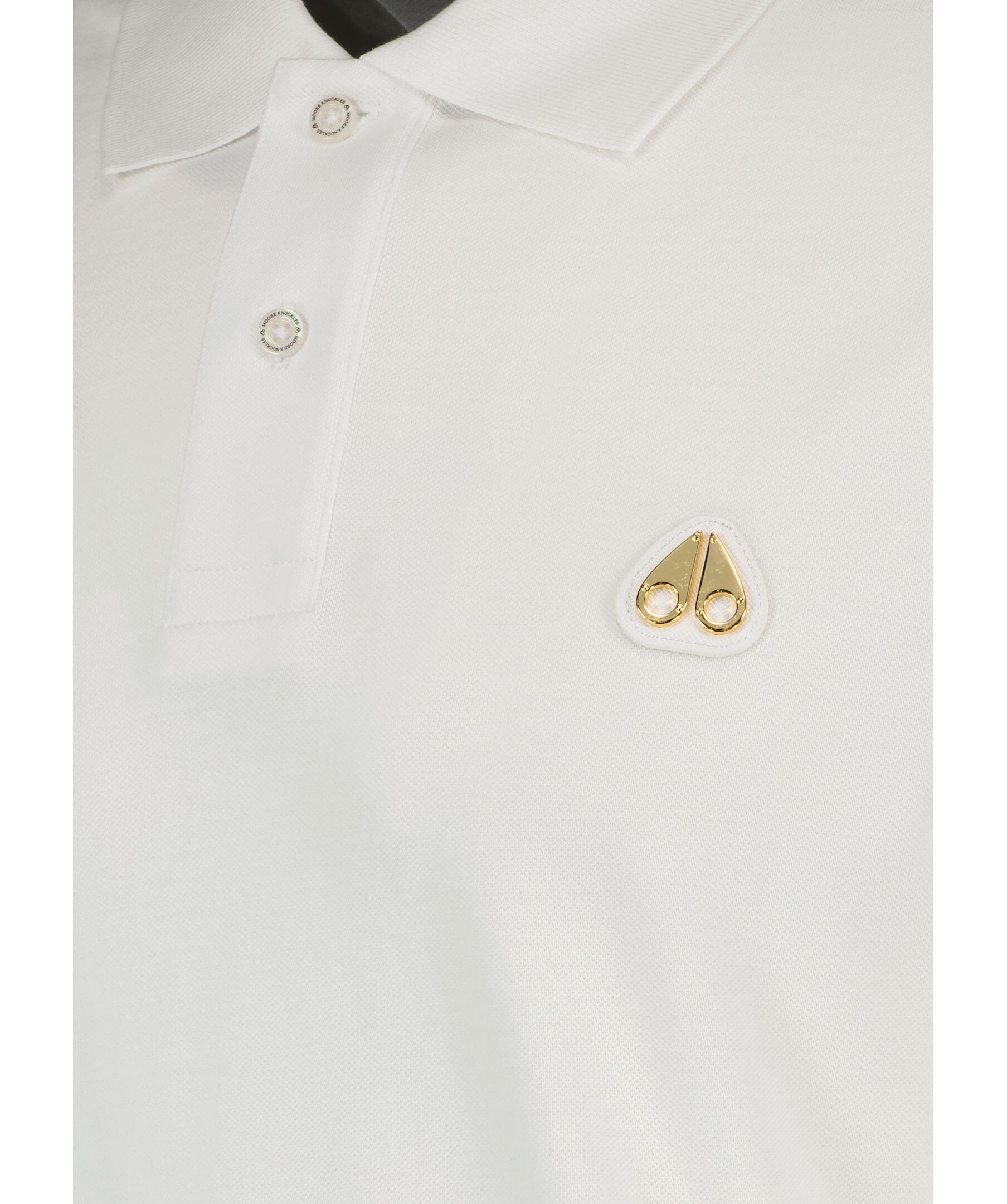Vit pikétröja från Moose Knuckles. Pikén har korta ärmar, två knappar framtill, ribbstickade detaljer och en guldfärgad metallogotyp på bröstet. Tillverkad i bomull.