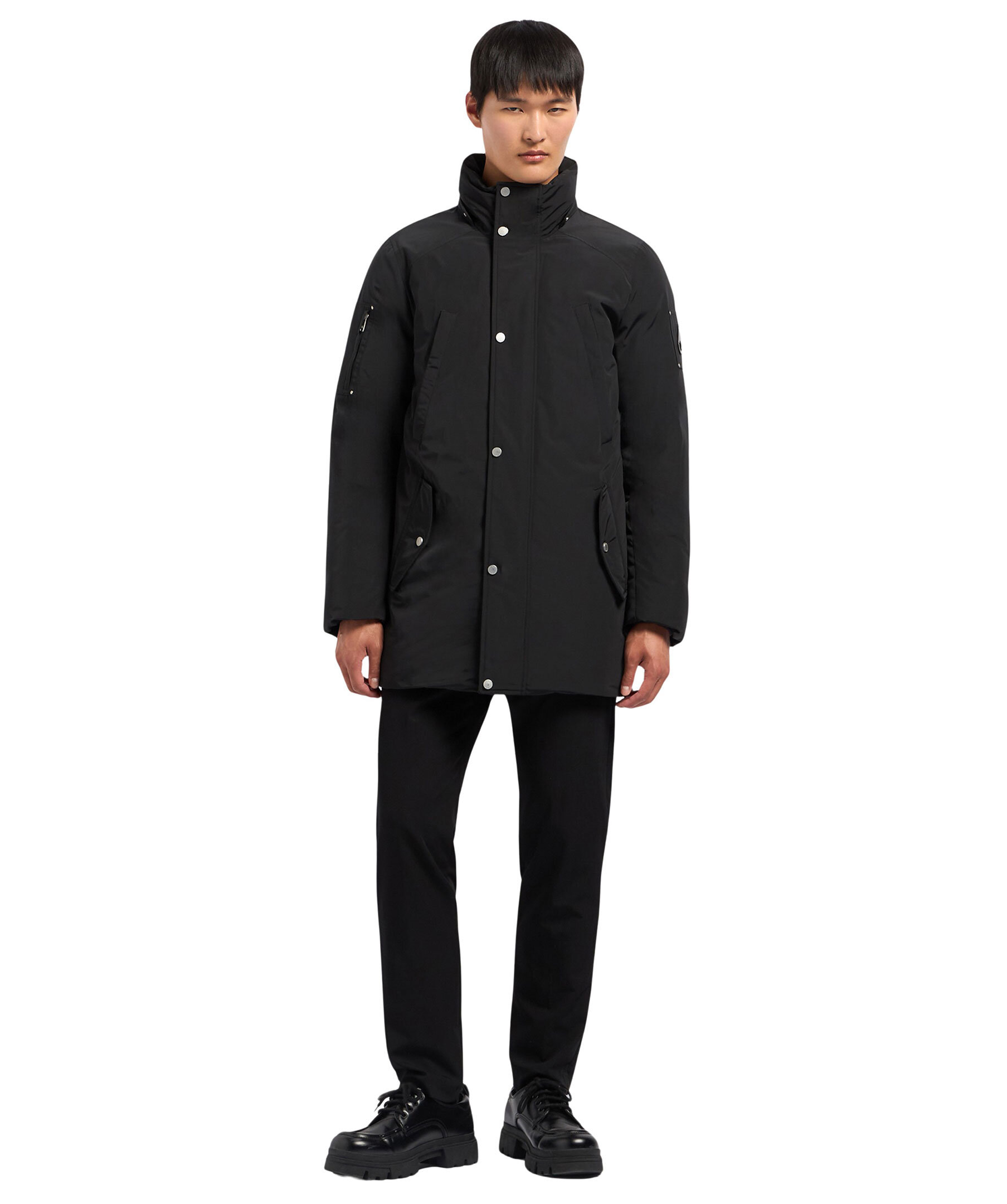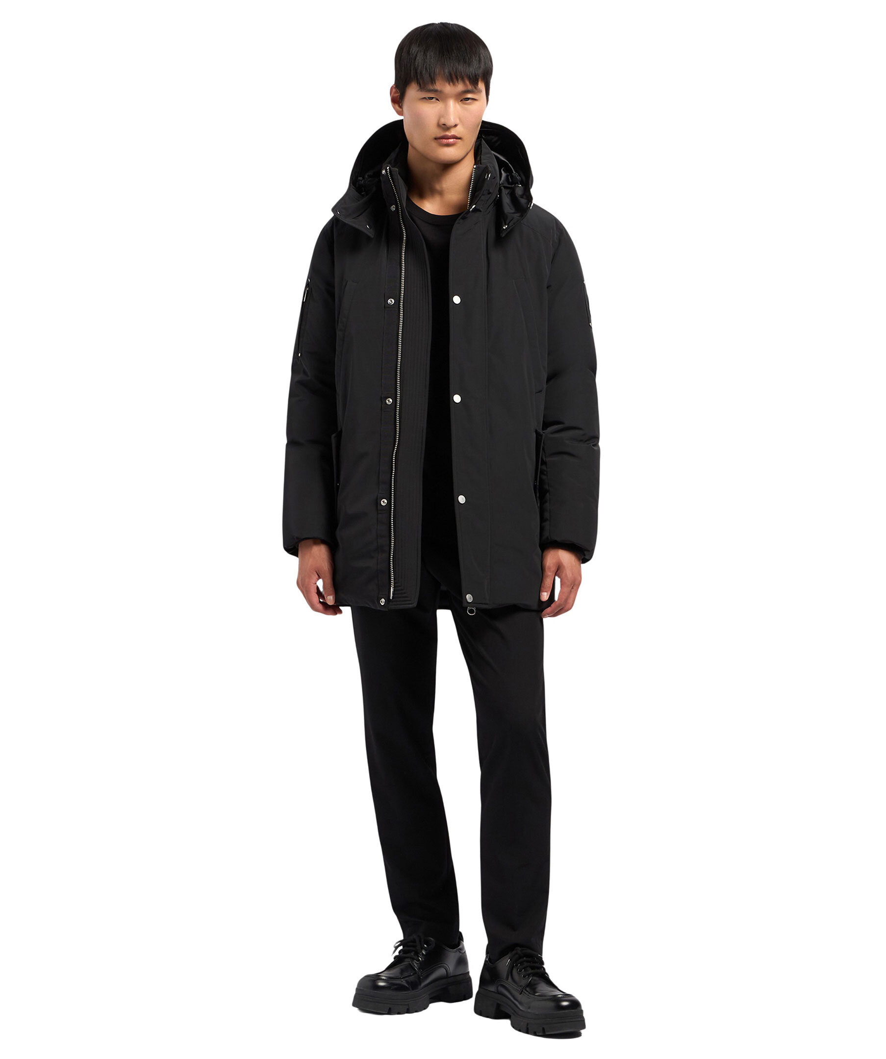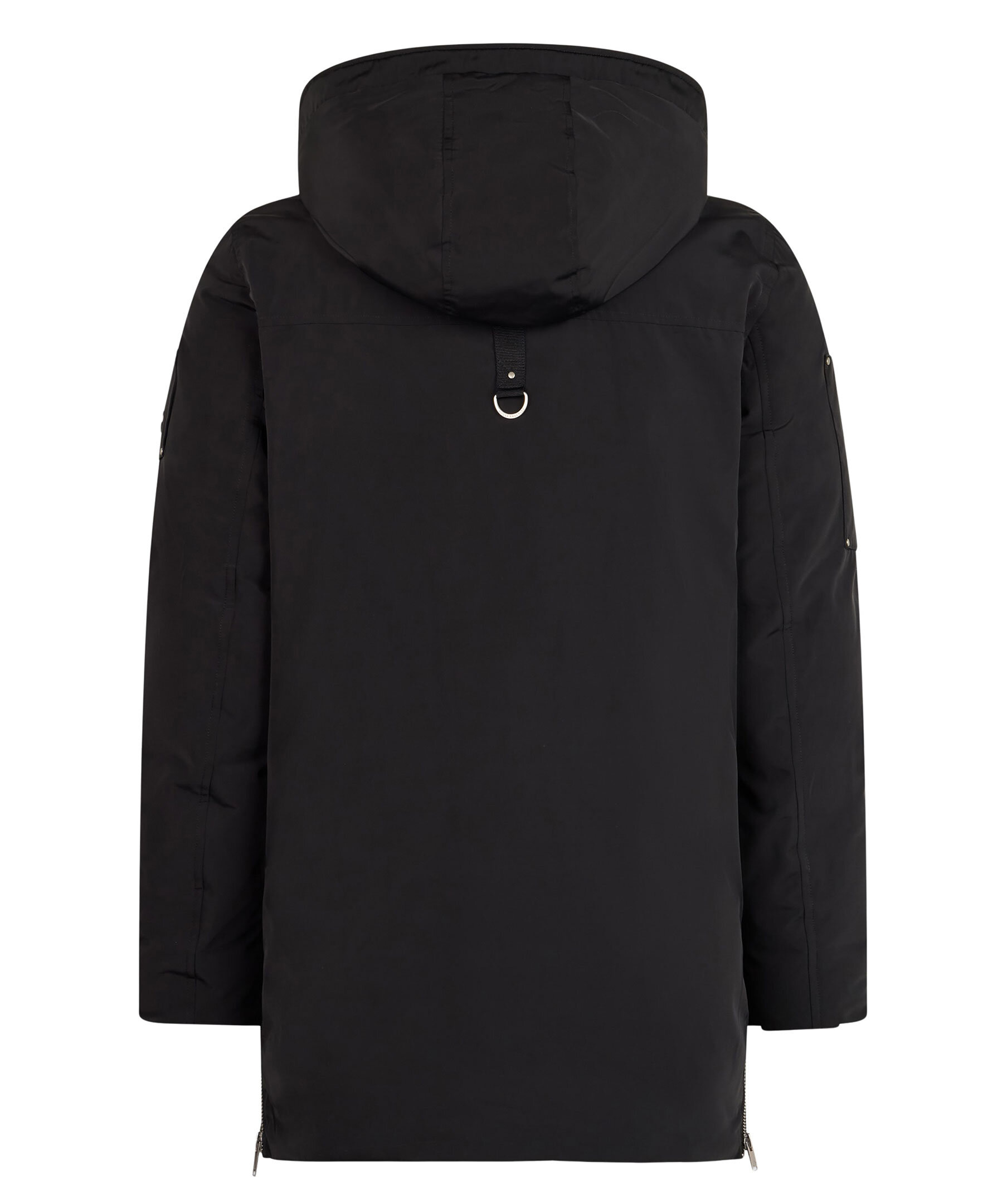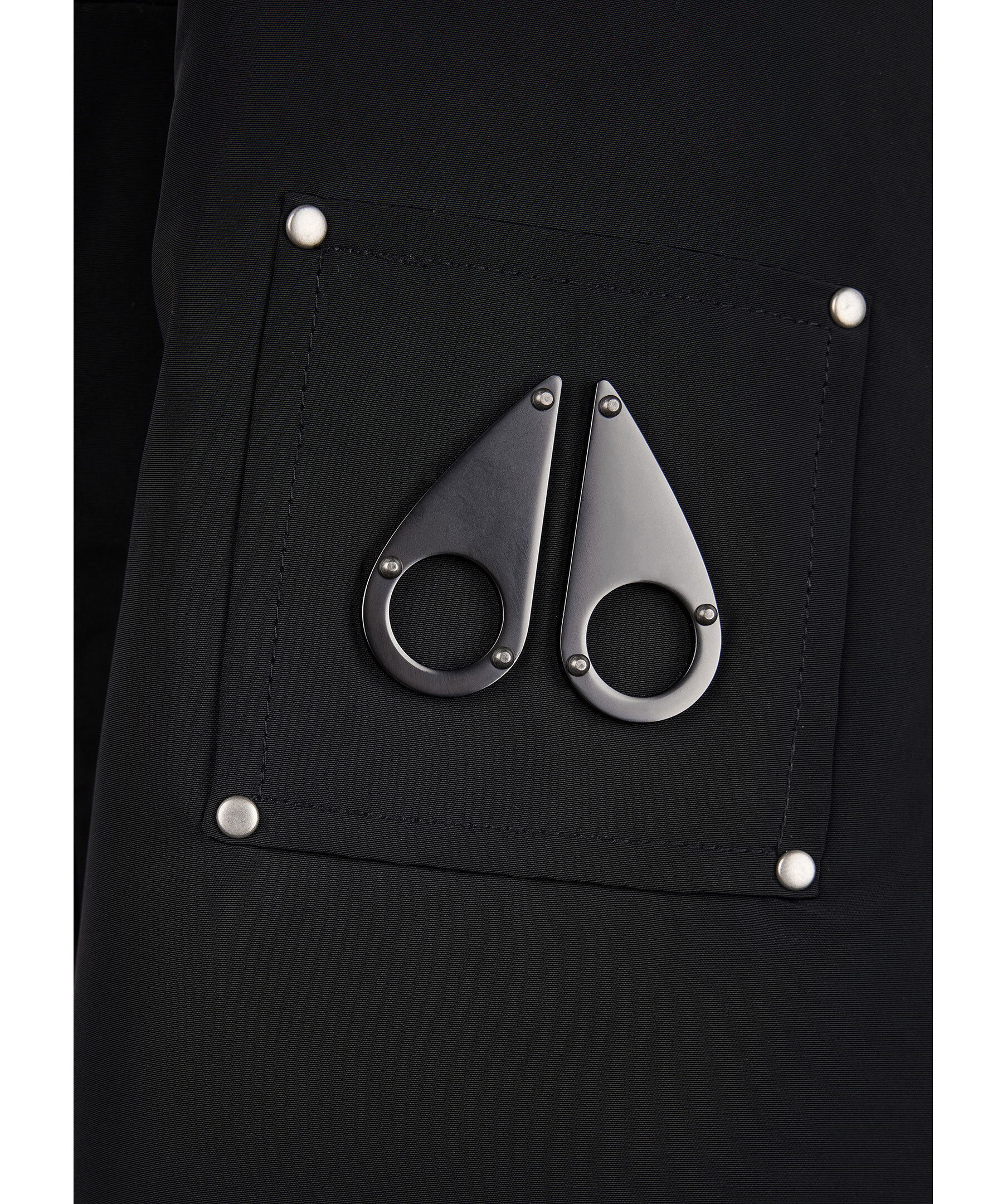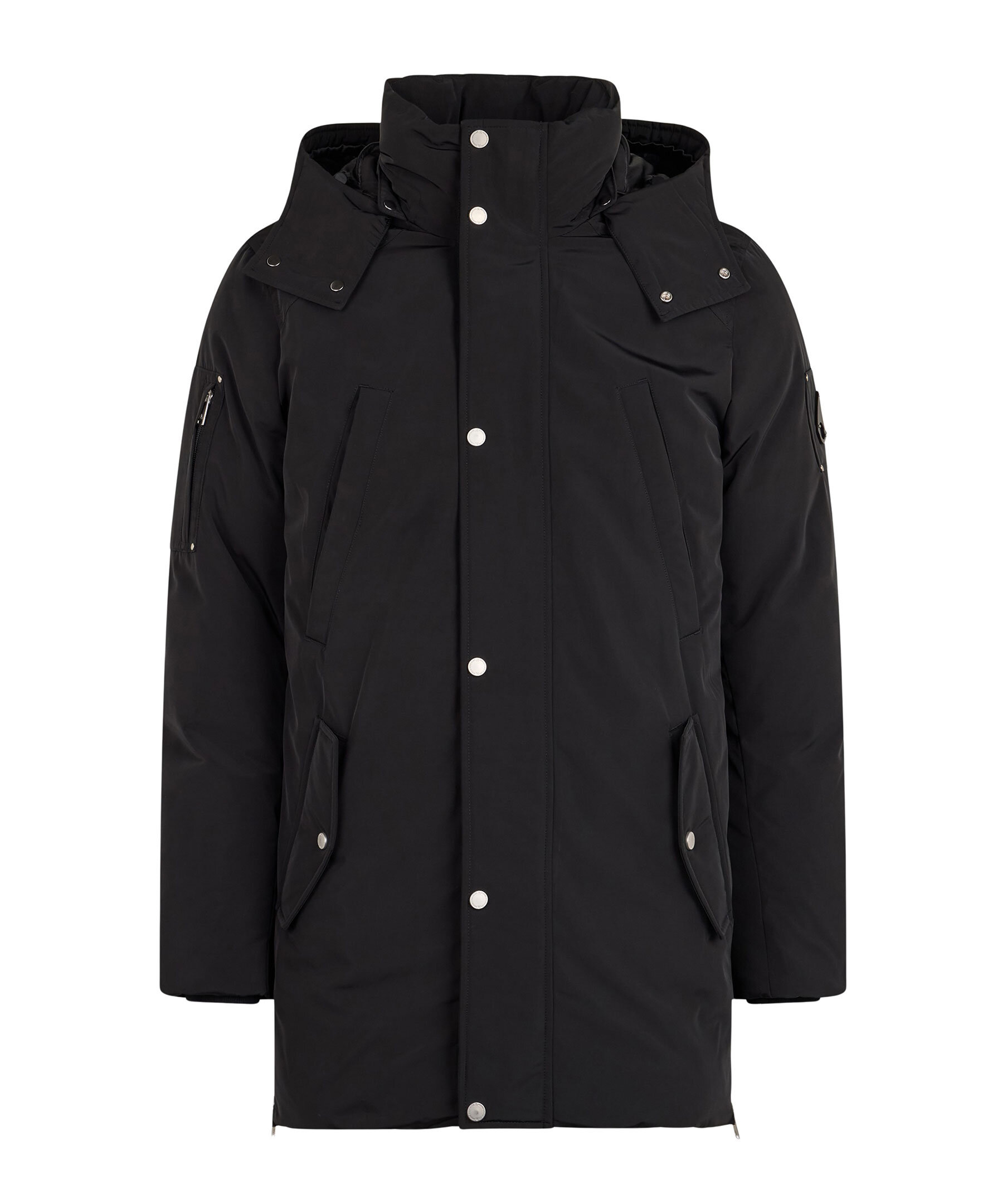 Svart parkajacka med huva från Moose Knuckles. Jackan stängs med dold tvåvägsdragkedja och tryckknappar och har två sidfickor samt två bröstfickor med tryckknappar och en ärmficka med dragkedja. Huvan har dragsko. Moose Knucles-logotyp i metall på vänster ärm. Tillverkad i polyester med dunfyllning.