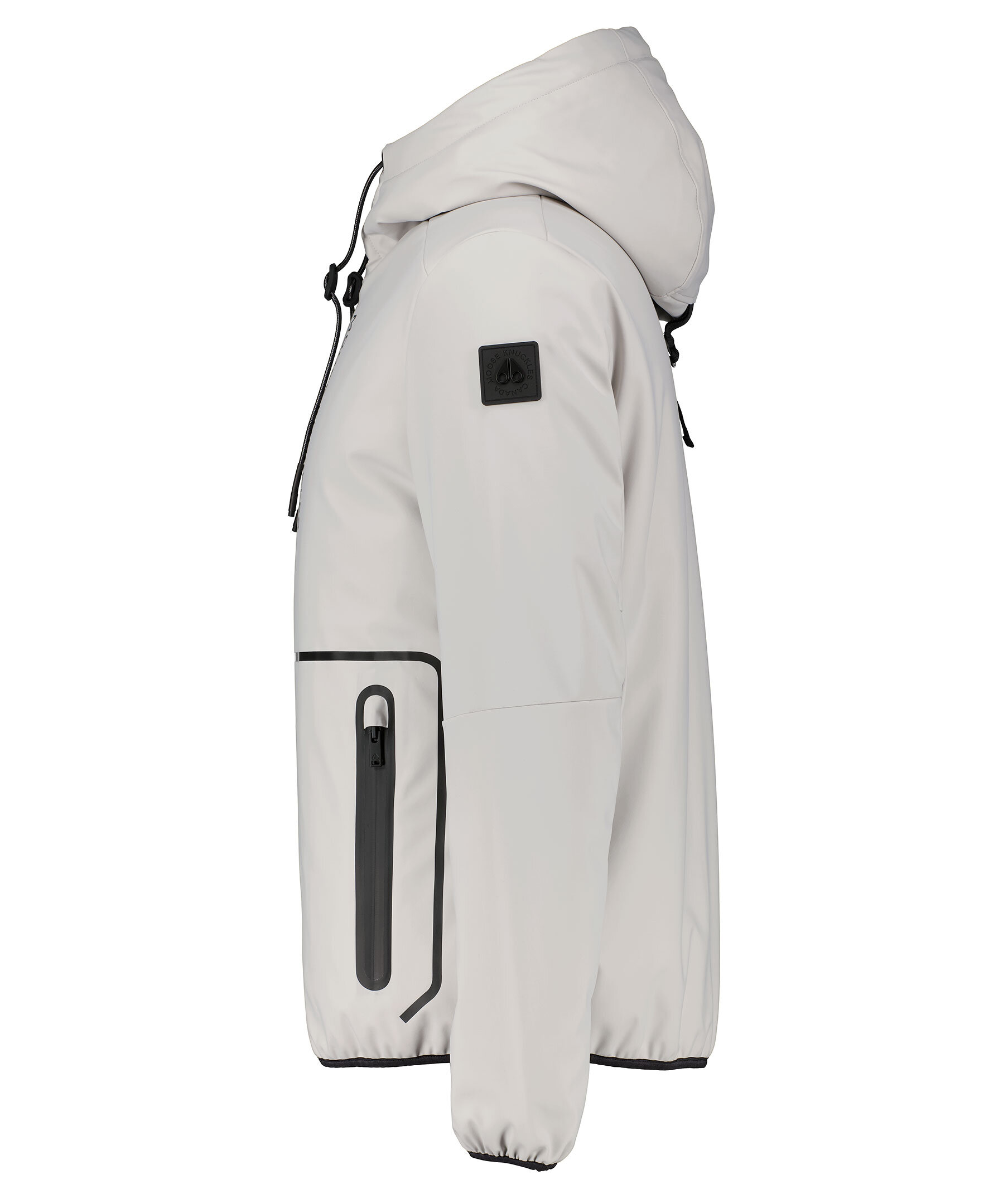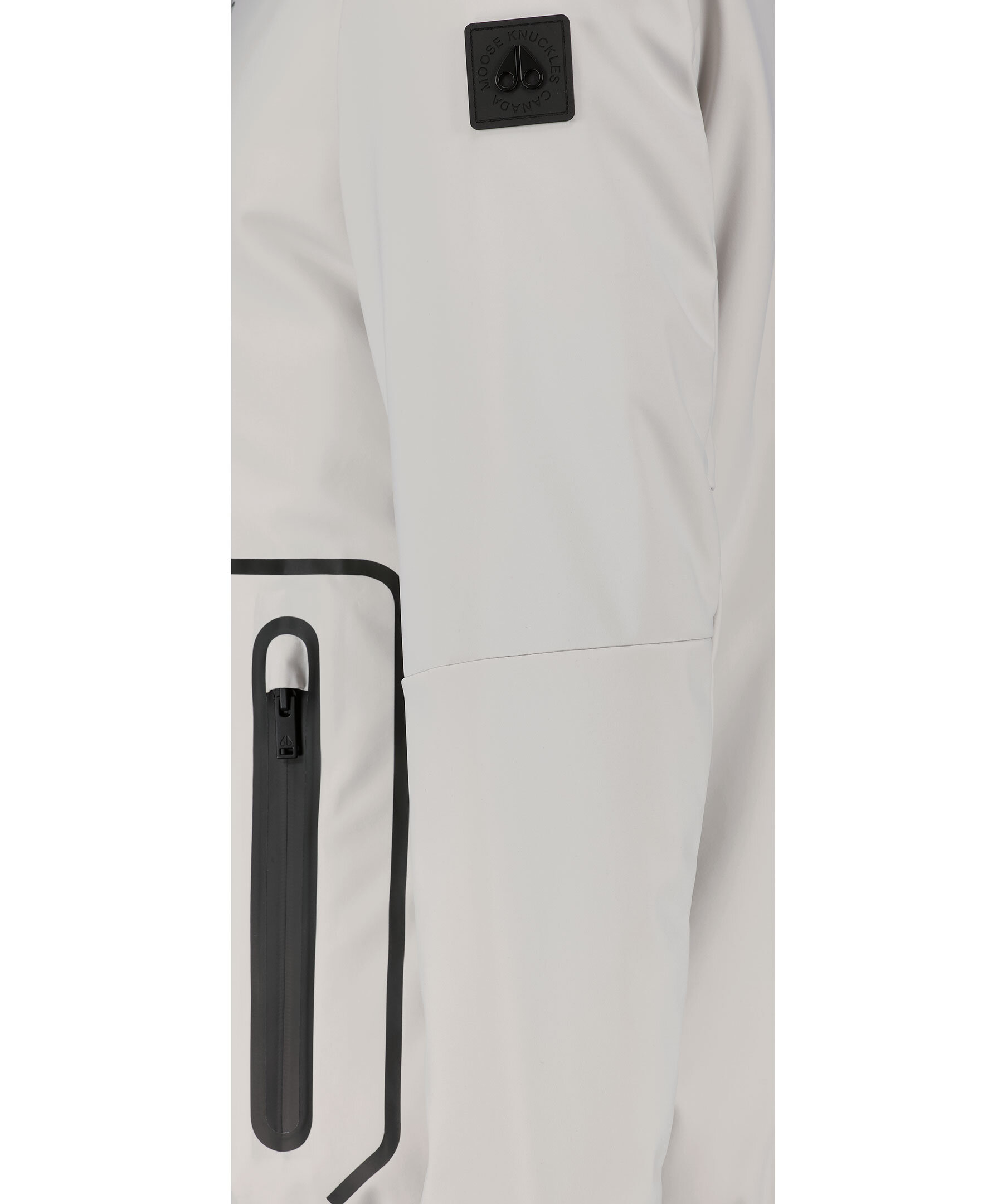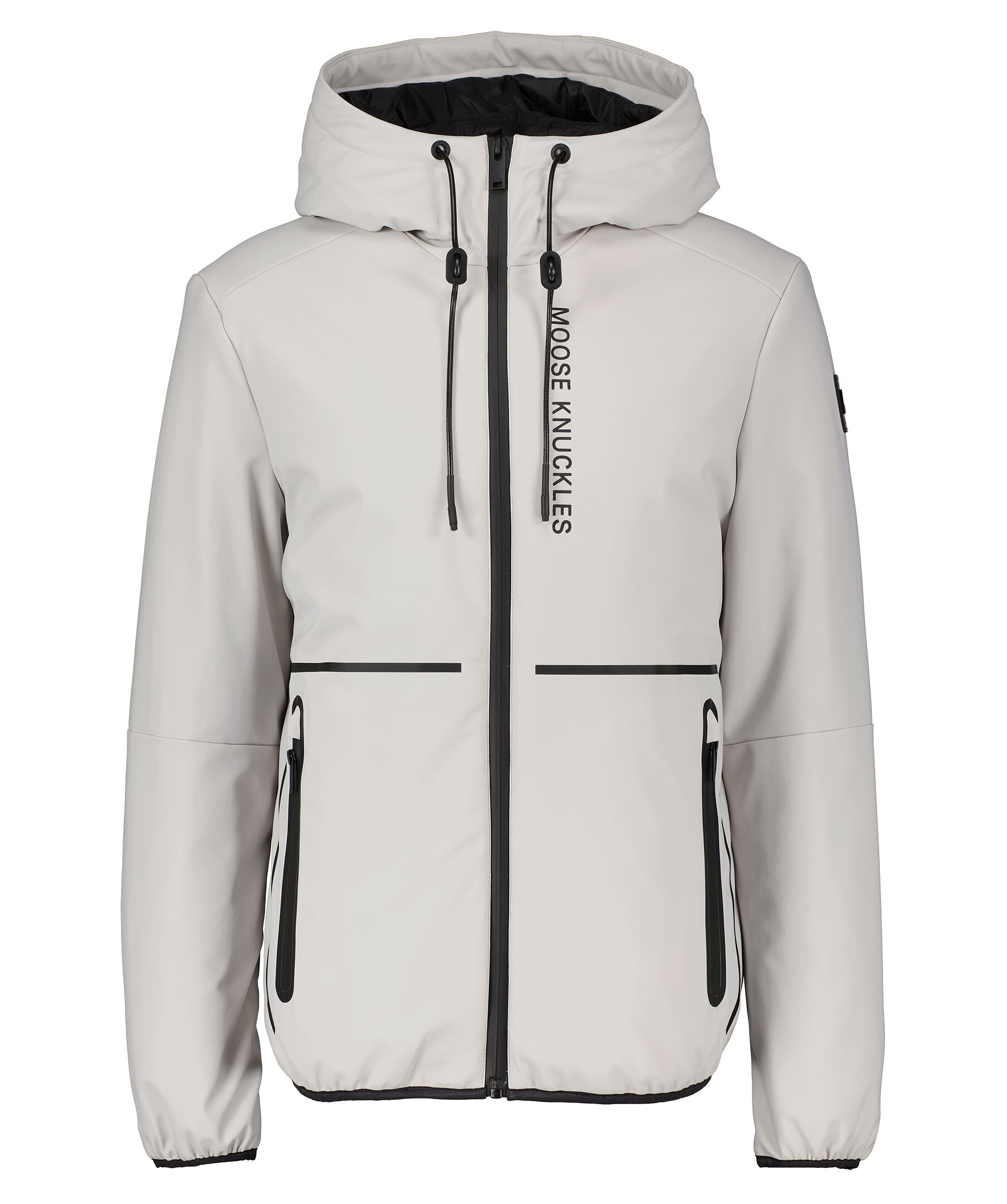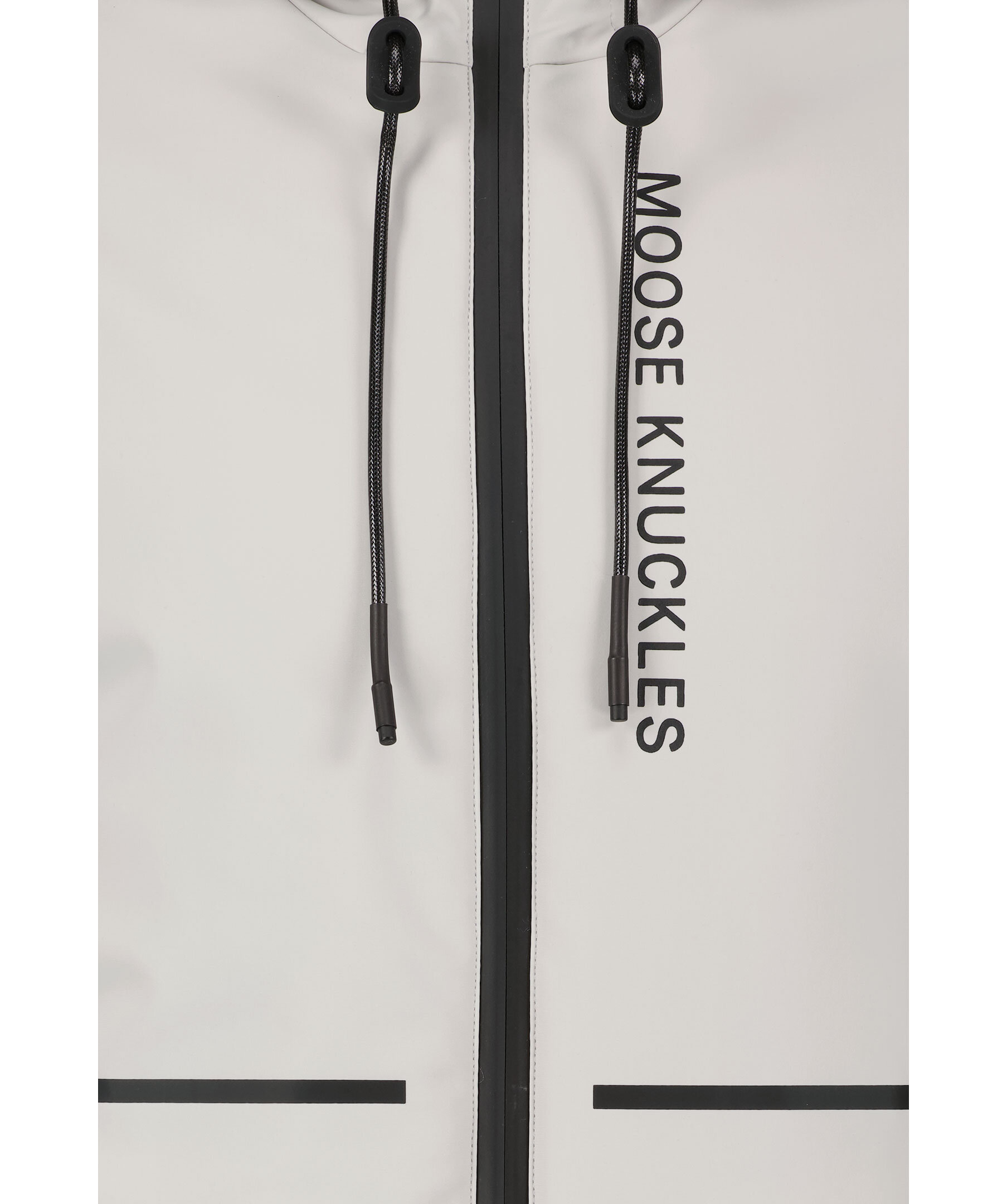 Ljusgrå lätt fodrad jacka från Moose Knuckles. Stängs framtill med svart tvåvägsdragkedja. Luva med svart snörning och hög krage. Två fickor framtill som stängs med dragkedja. Tryckt logotyp på vänster bröst och svart gummerad logotyp på vänster ärm. Smal elastisk mudd vid ärm- och plaggslut. Svarta detaljer.