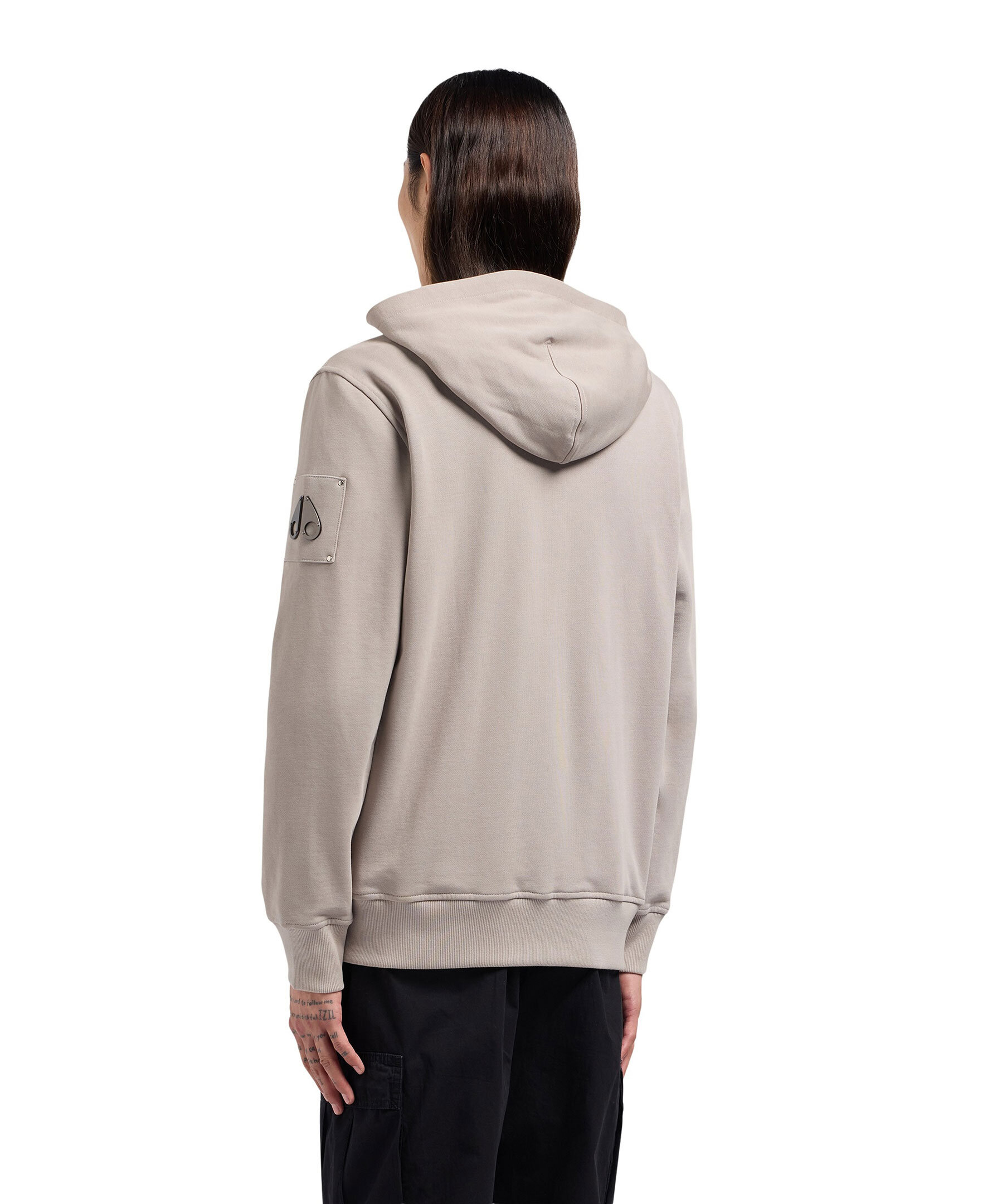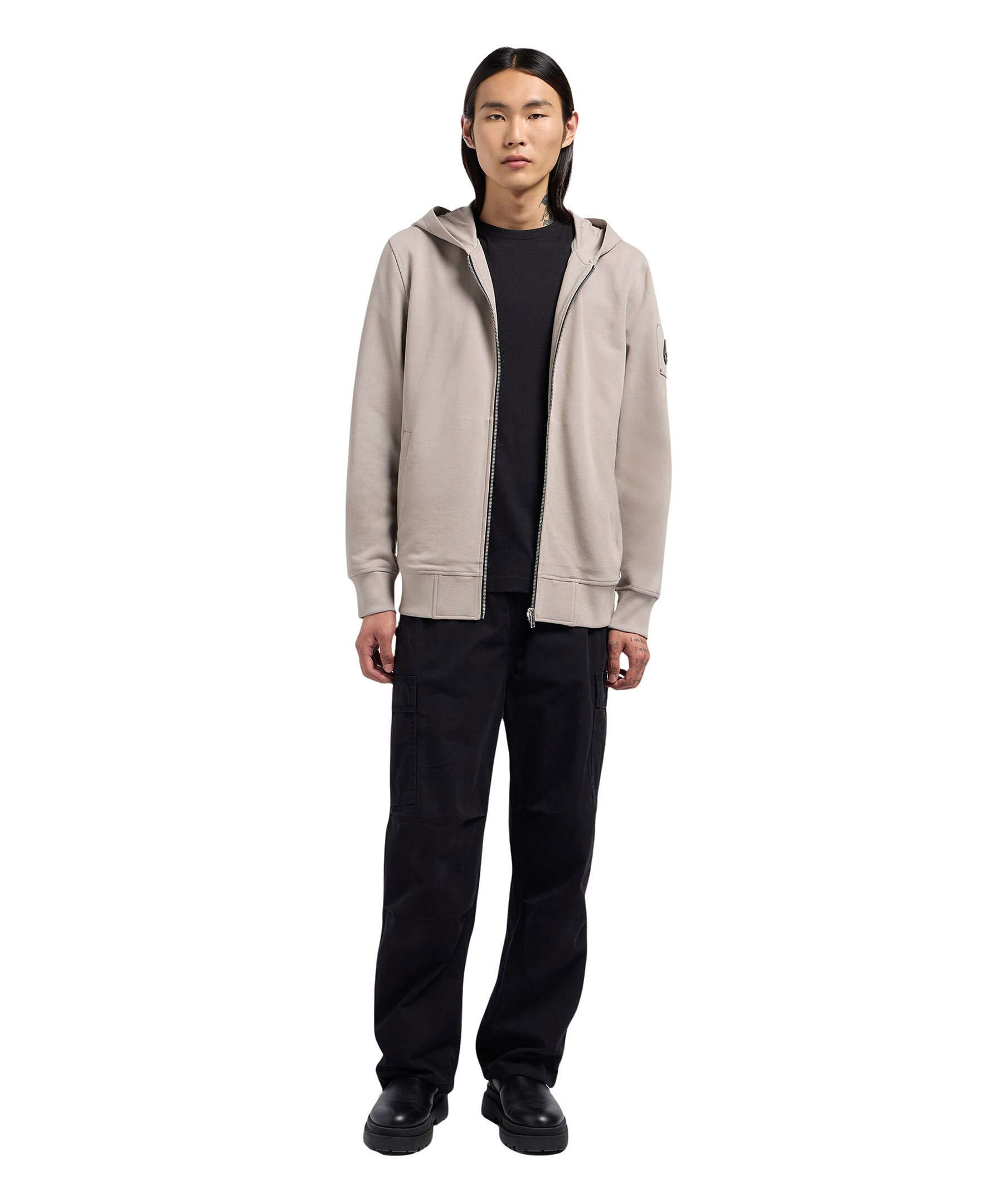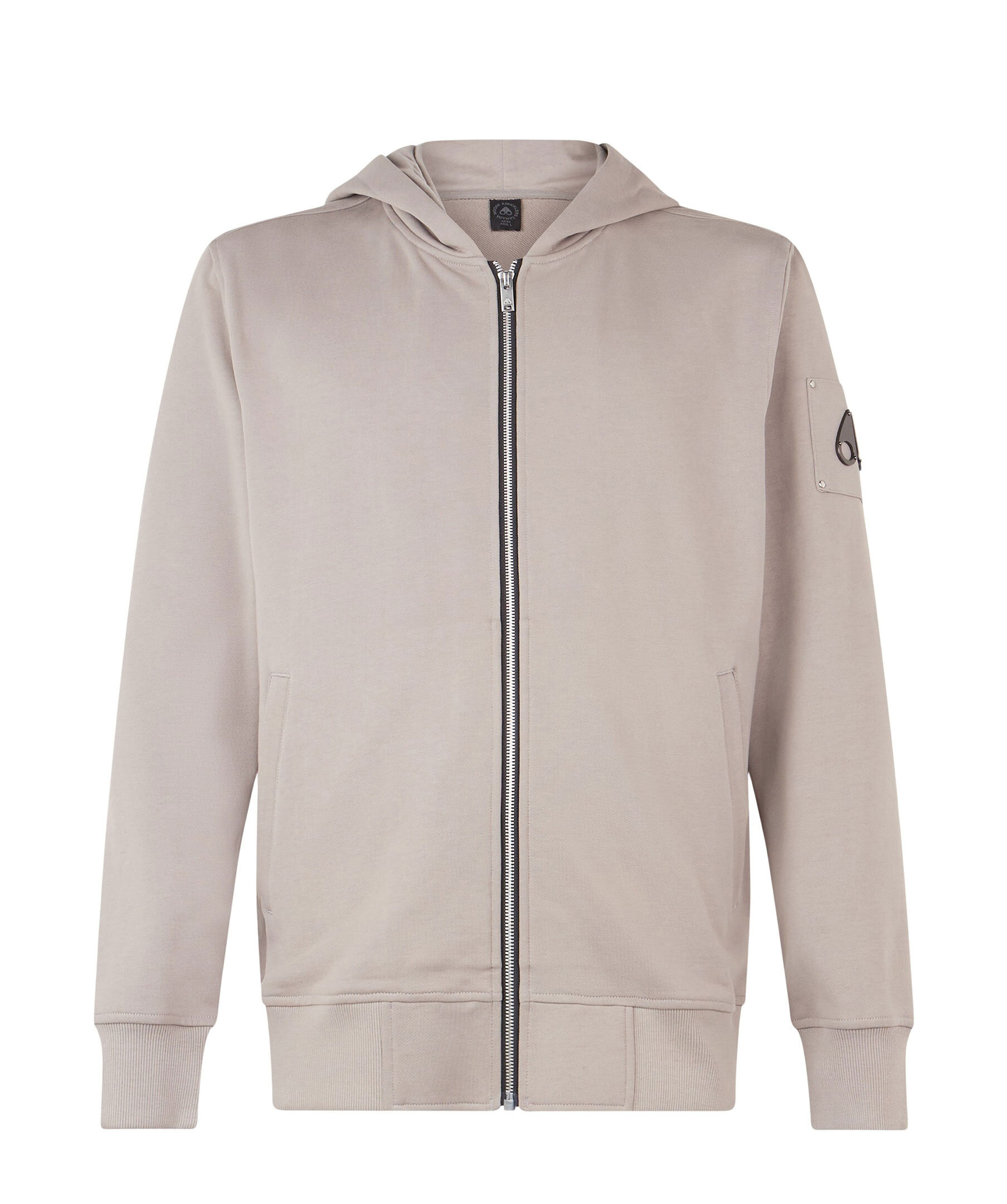 Beige, zip-up hoodie från Moose Knuckles. Tröjan stängs med hel dragkedja och har huva, två sidfickor samt patch med logotyp i metall på vänster ärm. Tillverkad i bomull.
