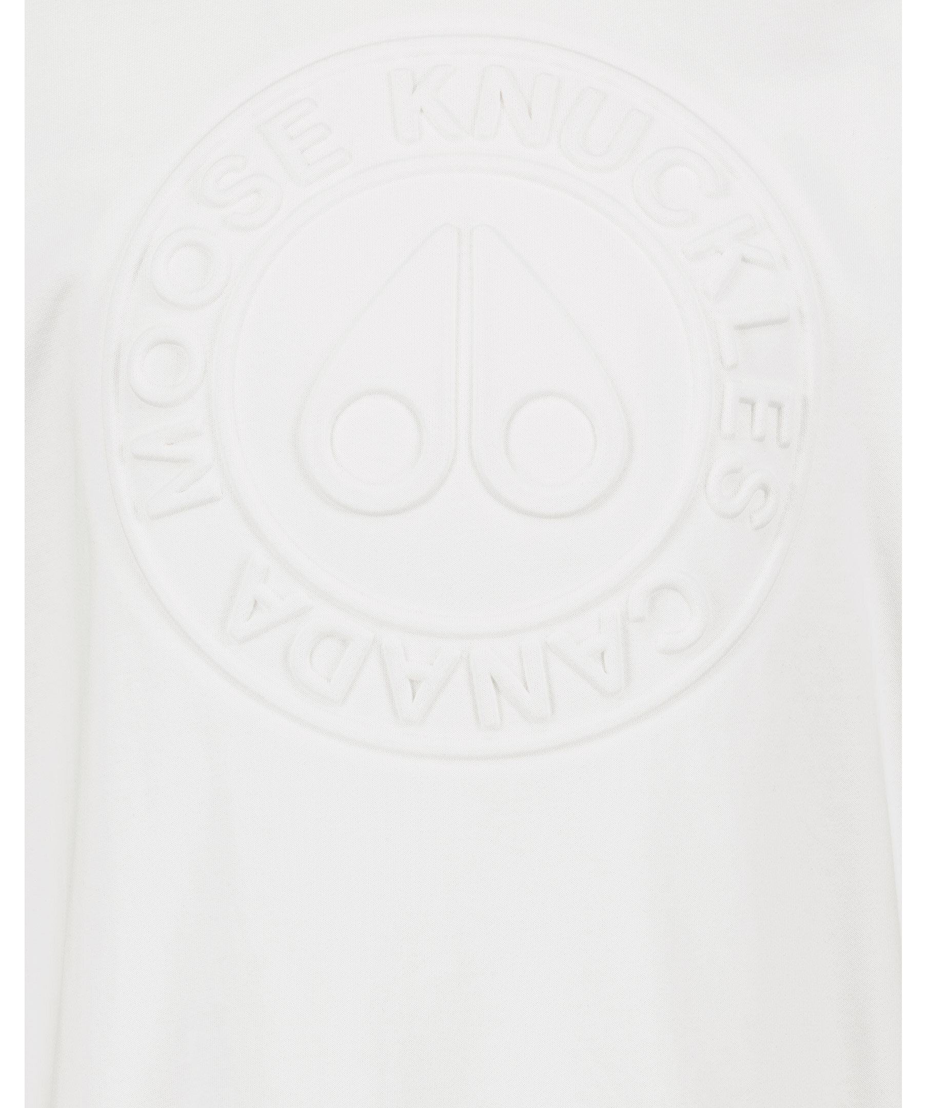 Vit sweatshirt från Moose Knuckles. Präglad logotyp över bröstet. Ribbstickade muddar vid ärm- och plaggslut. Svarta revärer på ärmarna.
