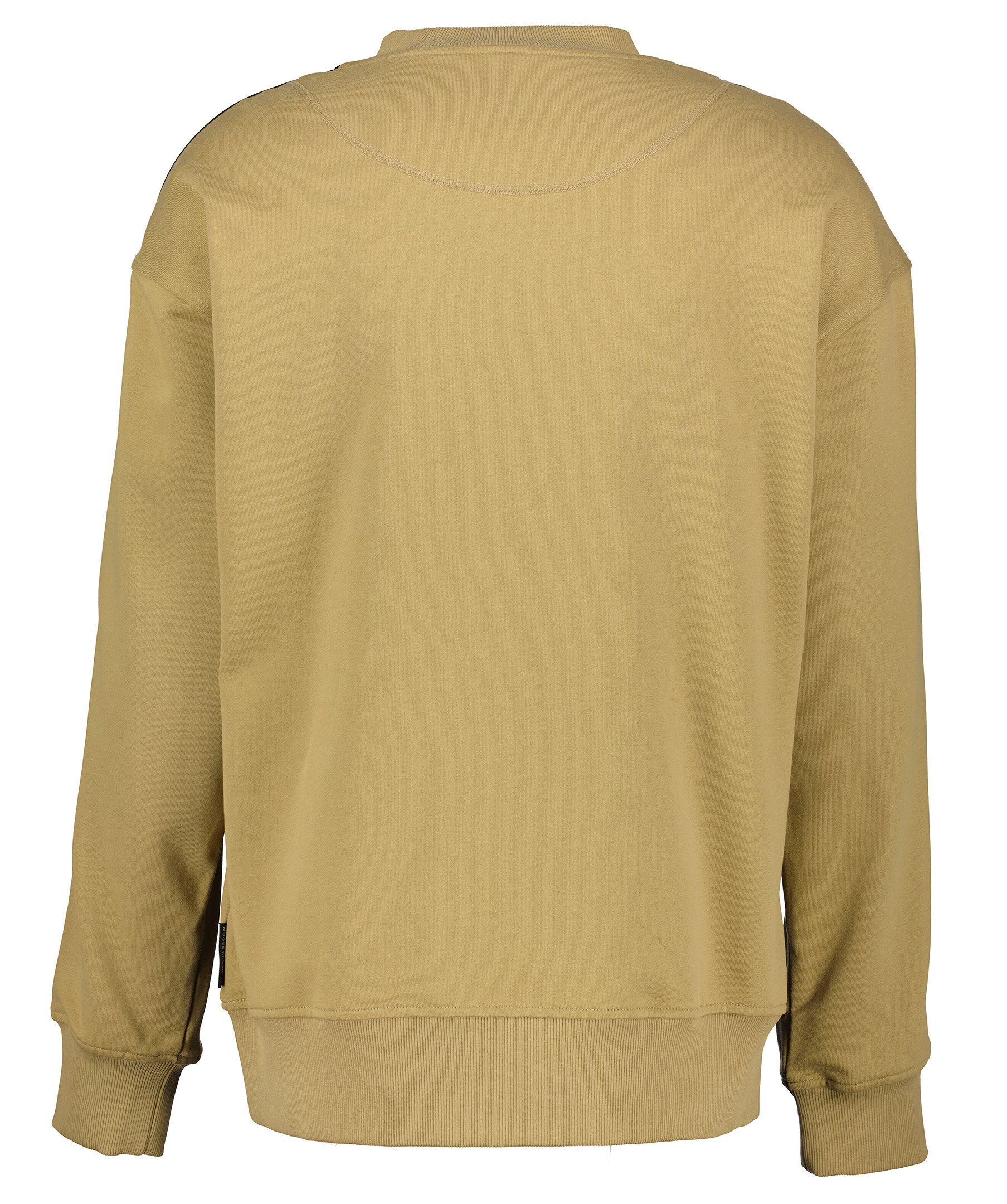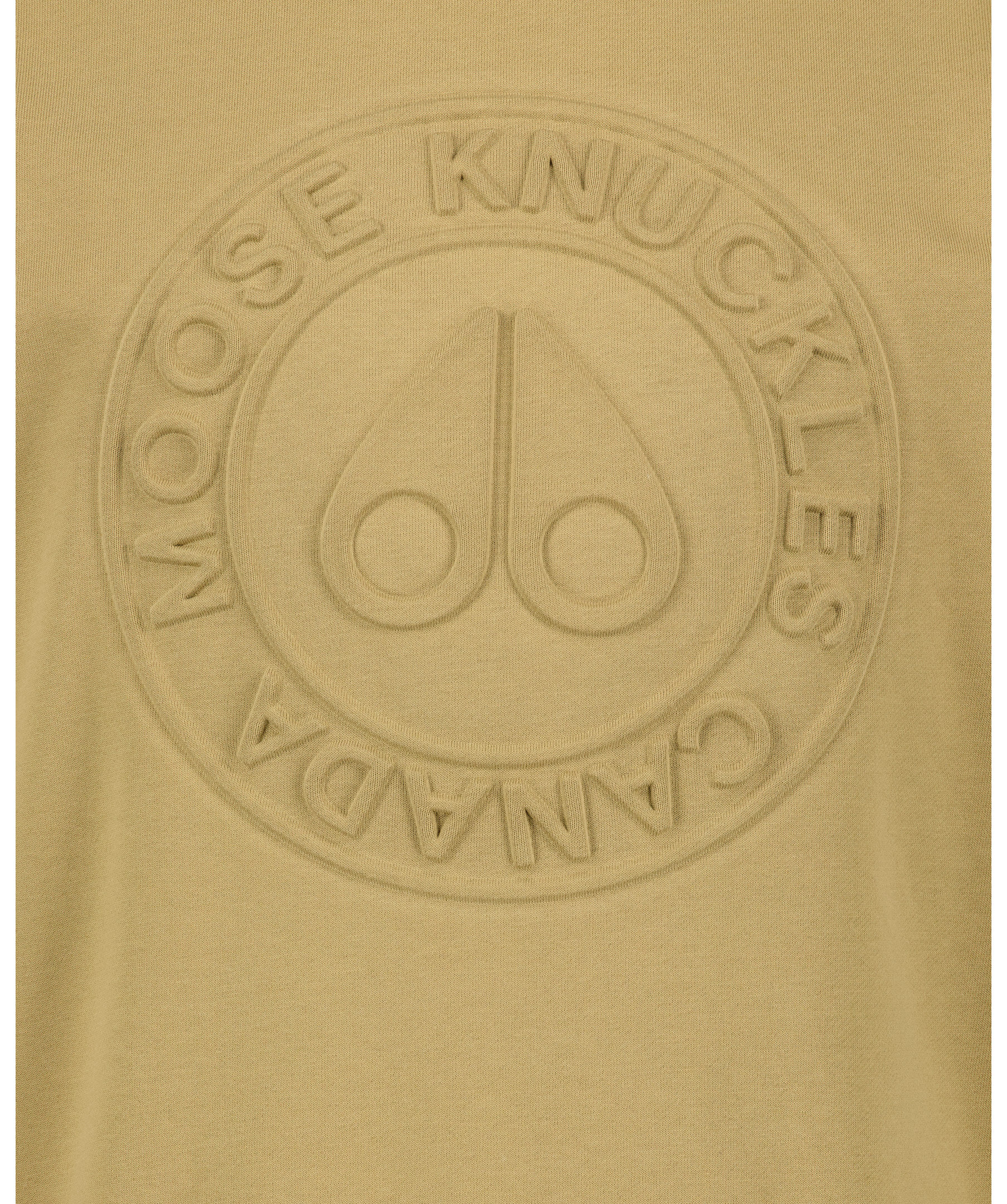 Beige sweatshirt från Moose Knuckles. Präglad logotyp över bröstet. Ribbstickade muddar vid ärm- och plaggslut. Svarta revärer på ärmarna.
