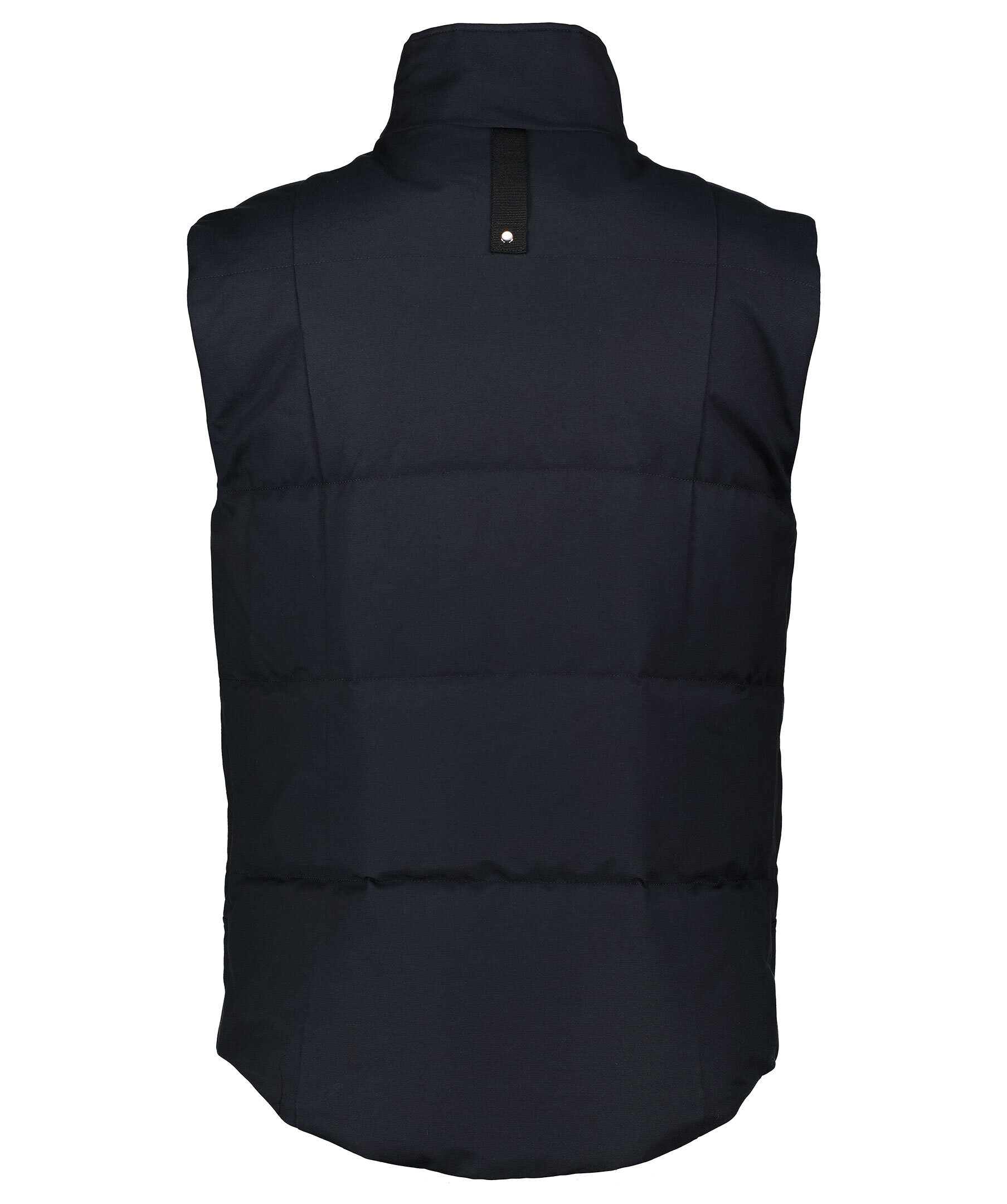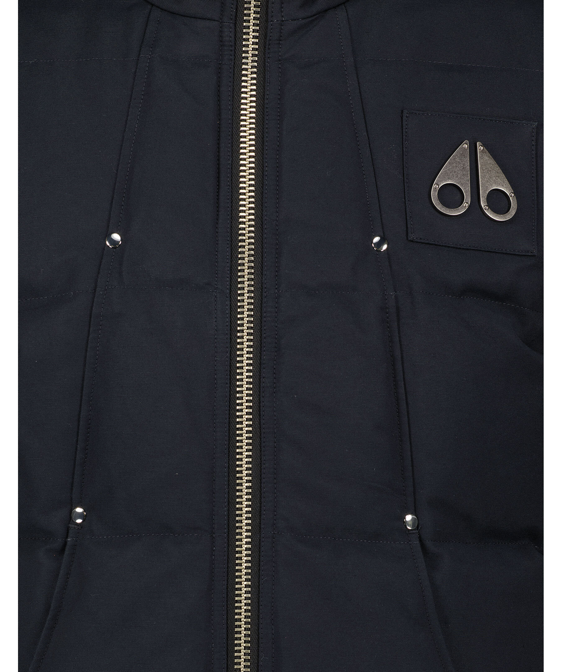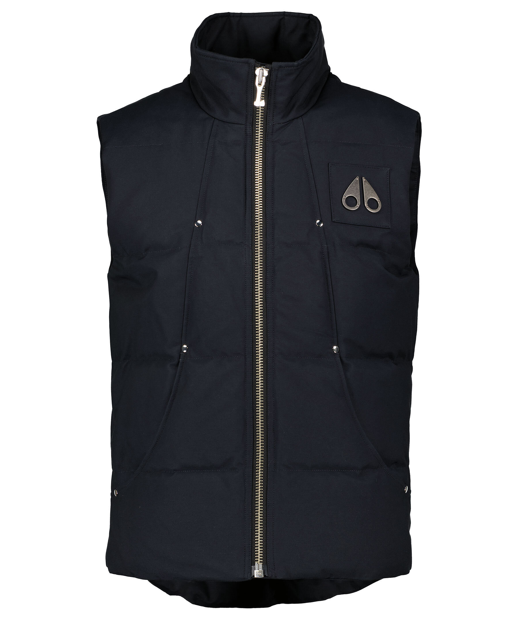 Mörkblå dunväst från Moose Knuckles. Stängs med silverfärgad dragkedja framtill och halvhög krage. Två fickor framtill, en innerficka. Logotyp i metall på vänster bröst.