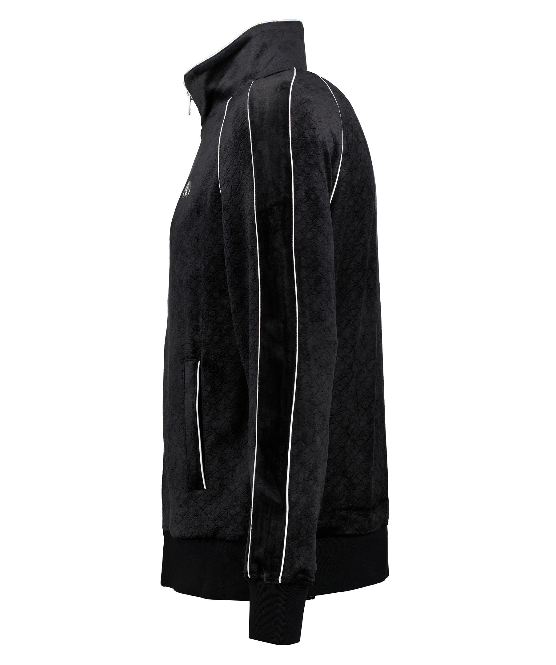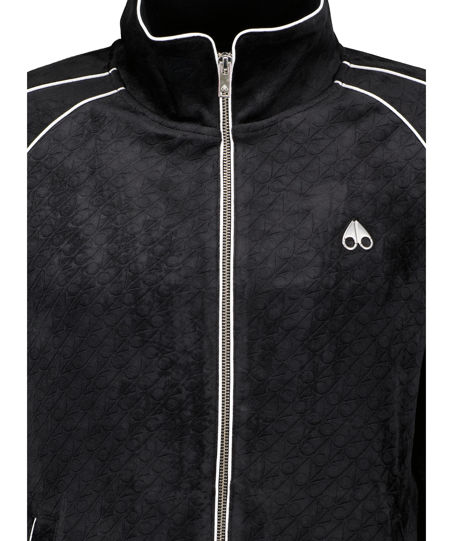 Svart tracksuit jacka i velour från Moose Knuckles. Tröjan har ett svagt logotypmönster. Smal passform. Stängs med dragkedja i metall. Två framfickor, ståkrage och logotyp i metall på bröstet.