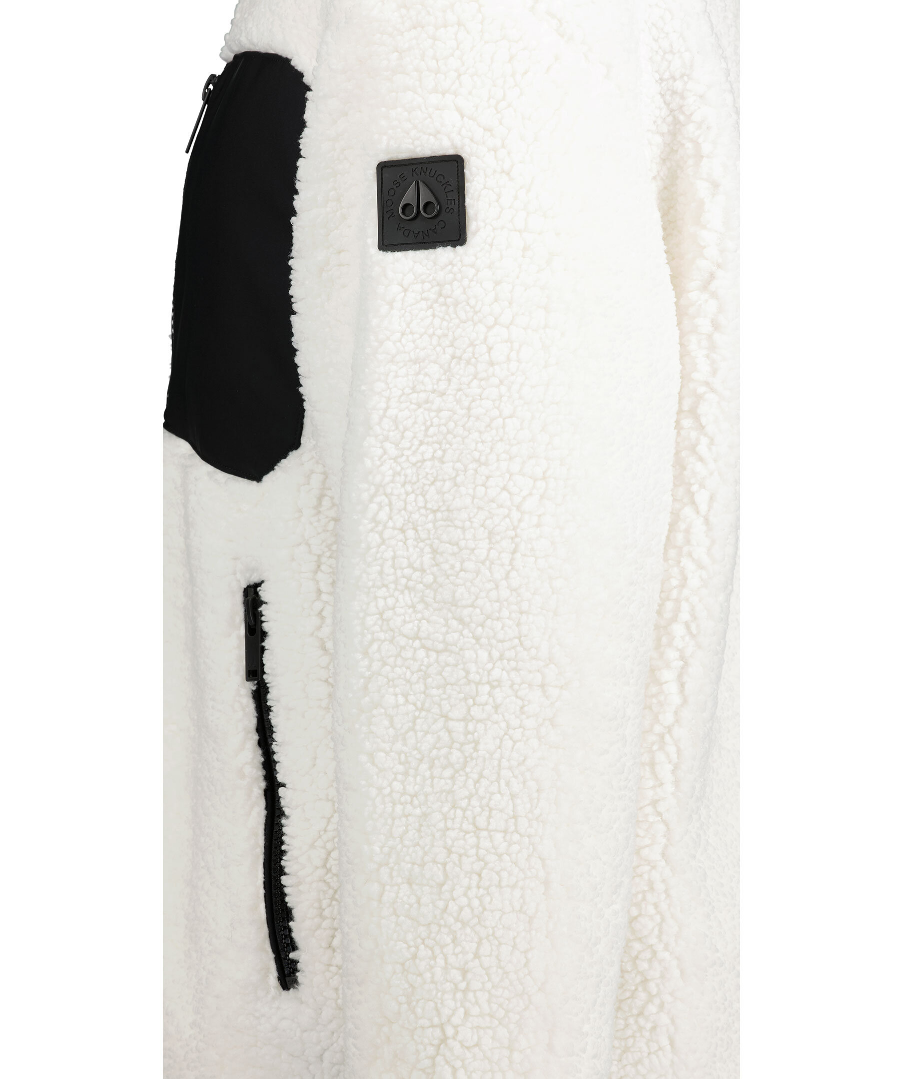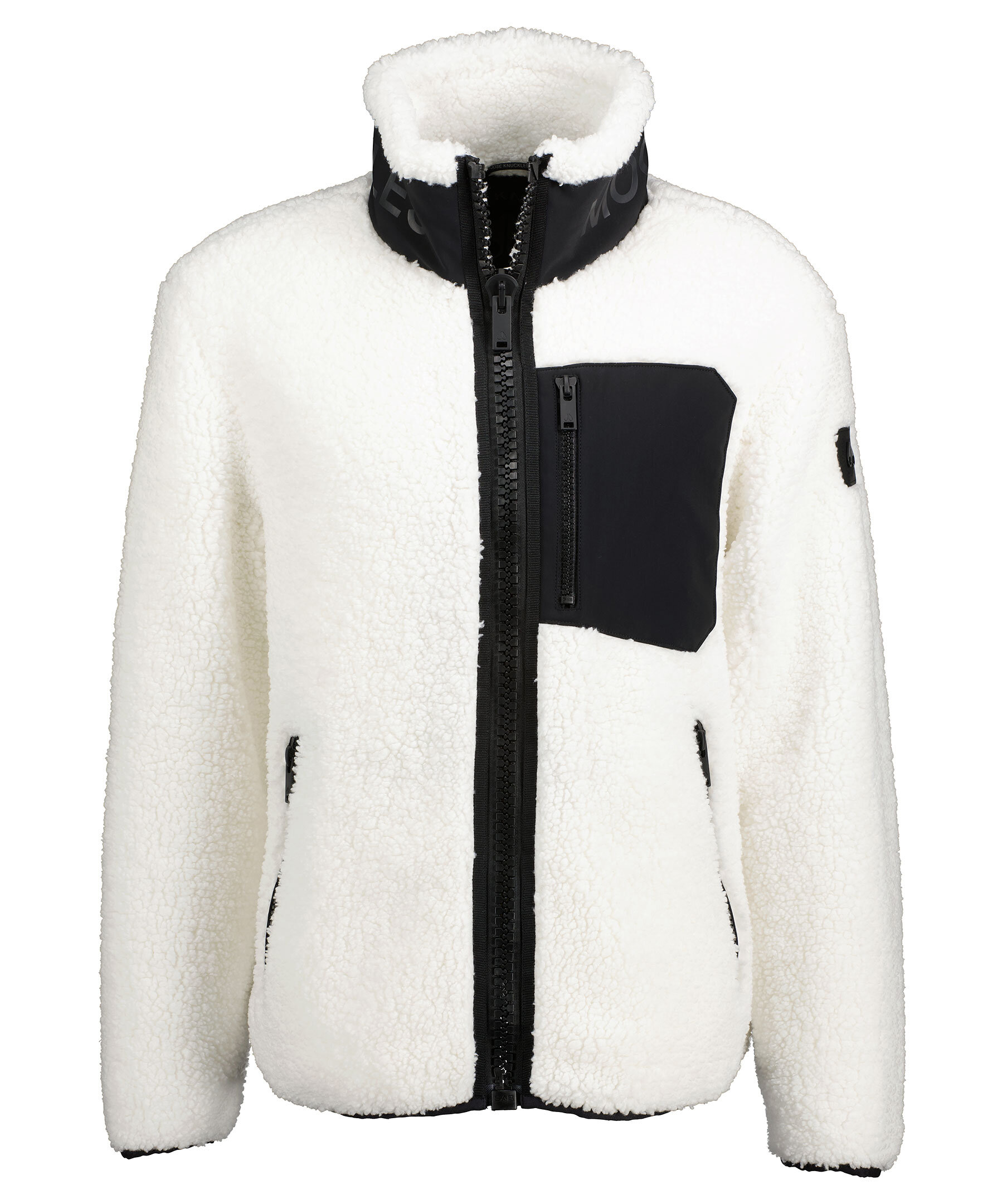 Vit pilejacka med svarta detaljer från Moose Knuckles. Hög krage med mattsvart logga, grov dragkedja framtill, tre fickor fram, två innerfickor samt logotyp på vänster ärm. Tillverkad i polyester. Avslappnad passform.
