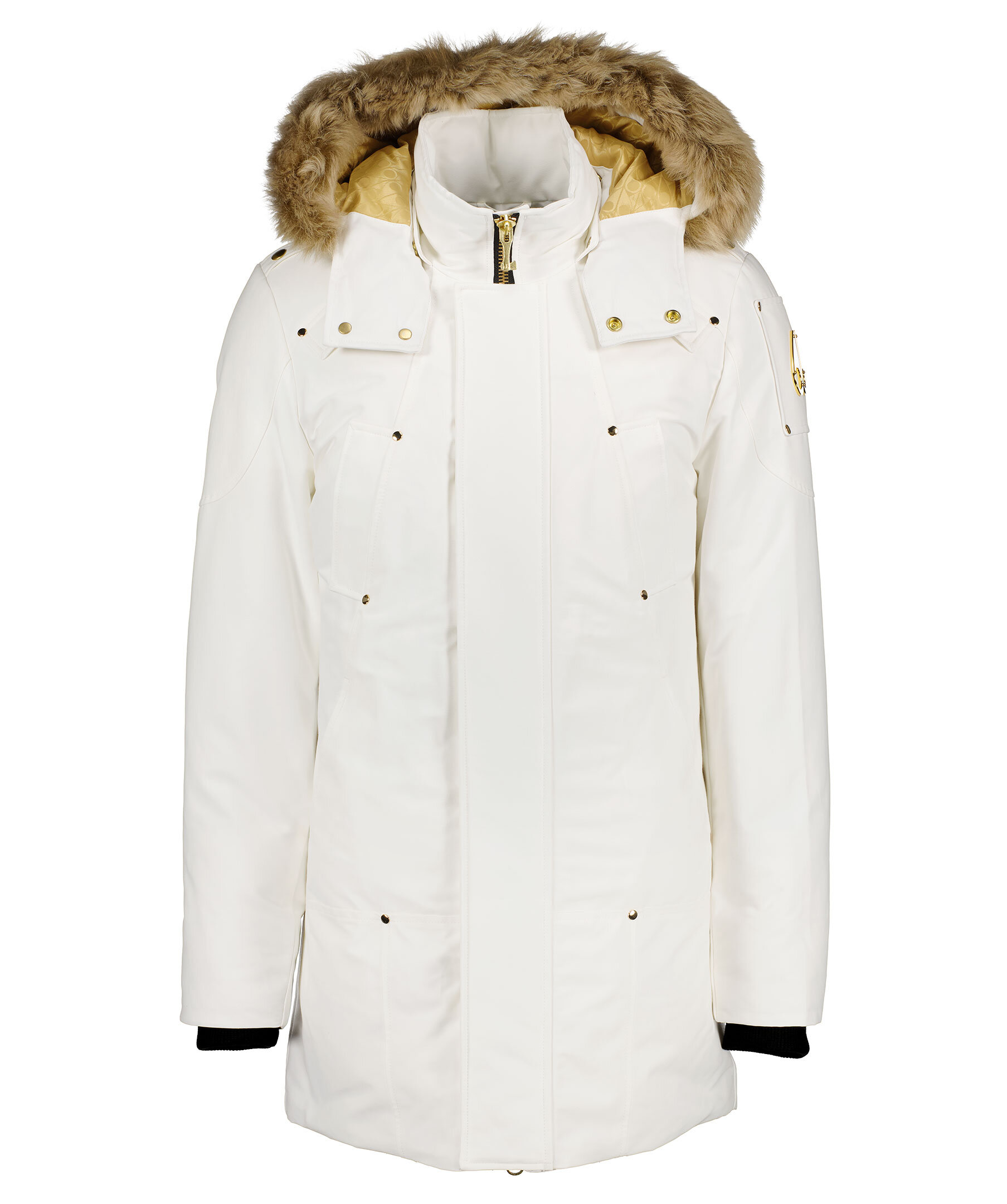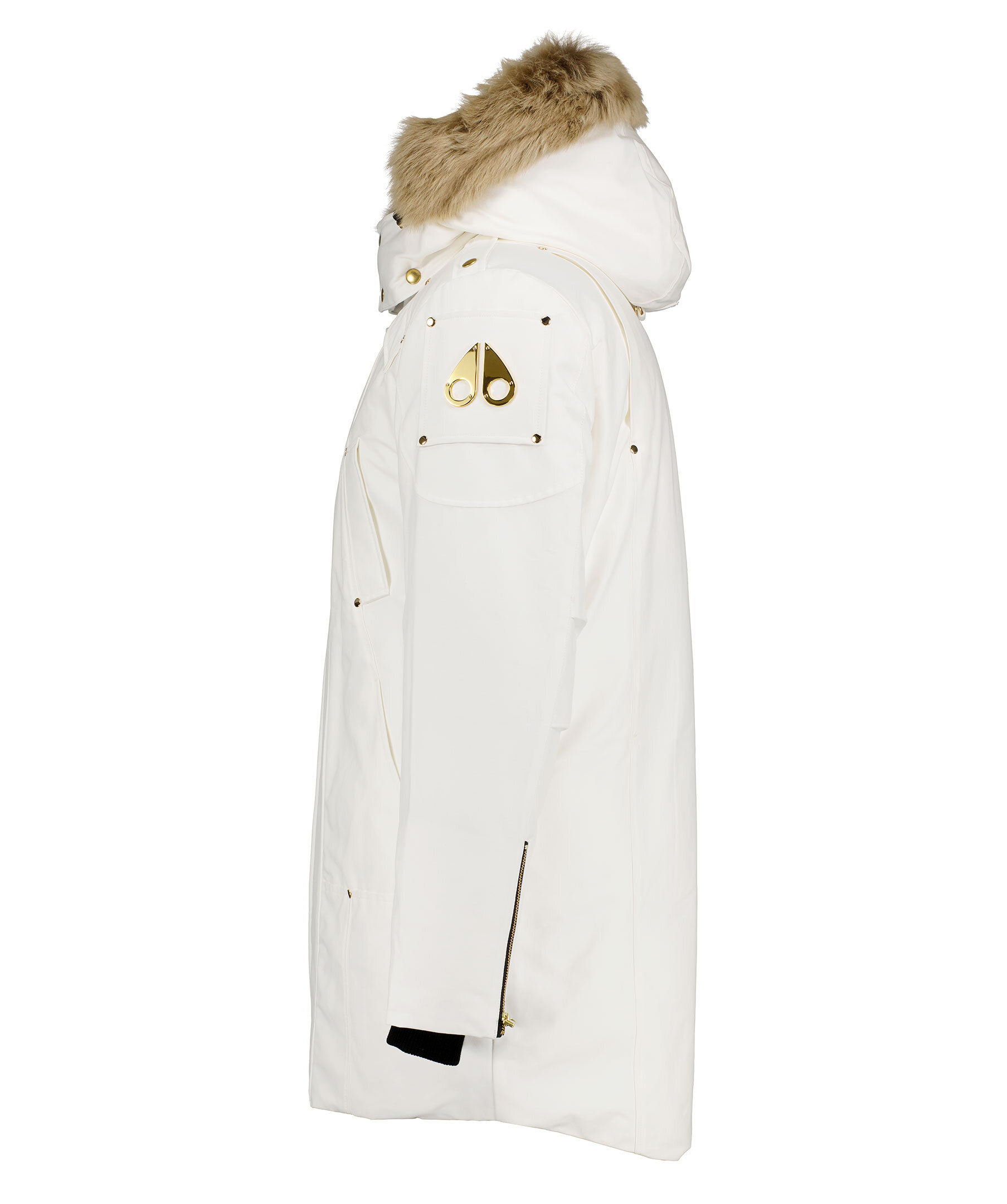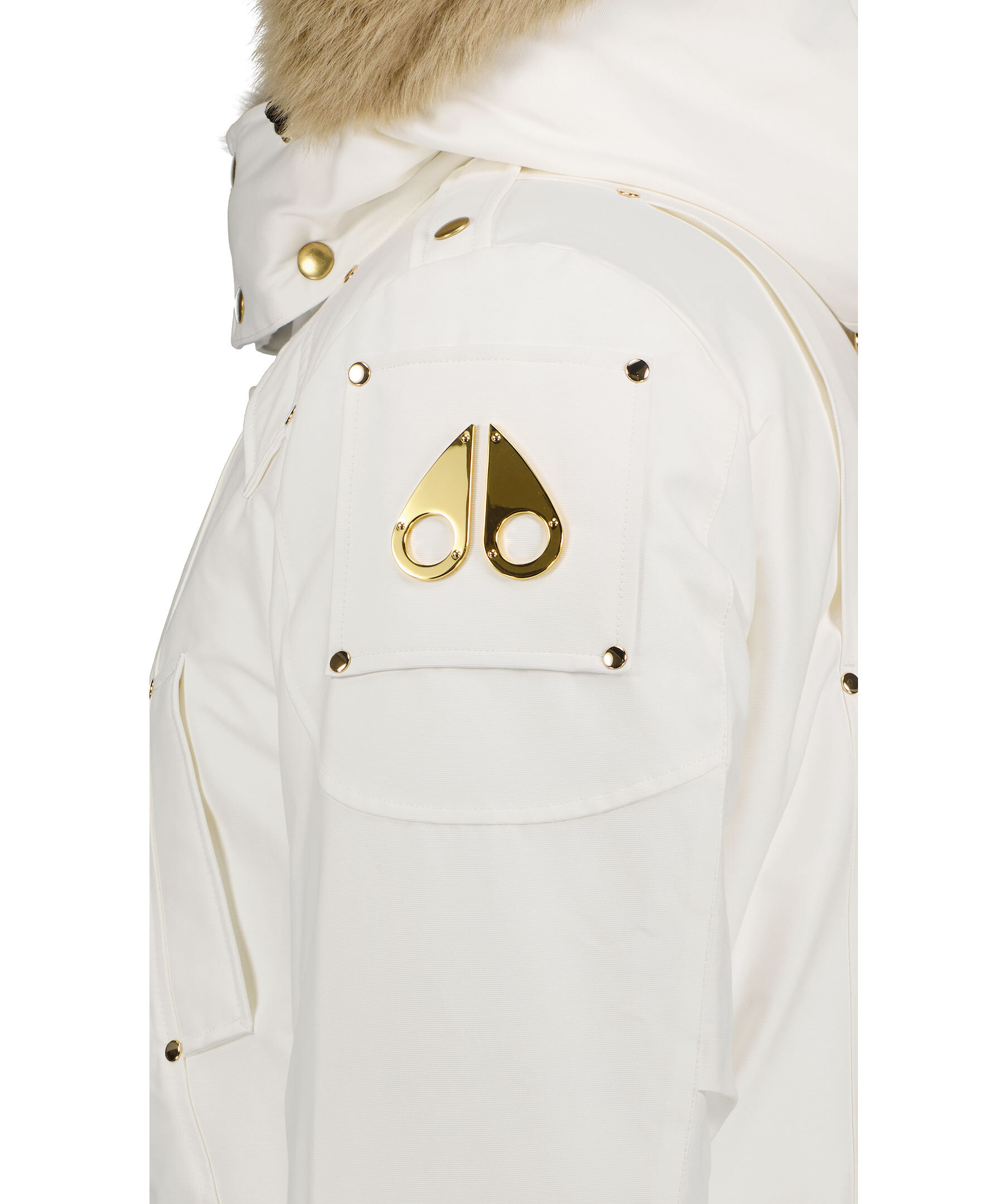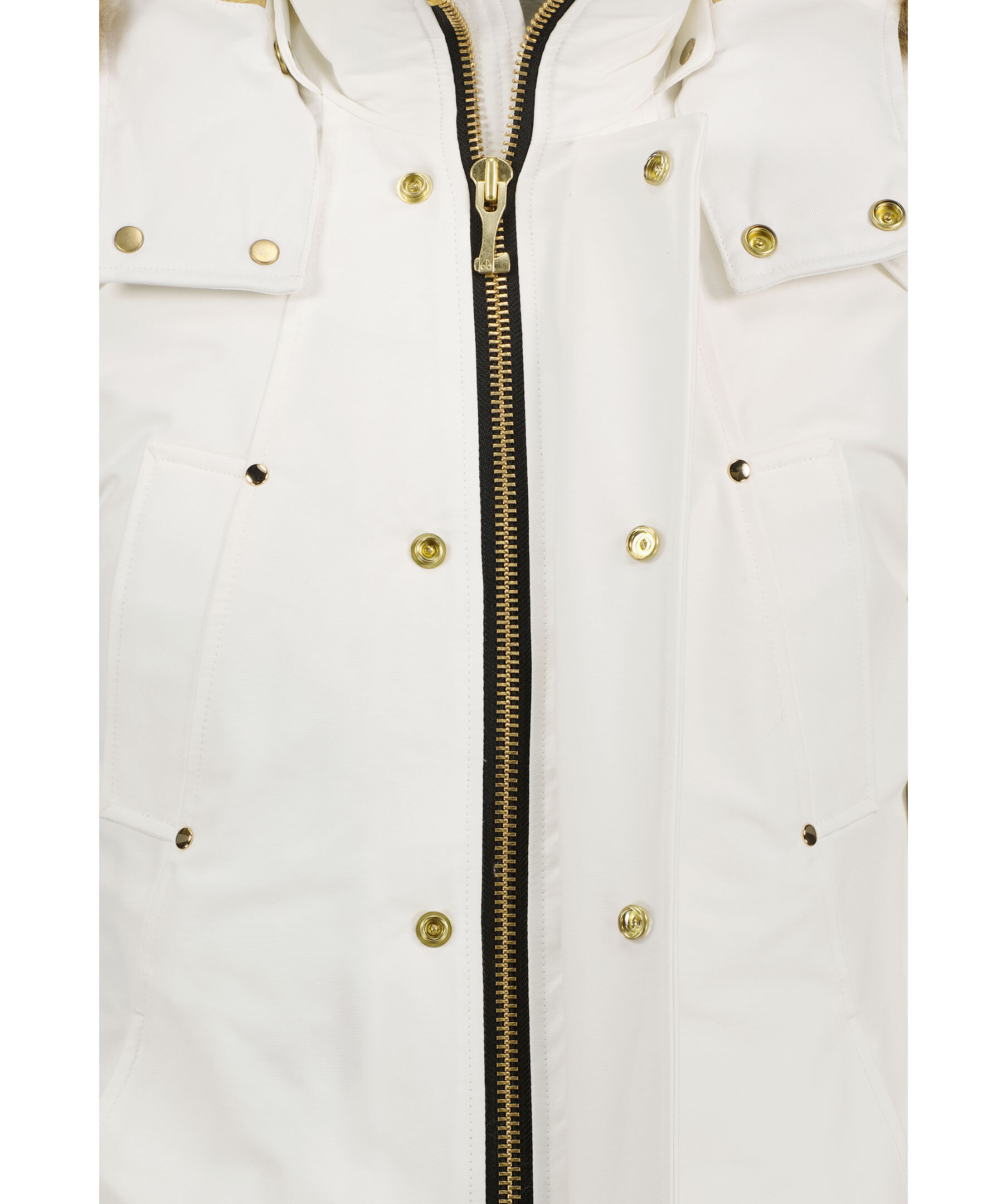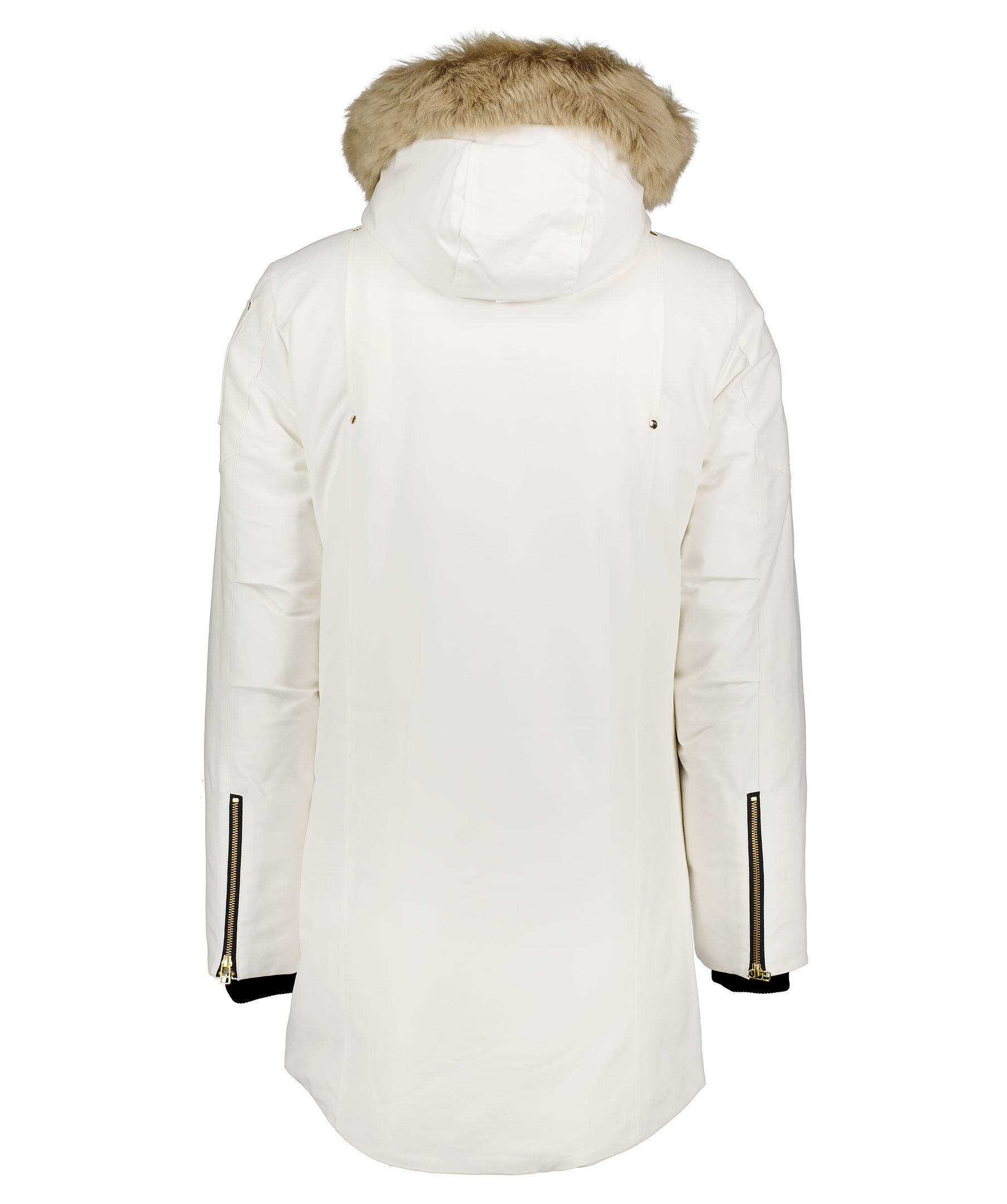 Vit parkas från Moose Knuckles. Stängs framtill med tvåvägsdragkedja och tryckknappar. Avtagbar luva med pälskrage och dragsko. Fyra fickor framtill. Innerficka med dragkedja. Ribbstickad muddar vid ärmslut. Guldfärgad logotyp på vänster ärm. Guldfärgade detaljer i metall.