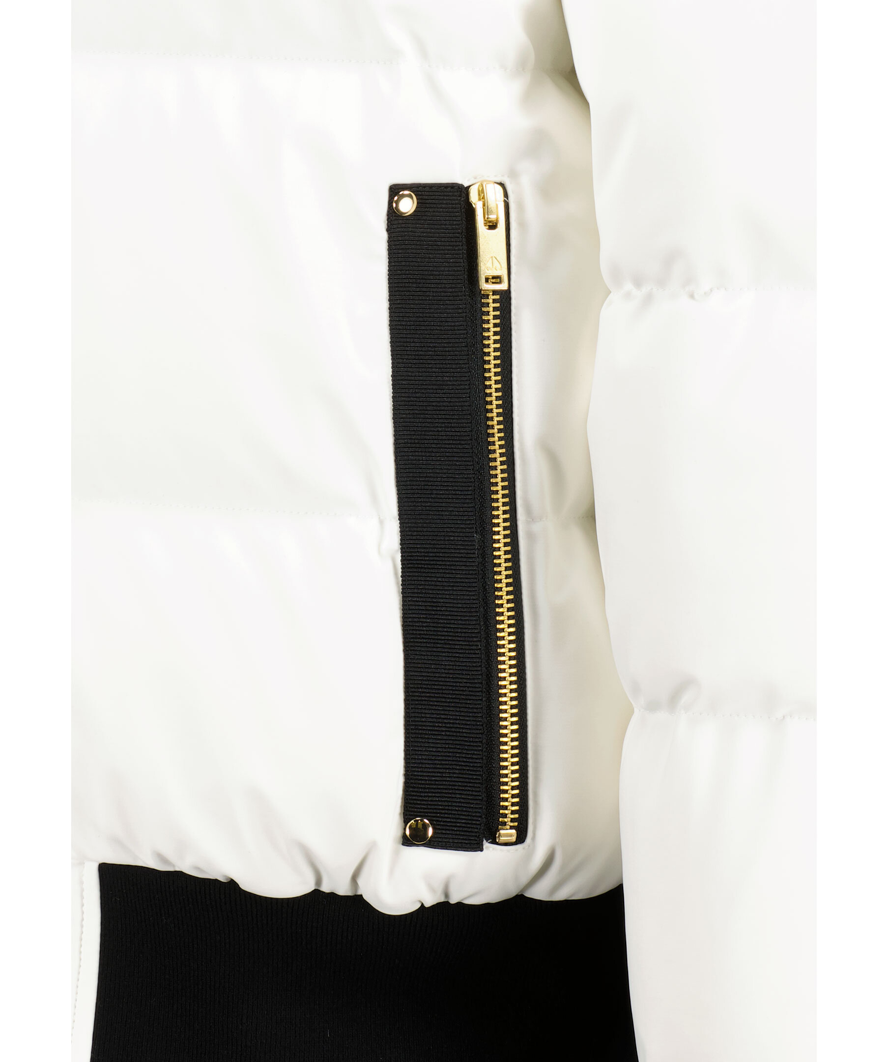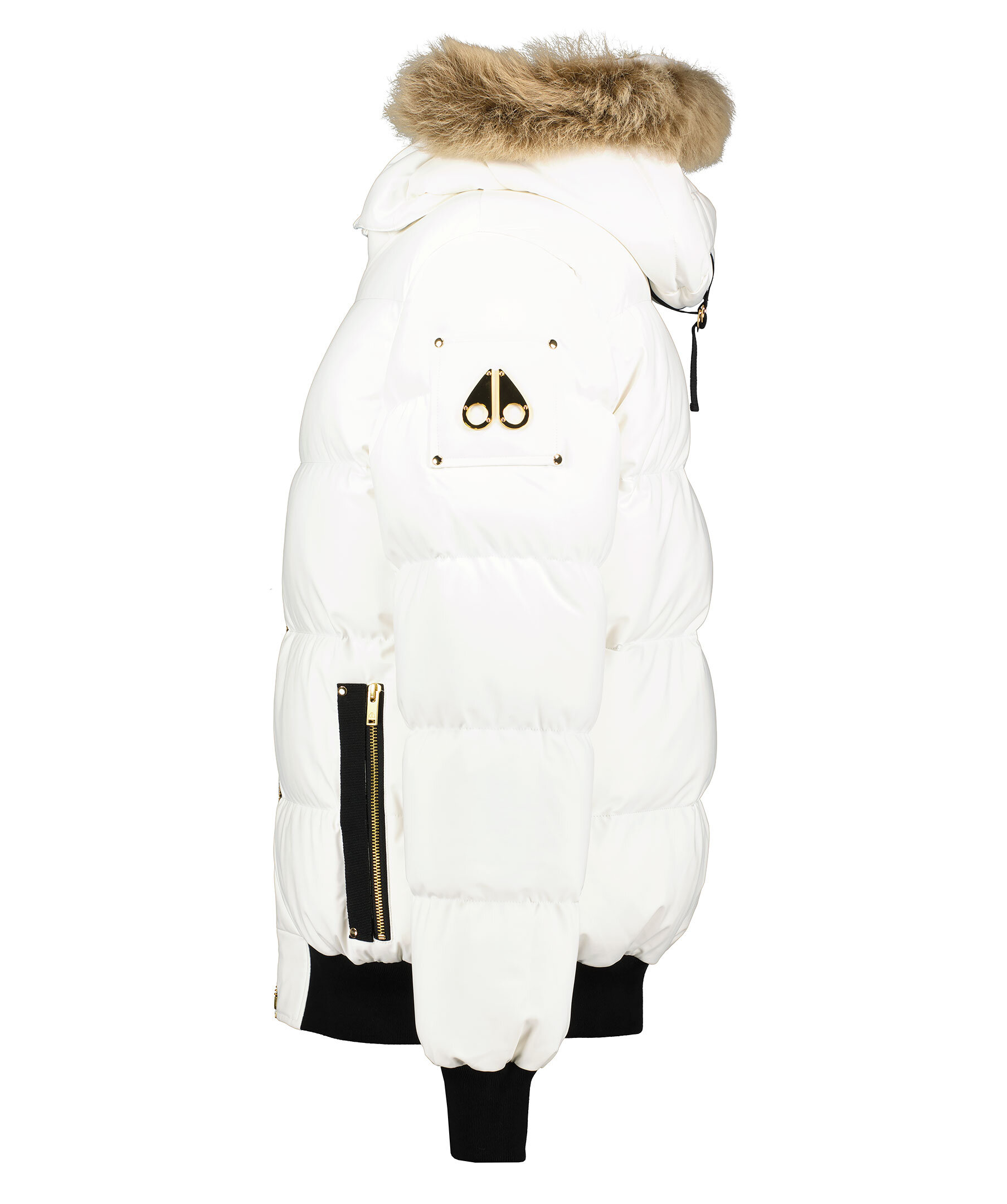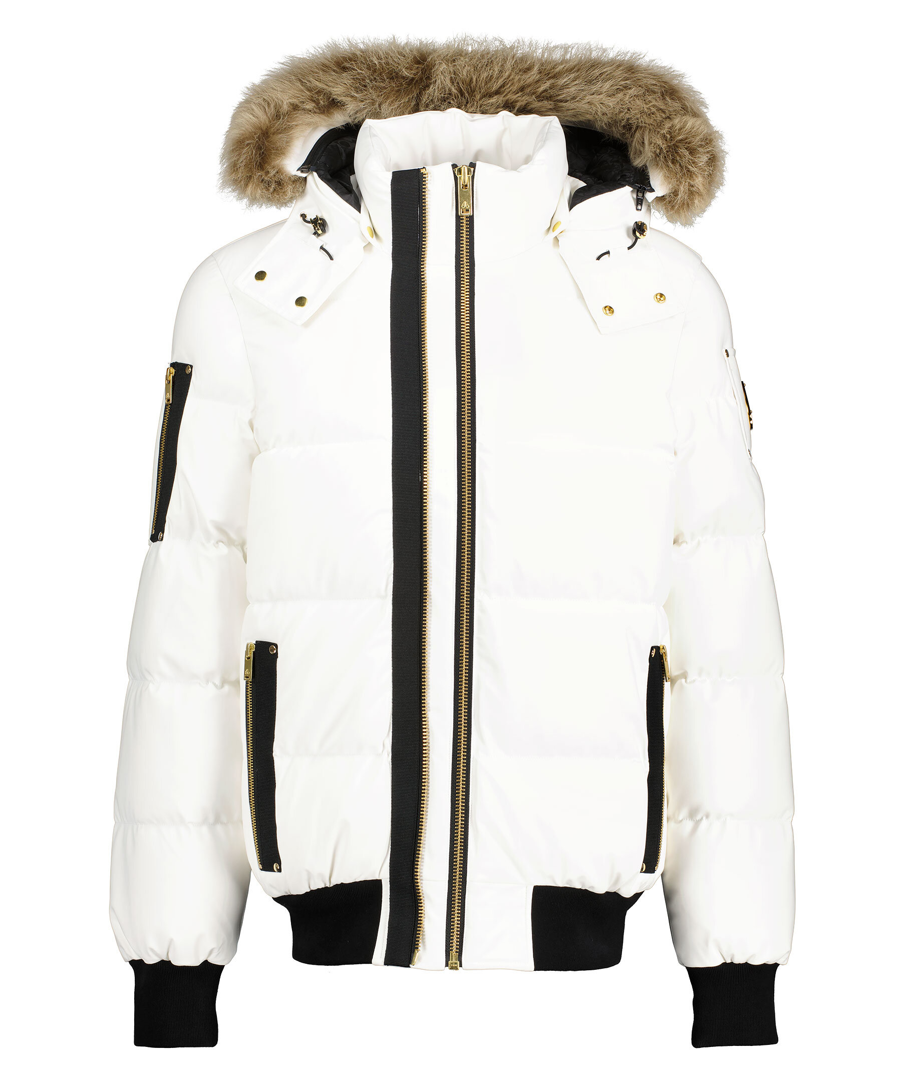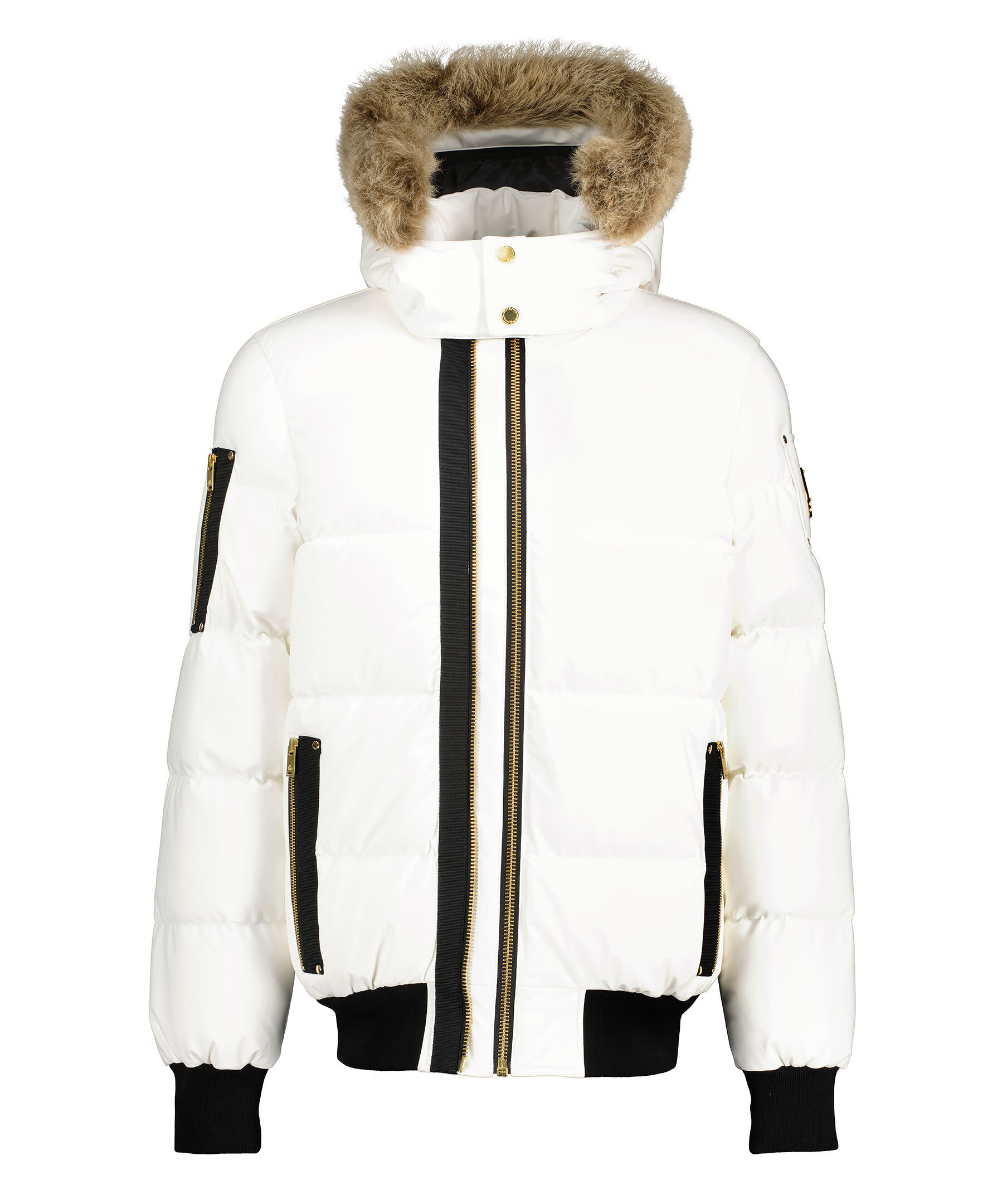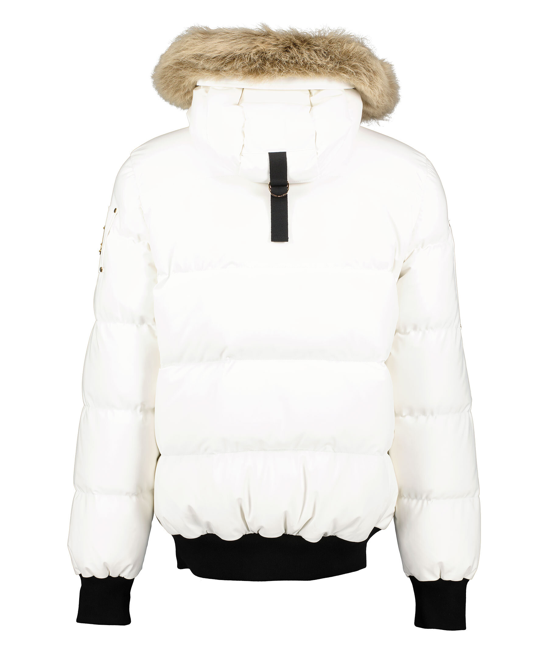 Vit bomberjacka från Moose Knuckles med avtagbar pälshuva. Tillverkad i nylon/polyuretan. Stängs med dragkedja framtill. Två sidfickor samt två invändiga fickor med dragkedja. Dragkedjeficka på höger ärm. Metall logotyp på vänster ärm. Ribbstickad manschett och midjeband.