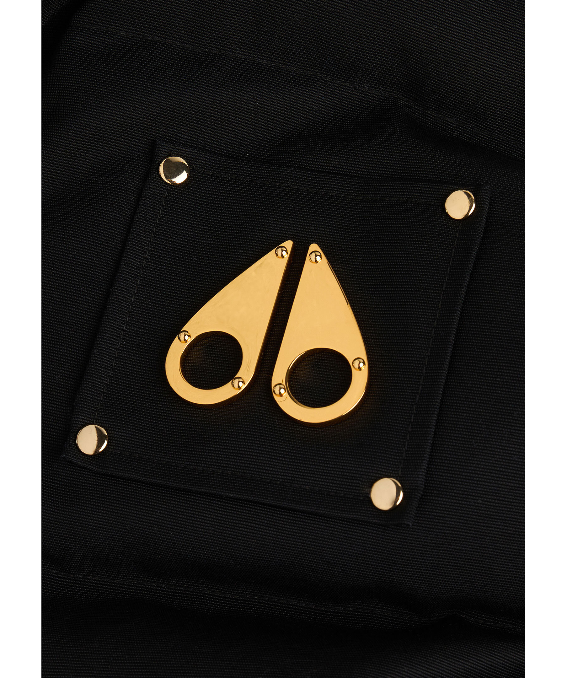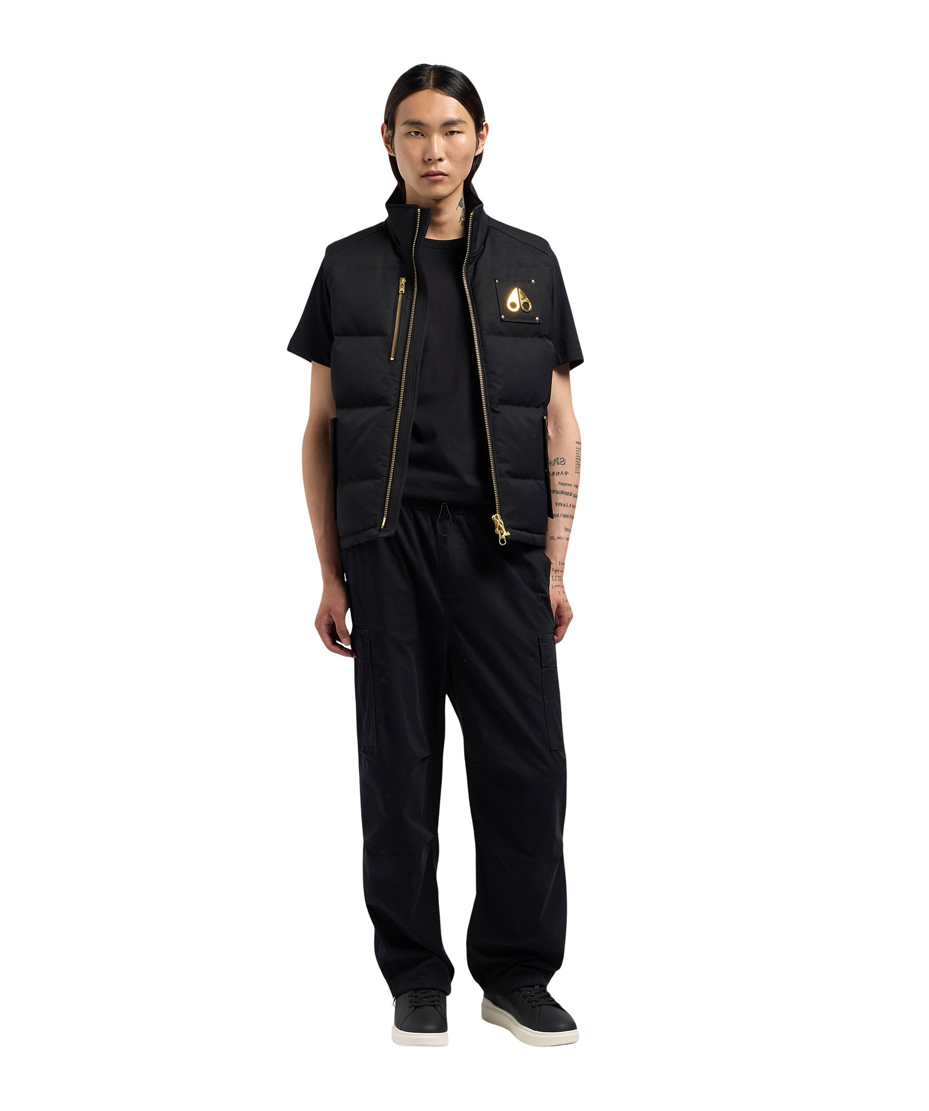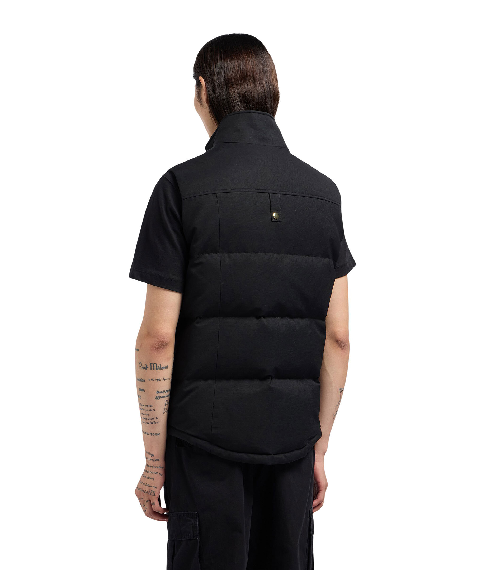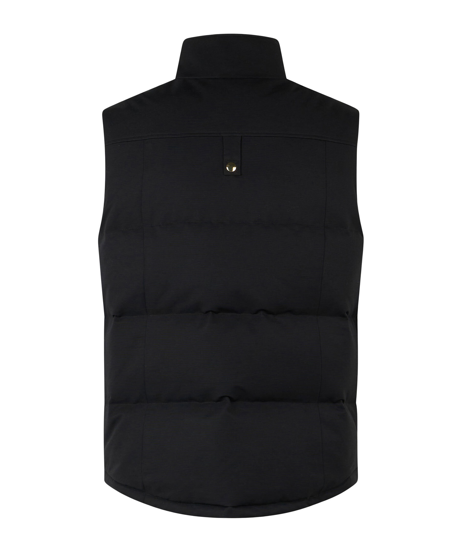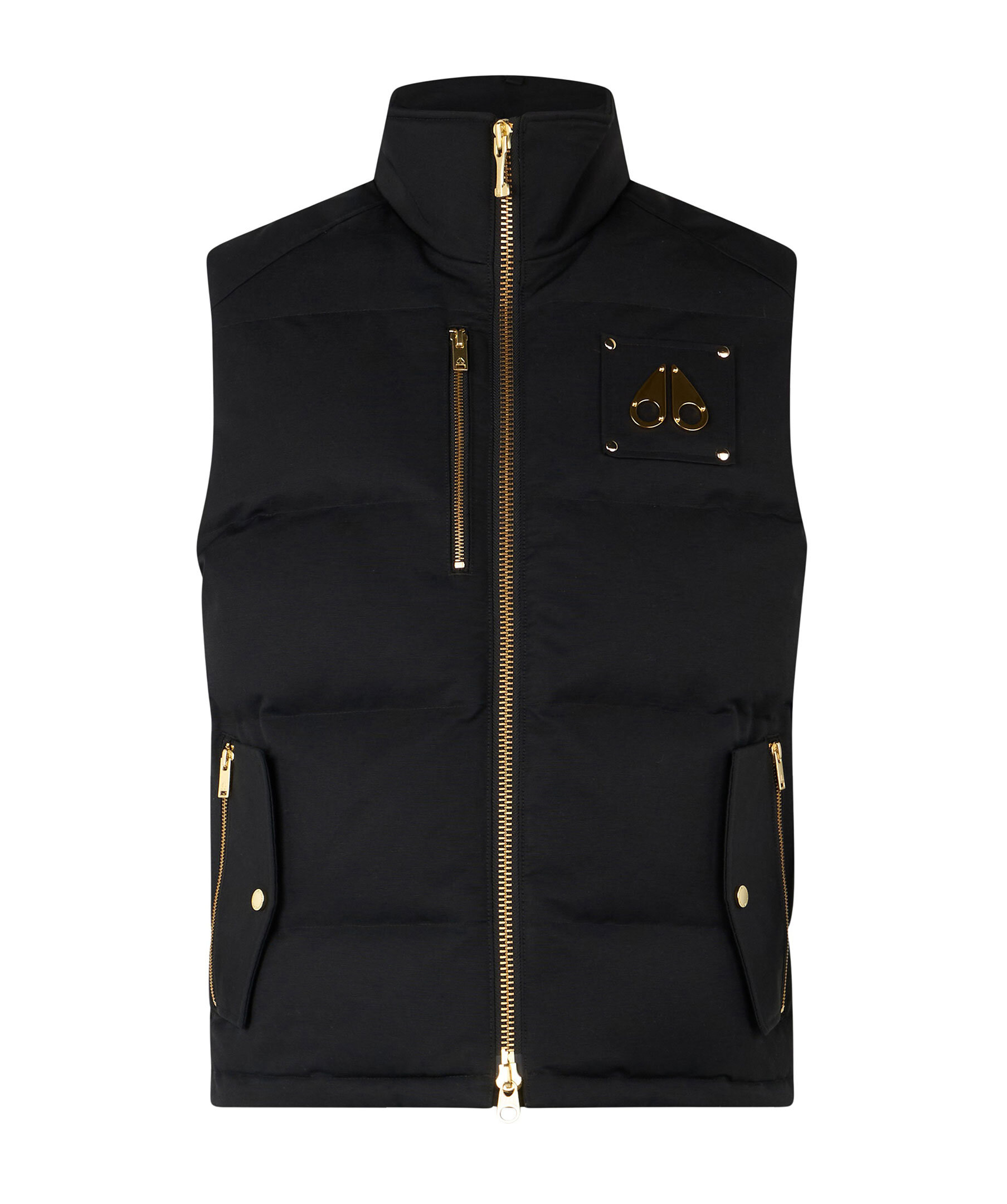 Svart väst från Moose Knuckles. Västen stängs med tvåvägsdragkedja och har två sidfickor med dragkedja, två sidfickor med knapp samt en bröstficka med dragkedja, alla har ett mjukt foder i konstpäls. Patch och logotyp i guldfärgad metall på bröstet. Tillverkad i en bomullsblandning.