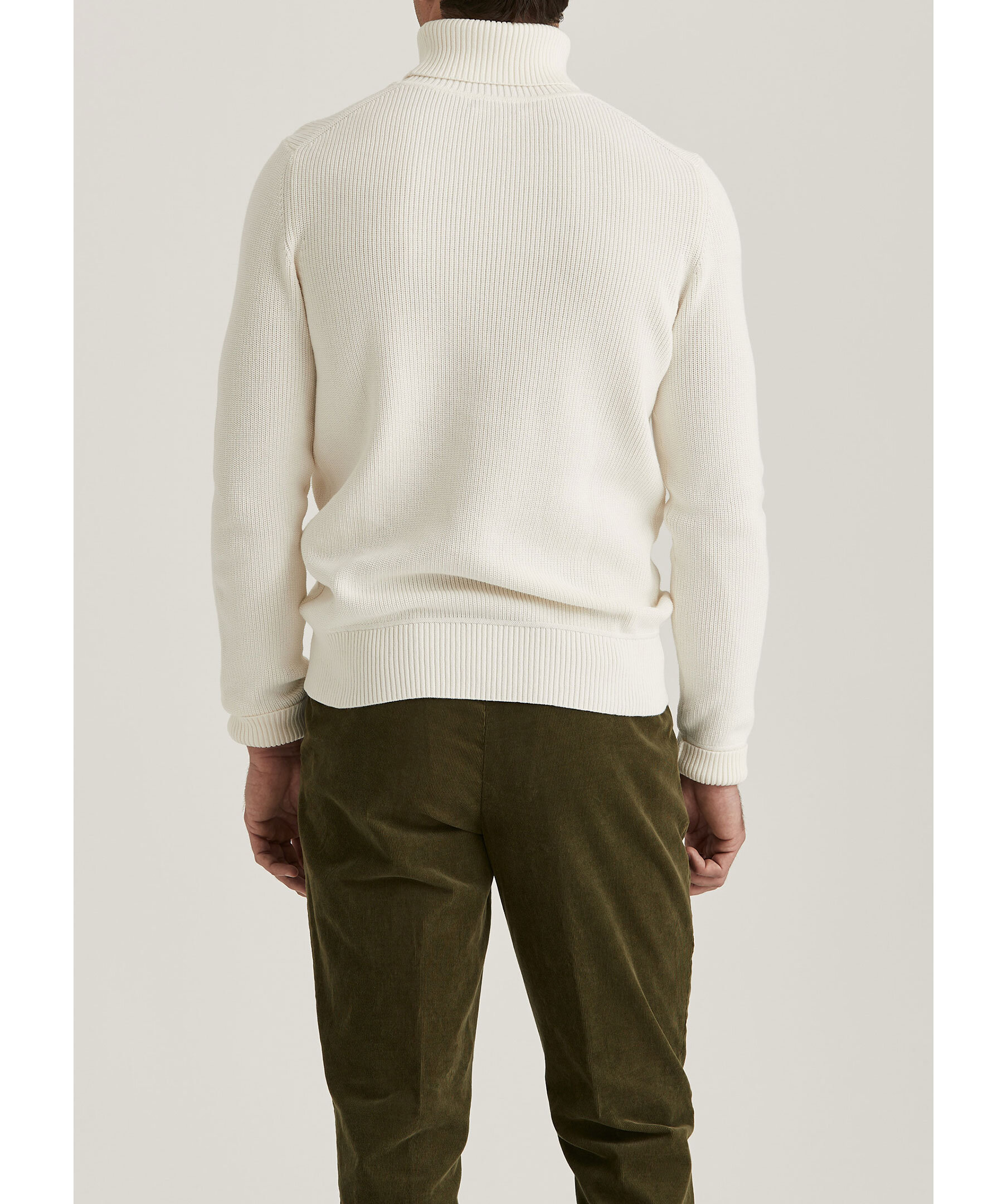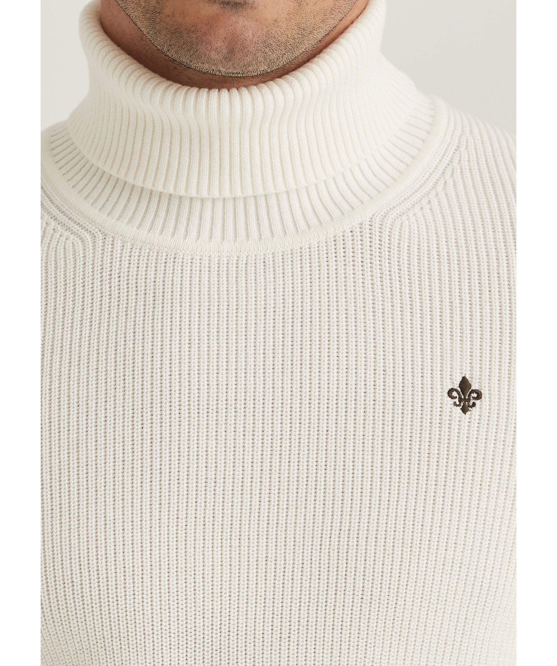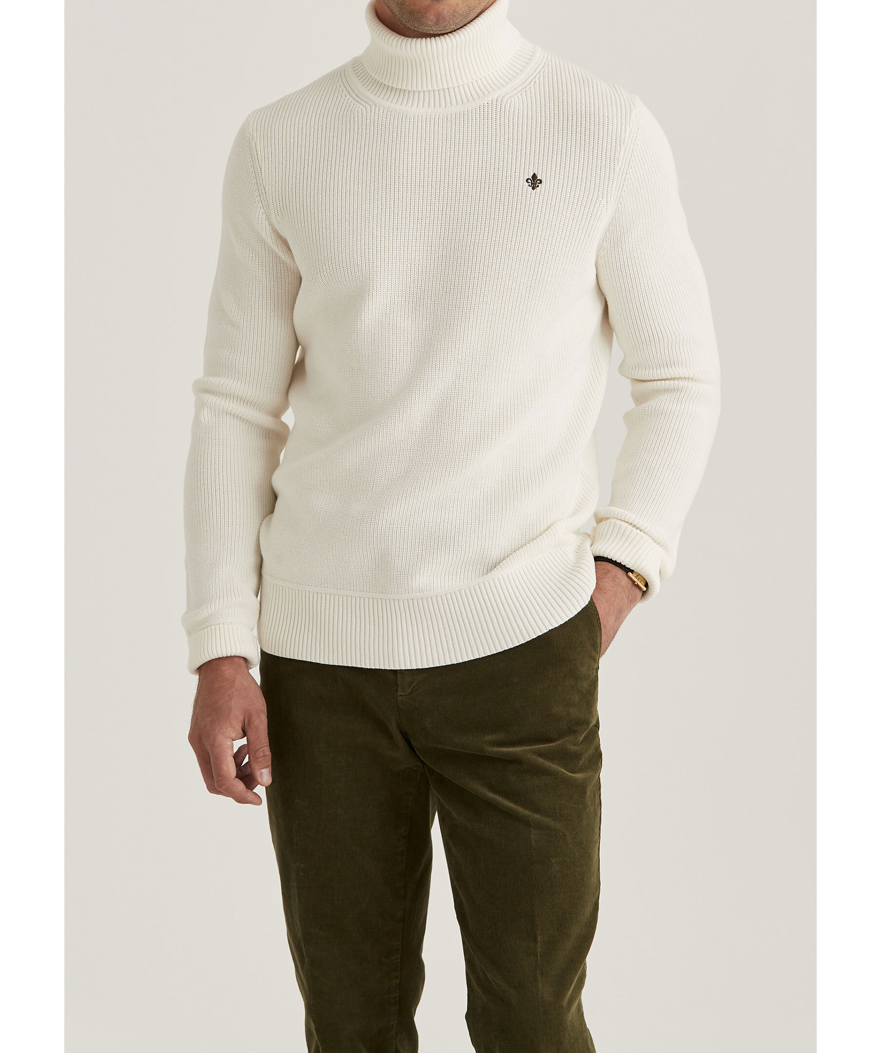 Krämvit, stickad polotröja från Morris. Tröjan är ribbstickad och har broderad lilja på bröstet. Tillverkad i bomull.