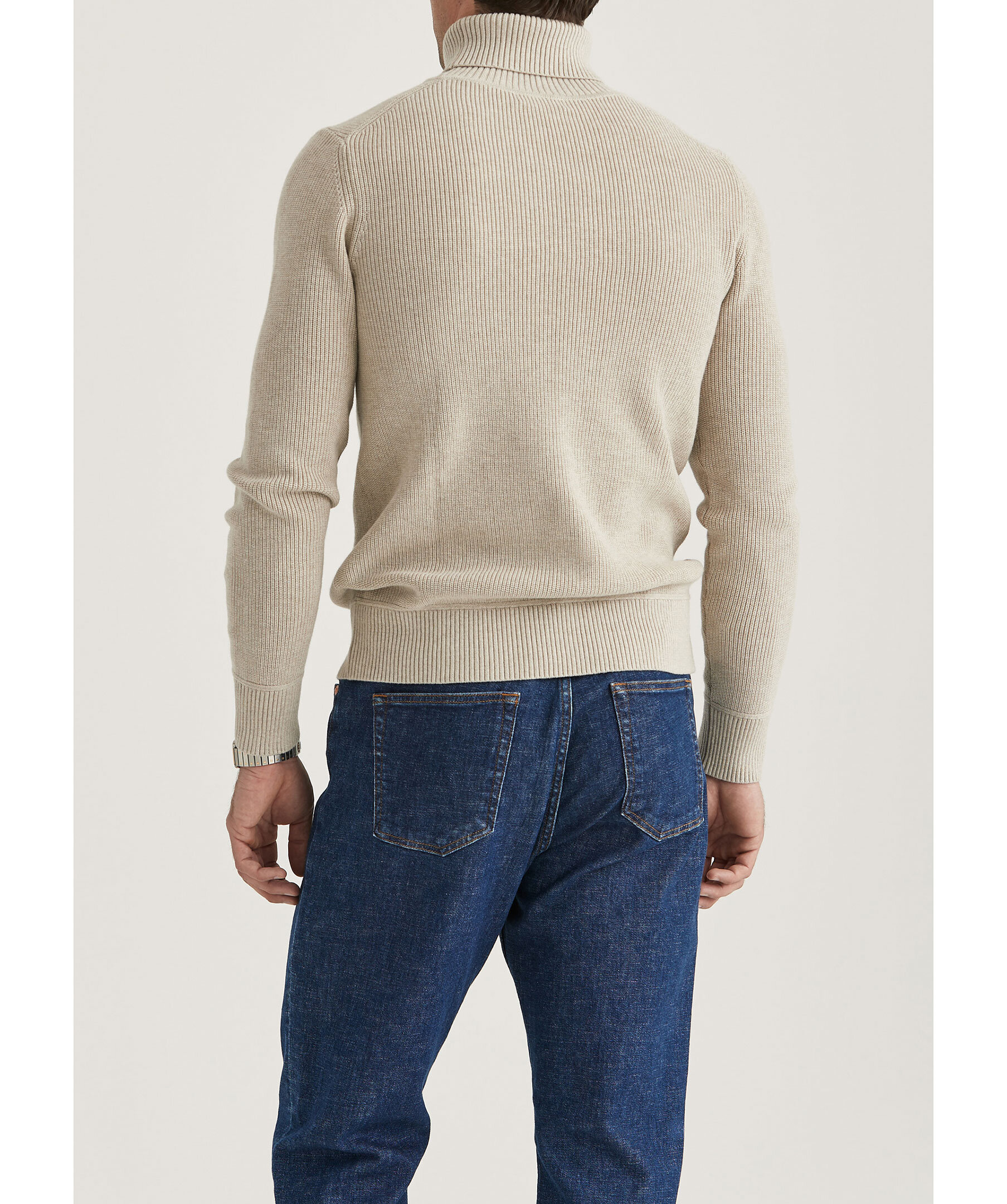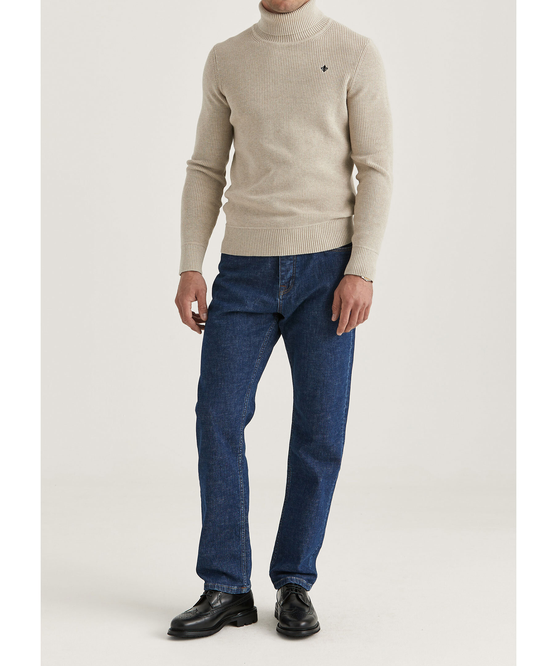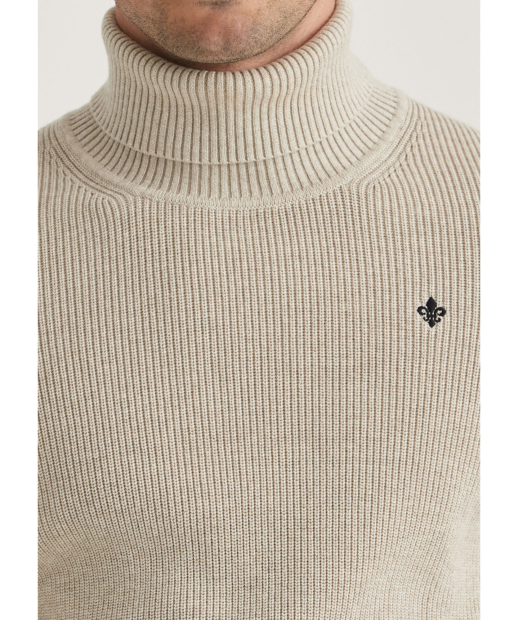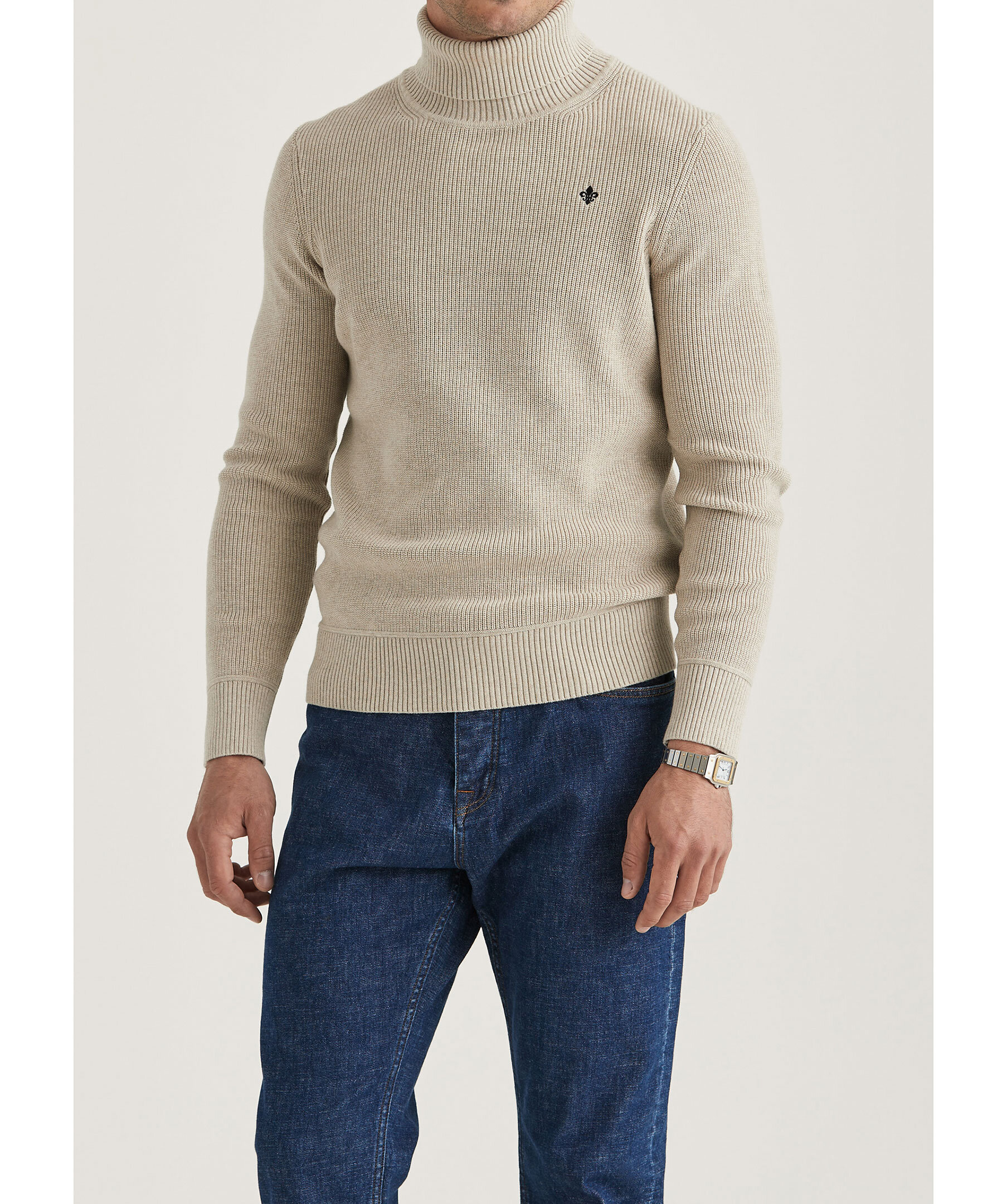 Khakifärgad, stickad polotröja från Morris. Tröjan är ribbstickad och har broderad lilja på bröstet. Tillverkad i bomull.