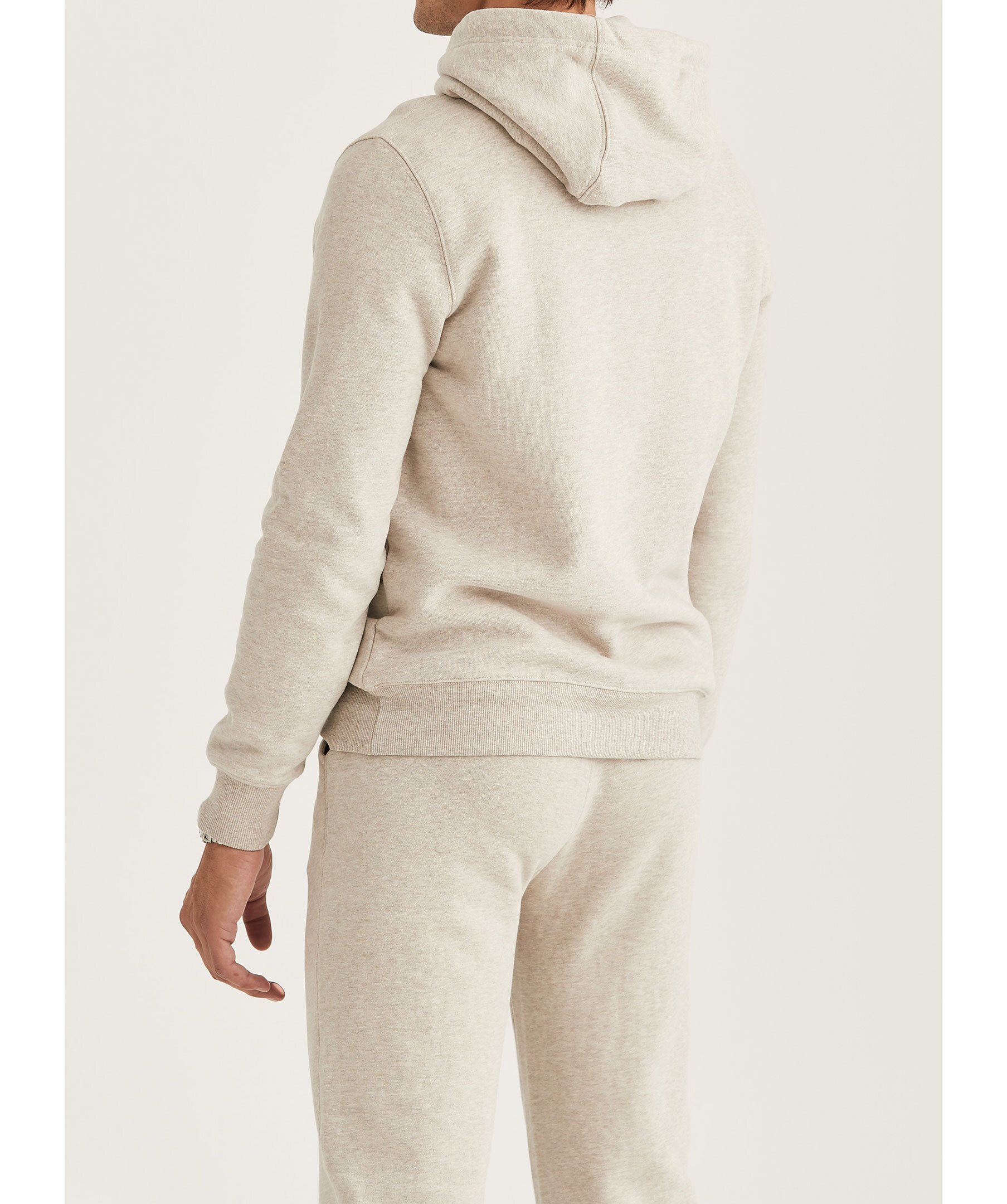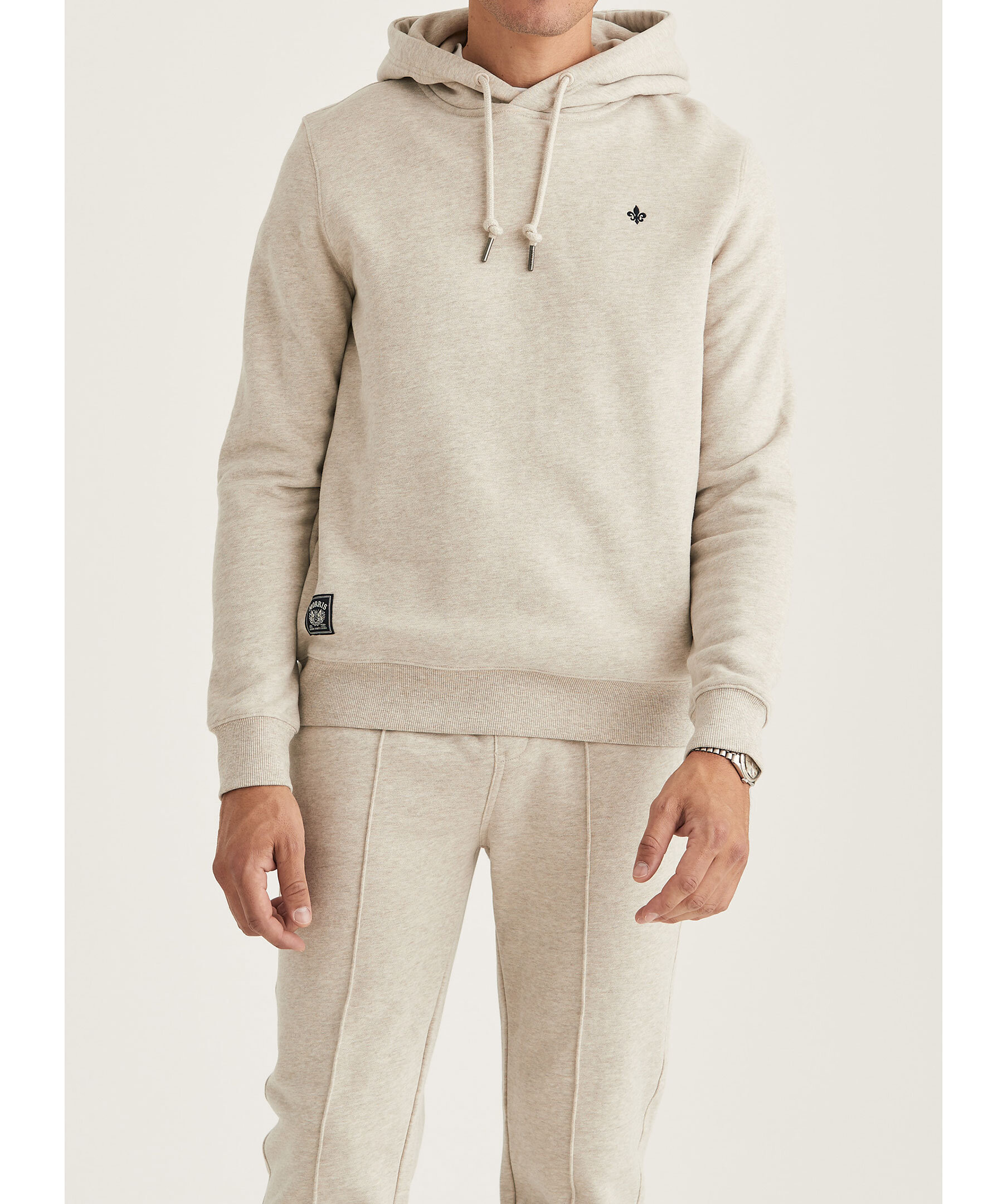 Khakifärgad hoodie från Morris. Tjocktröjan har huva med dragsko, ribbstickade muddar samt broderad signaturlilja på bröstet. Tillverkad i 100% borstat bomullstyg.
