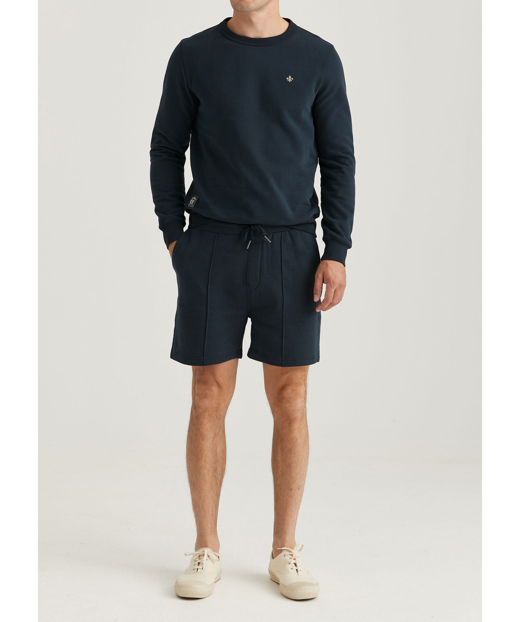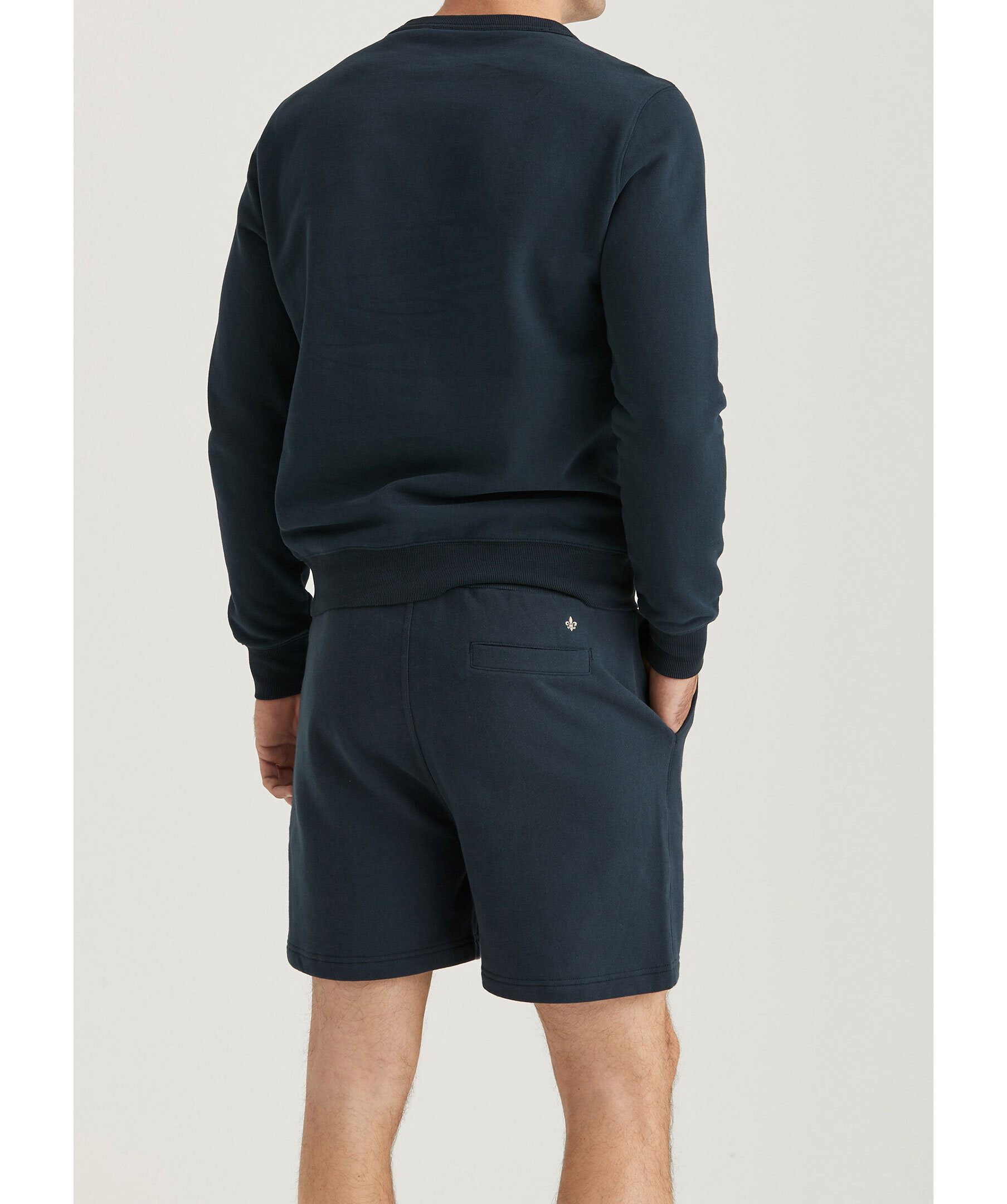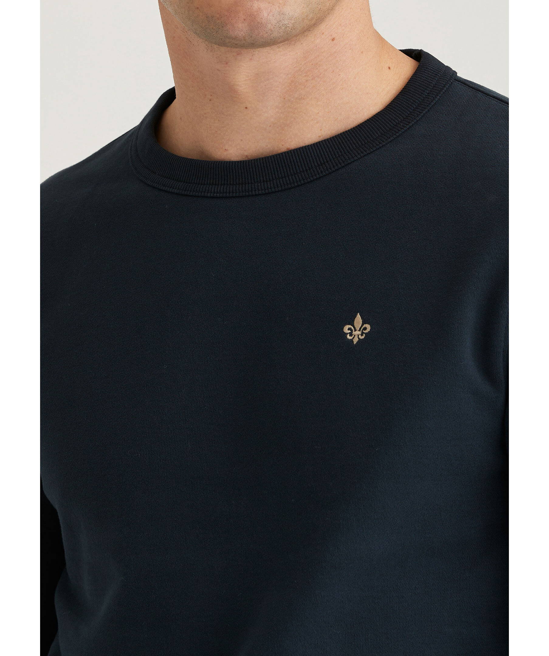 Marinblå sweatshirt från Morris. Tillverkad i en 100% borstad bomullskvalité. Tröjan pryds av en liljebrodyr på bröstet samt en dekorativ etikett vid nedre ribben.