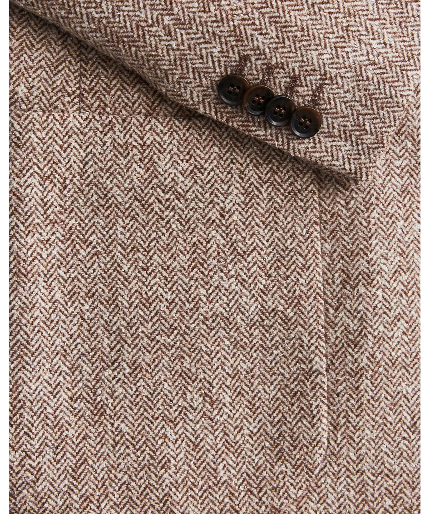 Brun fiskbensmönstrad kavaj från Morris. Det strukturerade tyget ger en unik yta och de påsydda fickorna ger ett modernare uttryck. Passar lika bra över en skjorta som att bäras för sig själv.