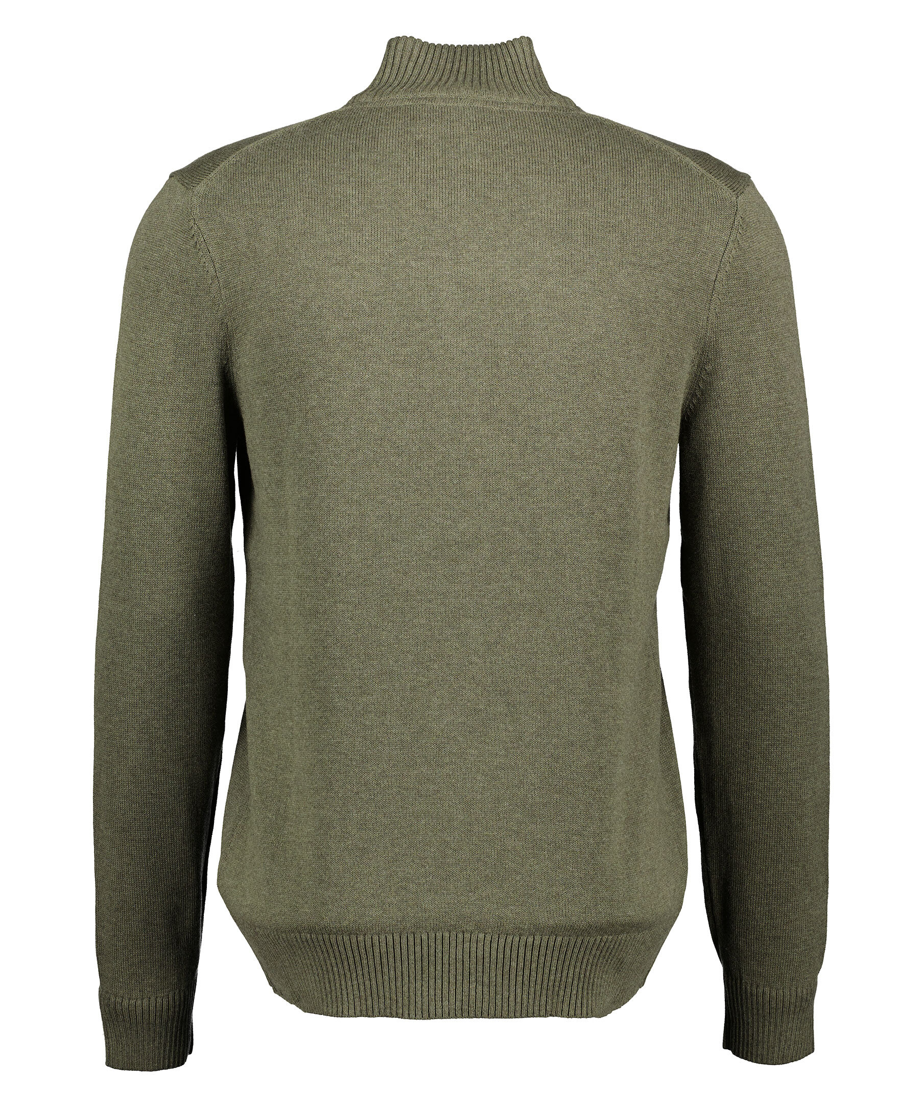 Grön finstickad half zip tröja från Morris. Liten broderad fransk lilja på bröstet. Ribbstickade krage samt muddar vid ärm- och plaggslut. Tillverkad i 100% bomull.