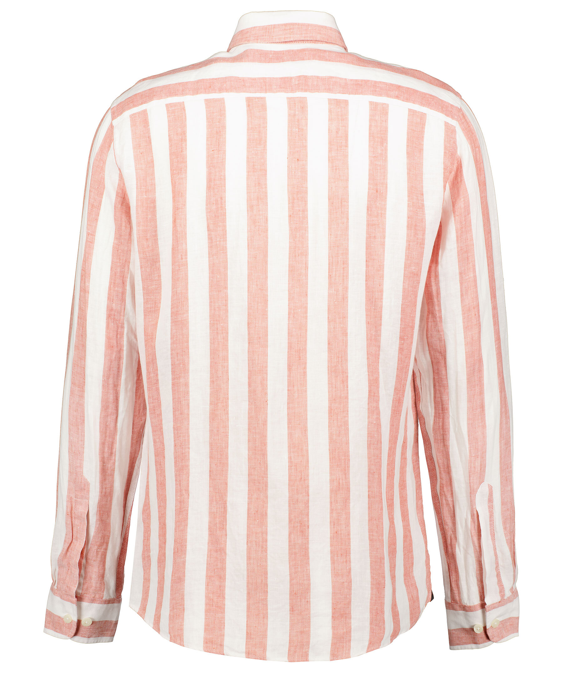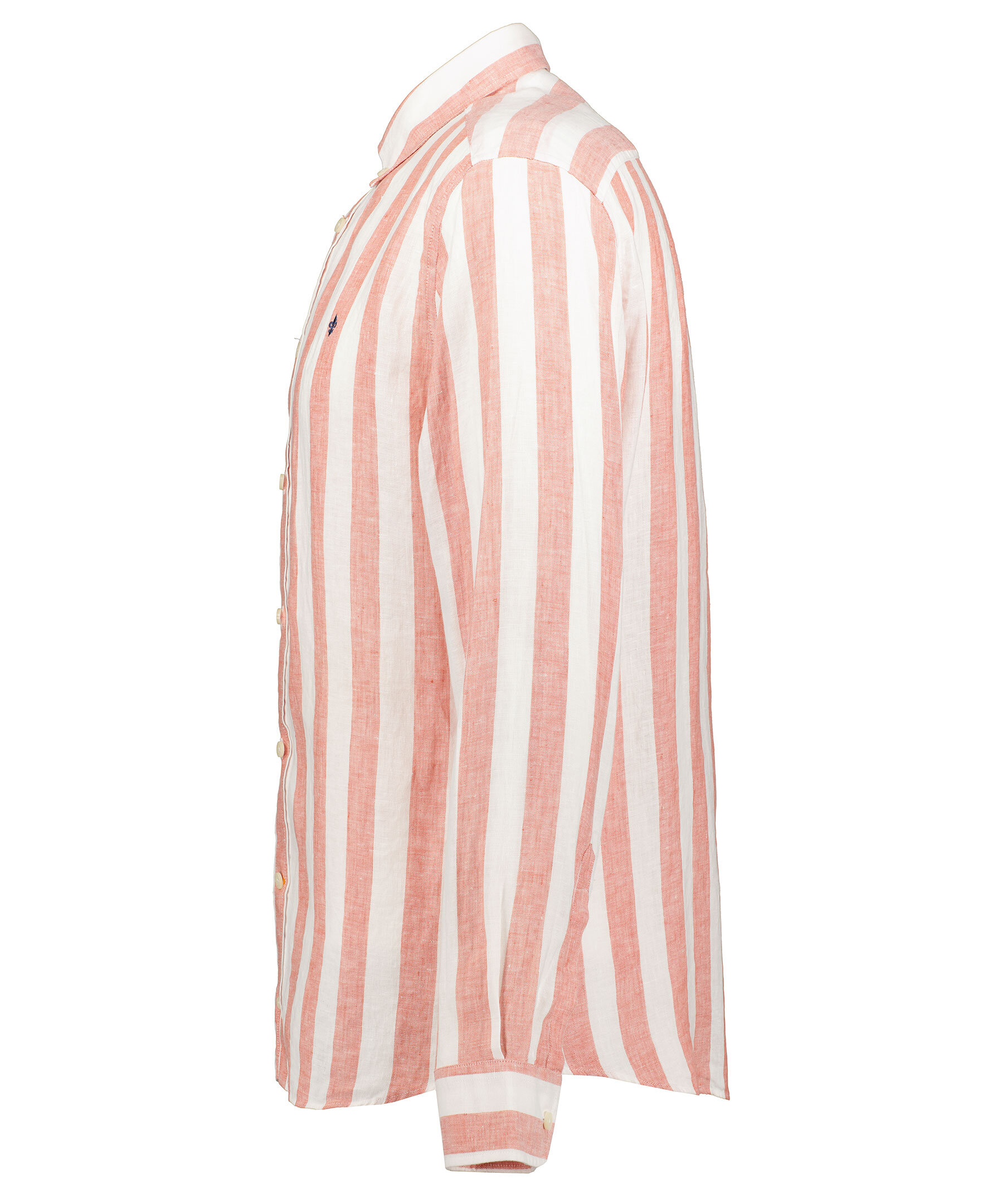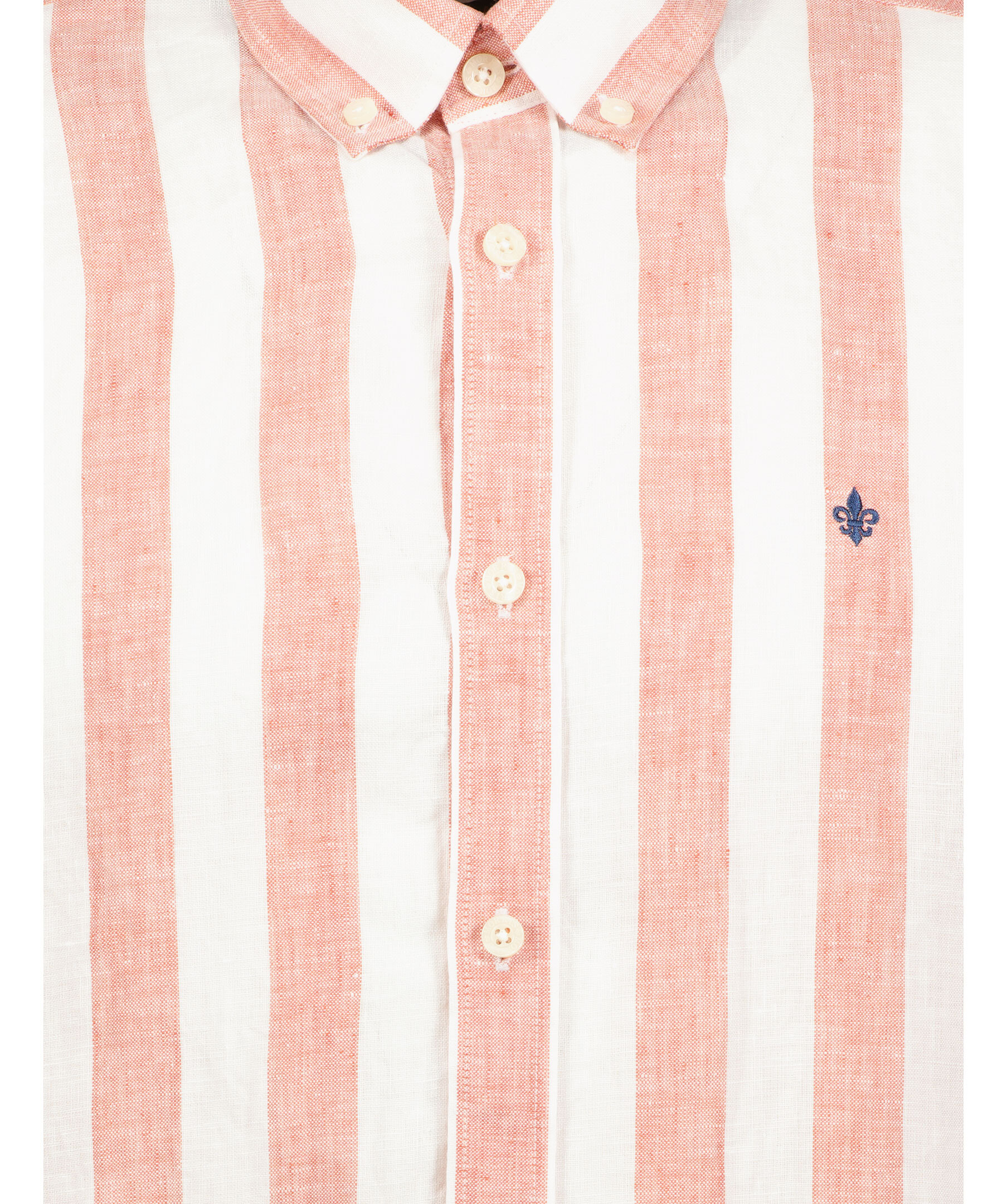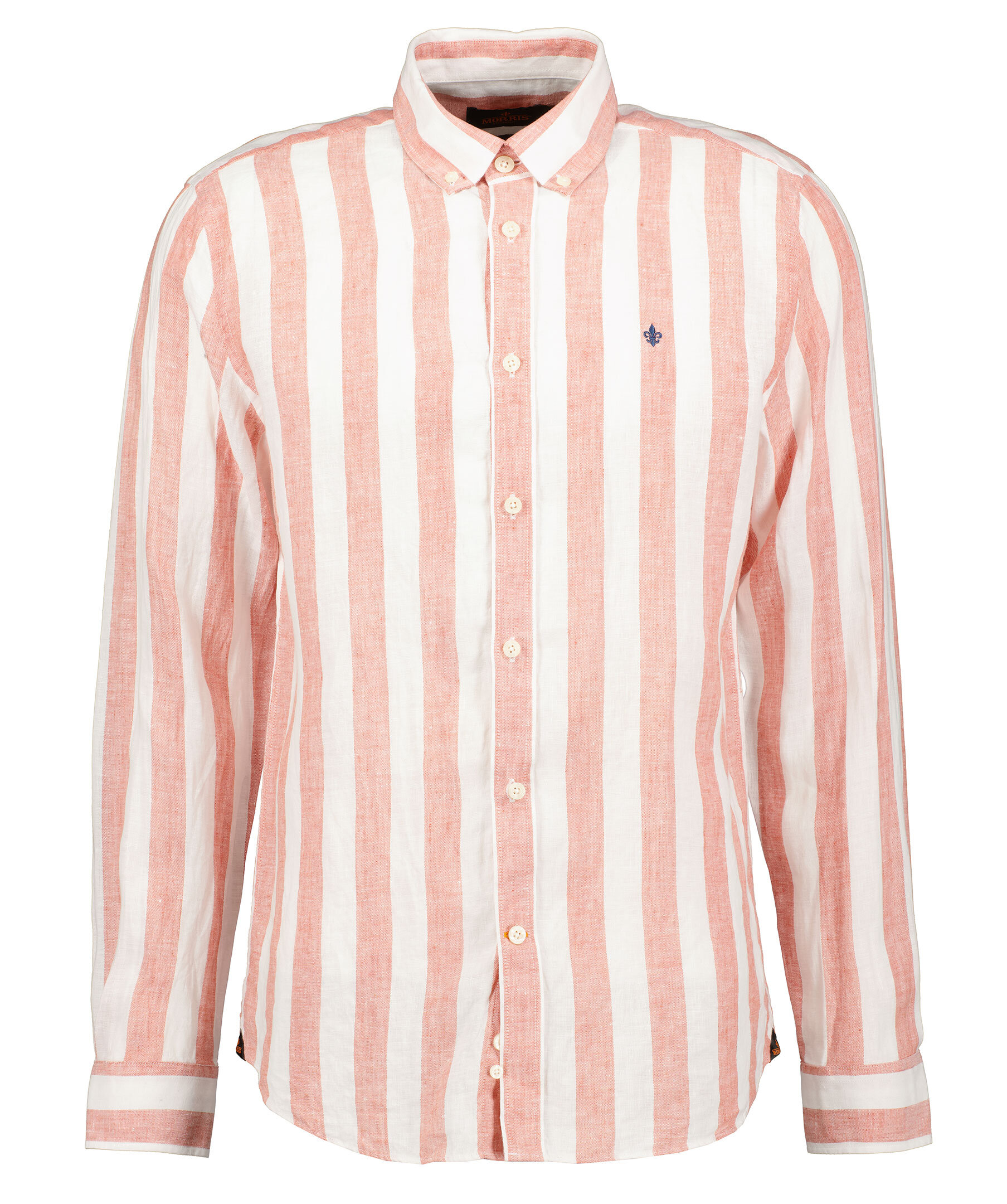 Röd och vit linneskjorta från Morris. Stängs framtill med knappar. Button down-krage. Broderad lilja på vänster bröst. Enkla manschetter.
