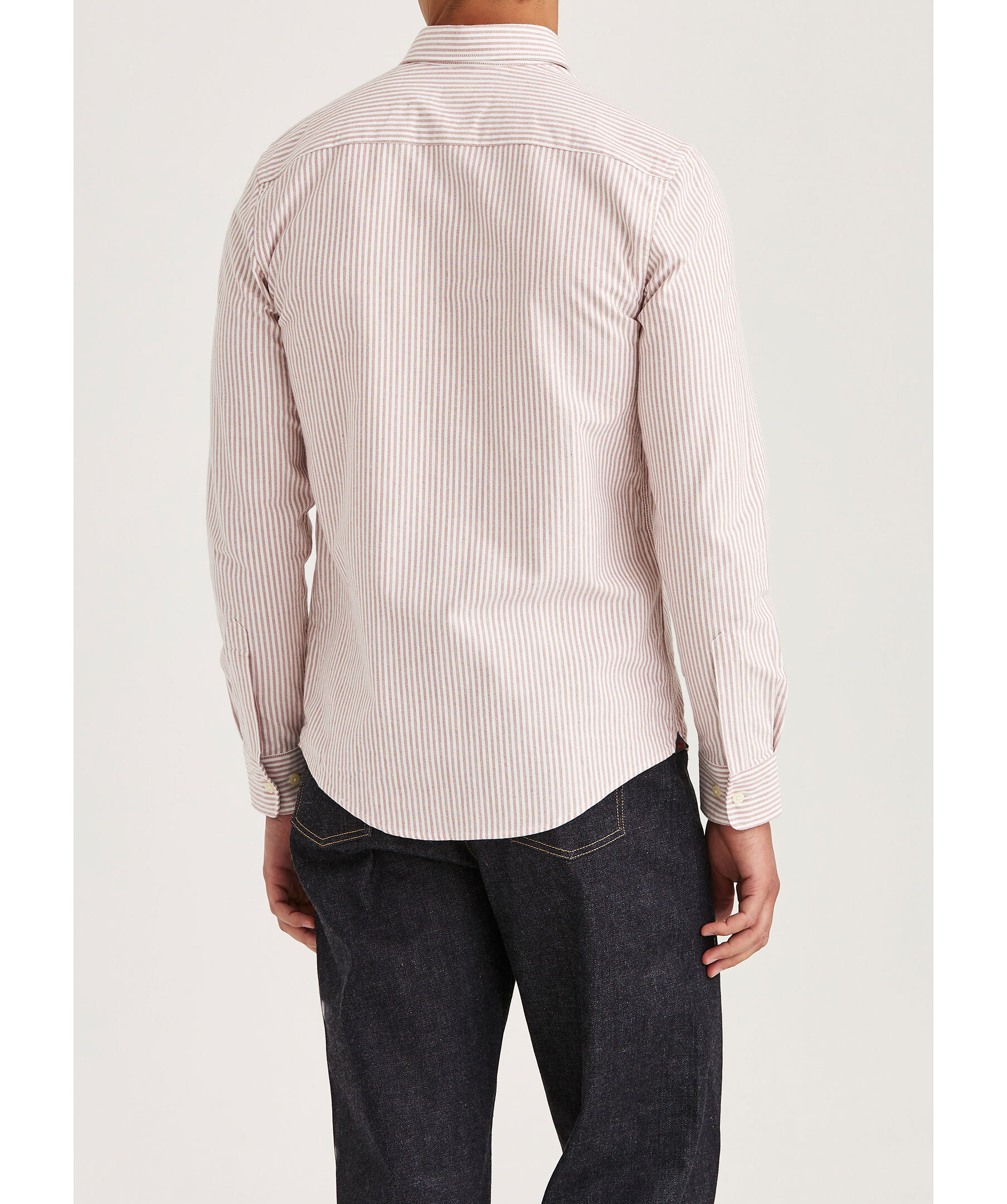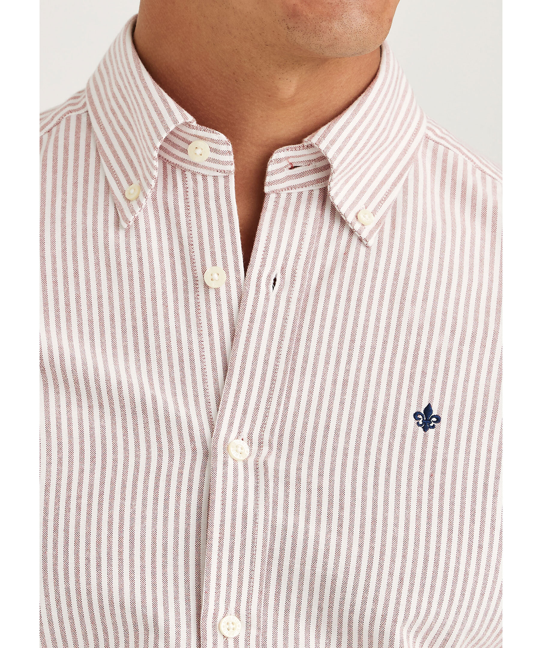 Röd och vit randig oxfordskjorta från Morris. Skjortan har button-down krage, signaturlilja broderad på vänster bröst samt enkel manschett lätt rundad med två knappar. Tillverkad i 100% bomull.
