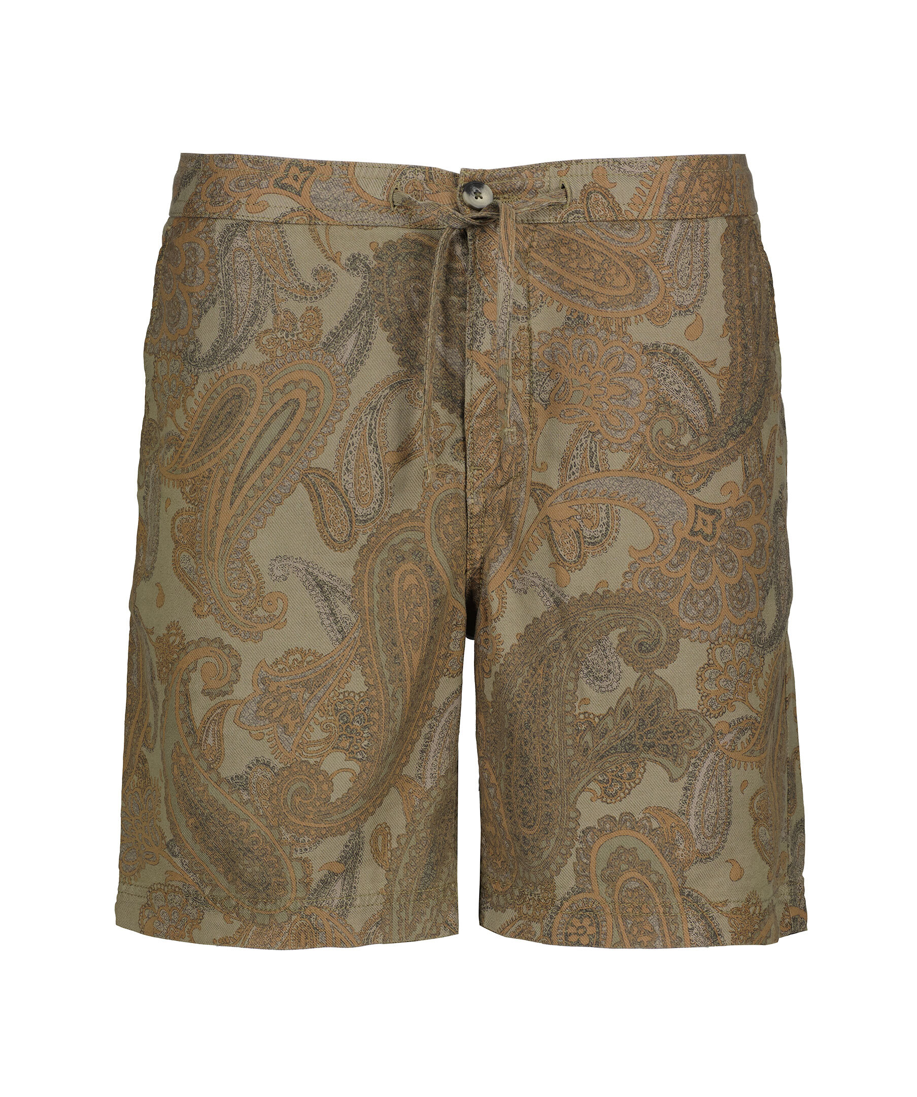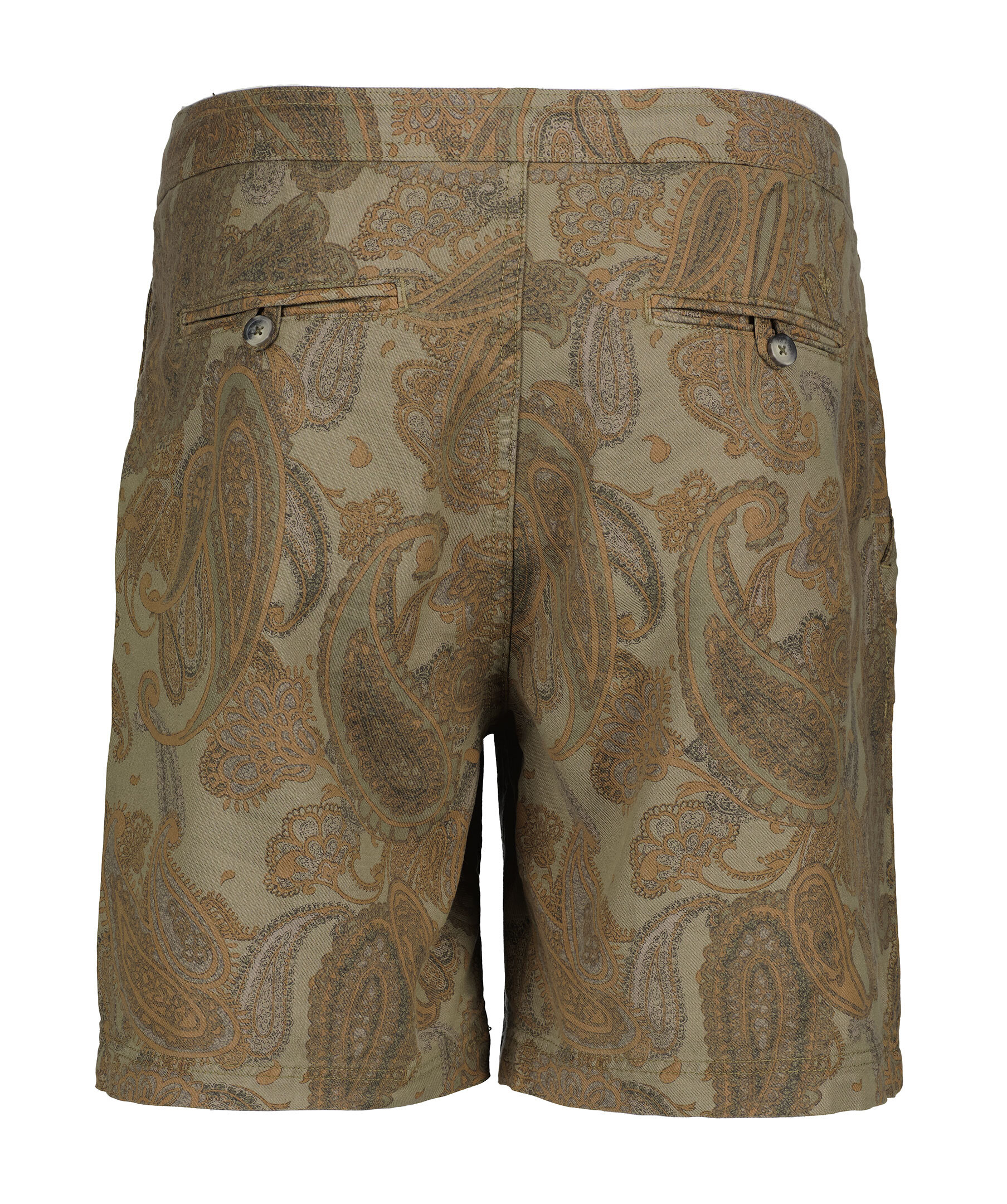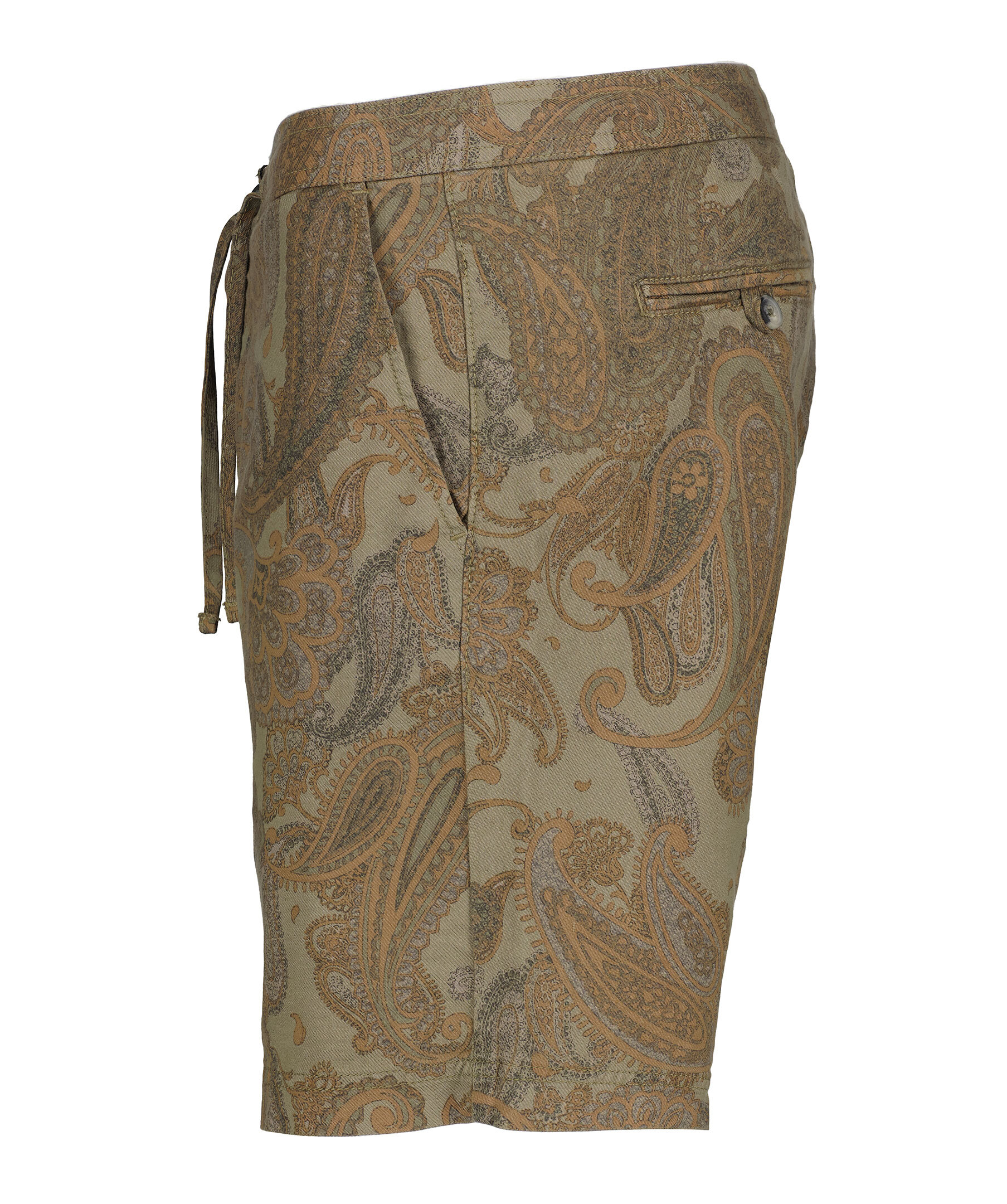 Olivgröna linneshorts från Morris med iögonfallande paisley tryck. Sydd i en mjuk och stretchig bomull/lin mix från den spanska vävaren Dagiulio och sedan plaggtvättad för att skapa ett lätt urtvättat utseende. De har en avslappnad passform och en elastisk midja med knyt – allt för extra komfort.