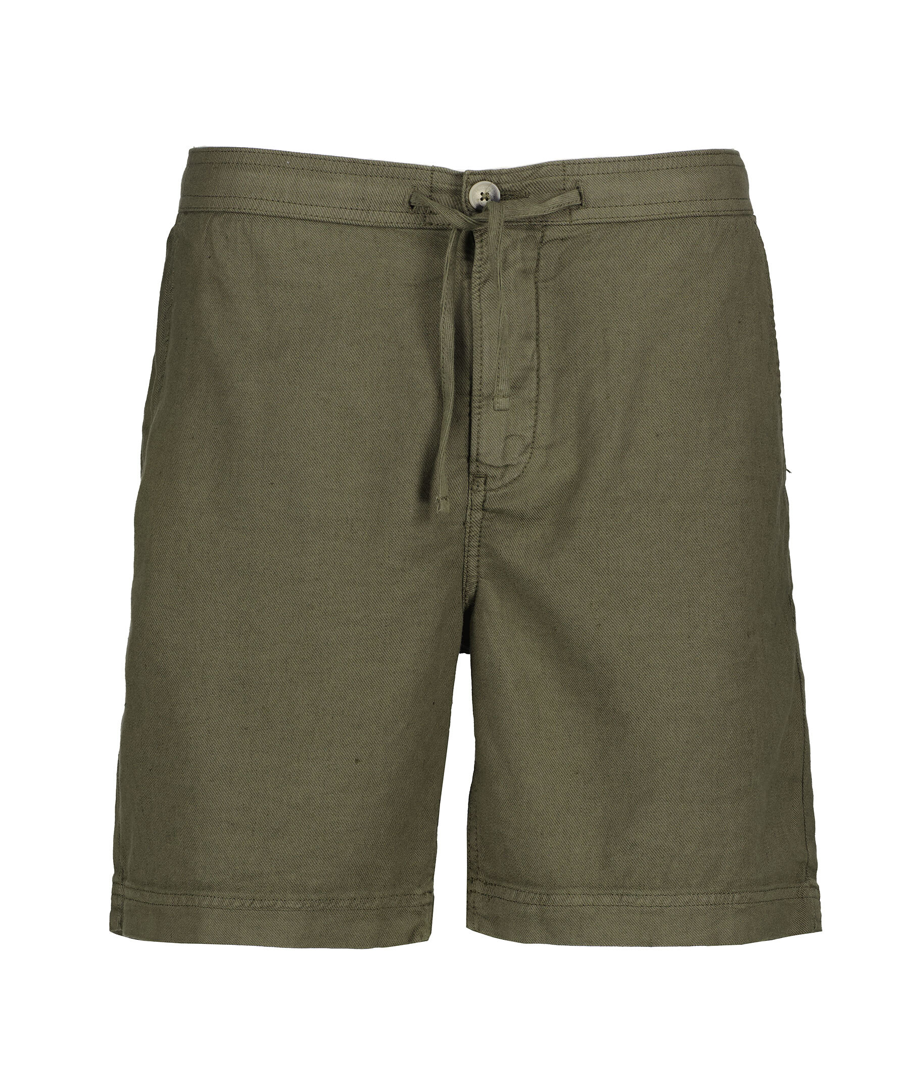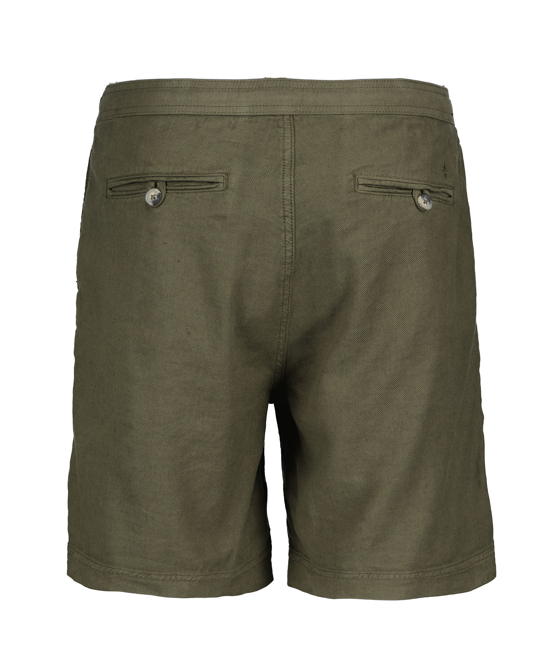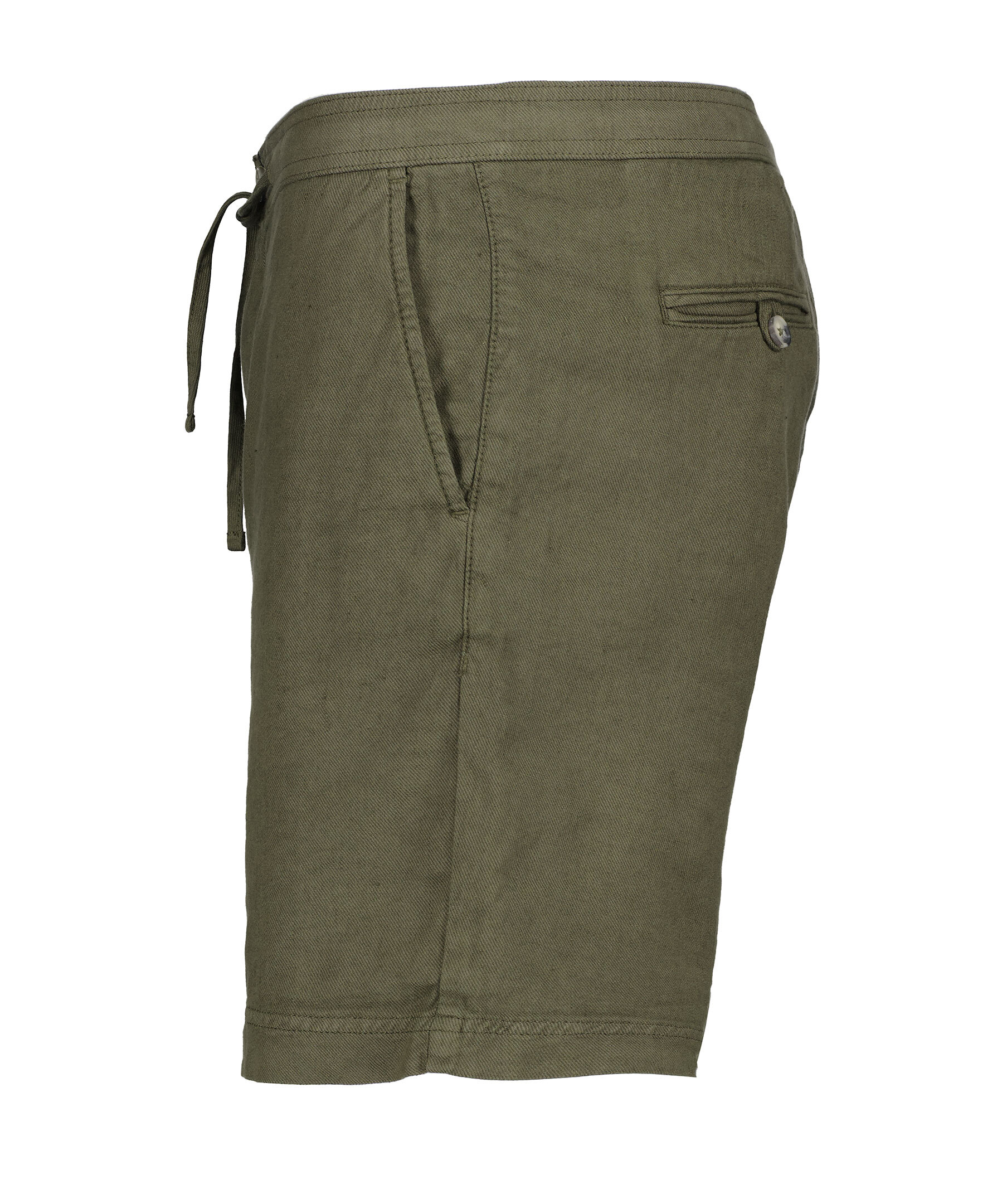 Olivgröna linneshorts från Morris. Sydd i en mjuk och stretchig bomull/lin mix från den spanska vävaren Dagiulio och sedan plaggtvättad för att skapa ett lätt urtvättat utseende. De har en avslappnad passform och en elastisk midja med knyt – allt för extra komfort.