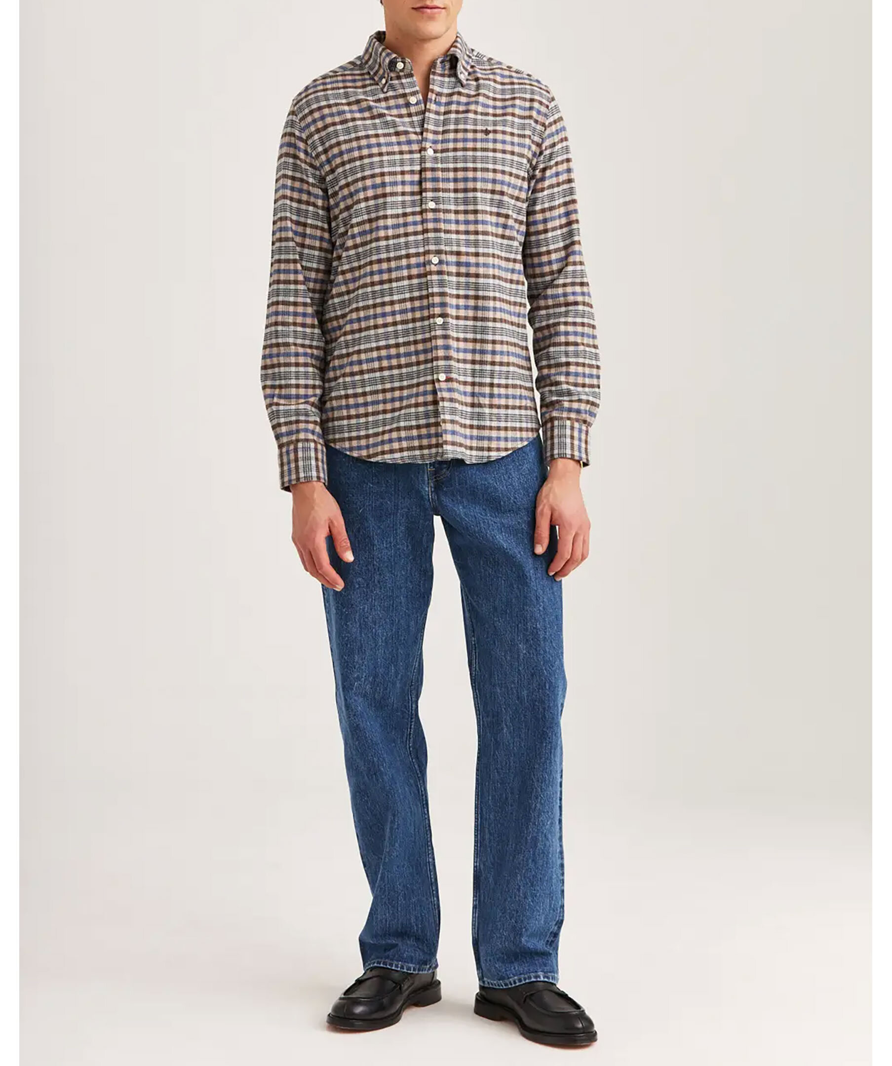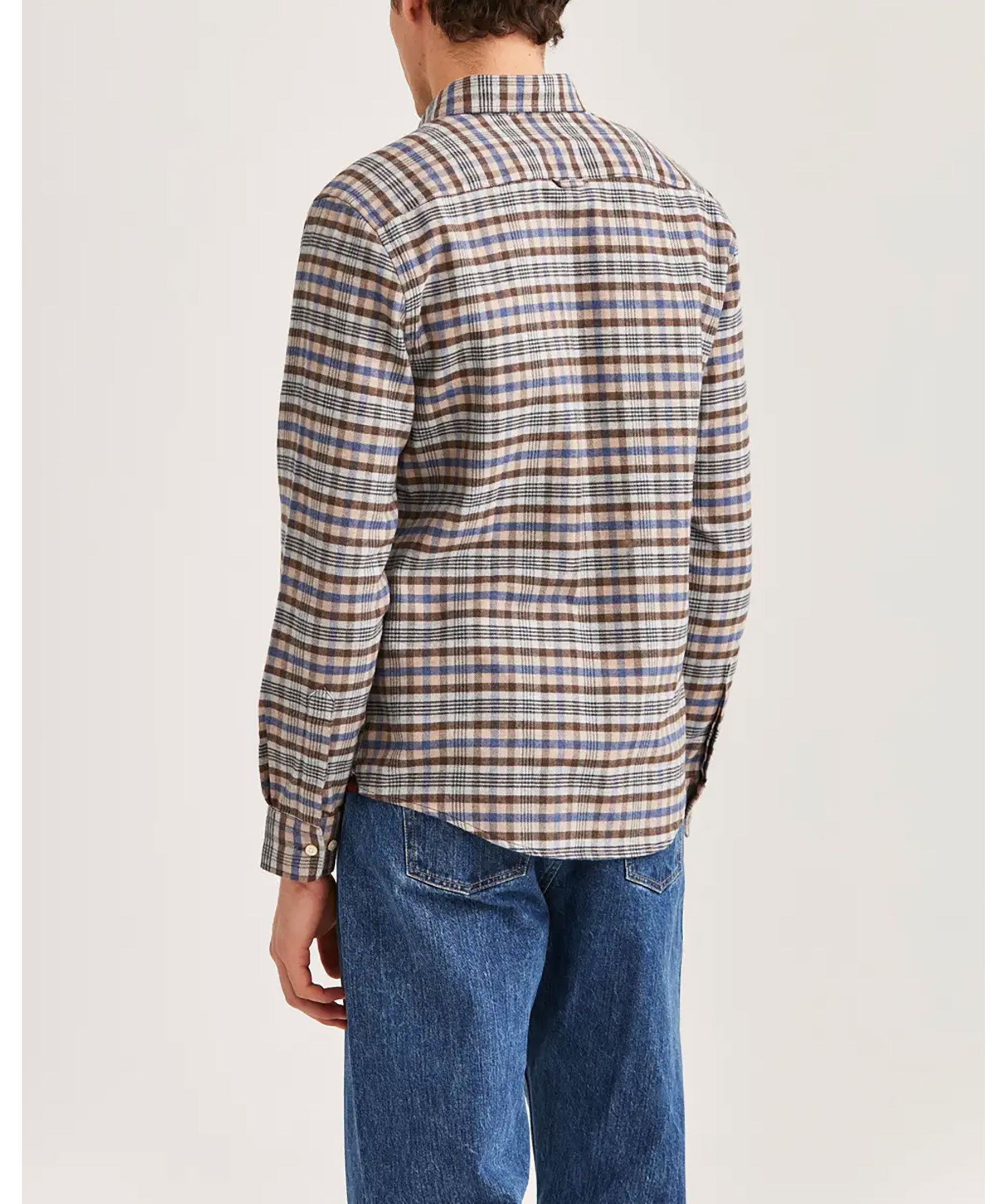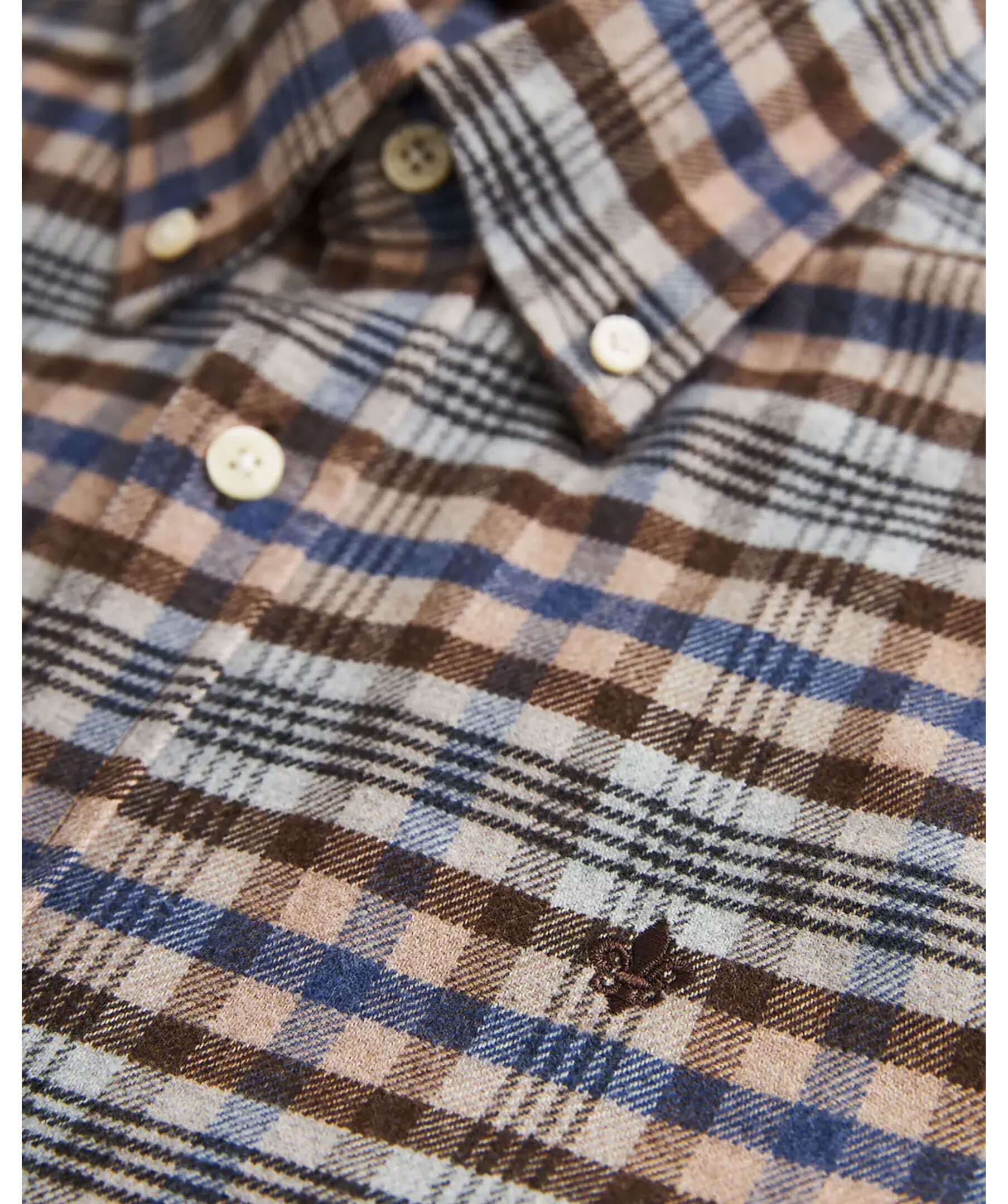 Flannel Check Shirt Slim Fit i brun nyans från Morris Stockholm. Skjortan är tillverkad i mjuk borstad bomullsflanell med ett rutmönster som ger värme utan att kännas tung. Den har button down-krage, enkelmanschett med två knappar och den klassiska Morris-liljan broderad på bröstet. En mångsidig skjorta som passar både under kavaj och för sig själv.
