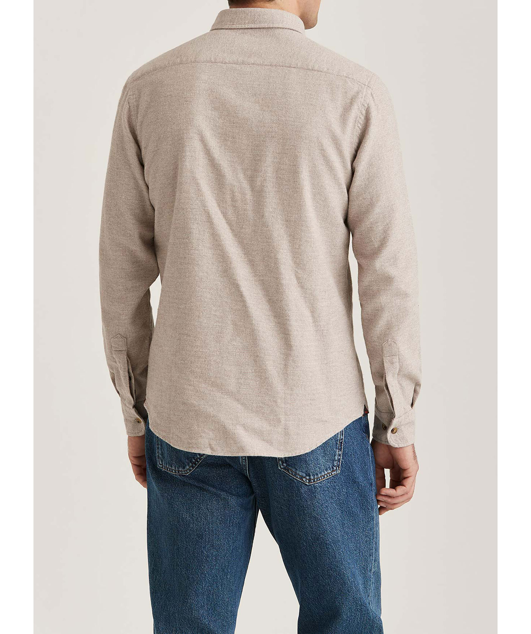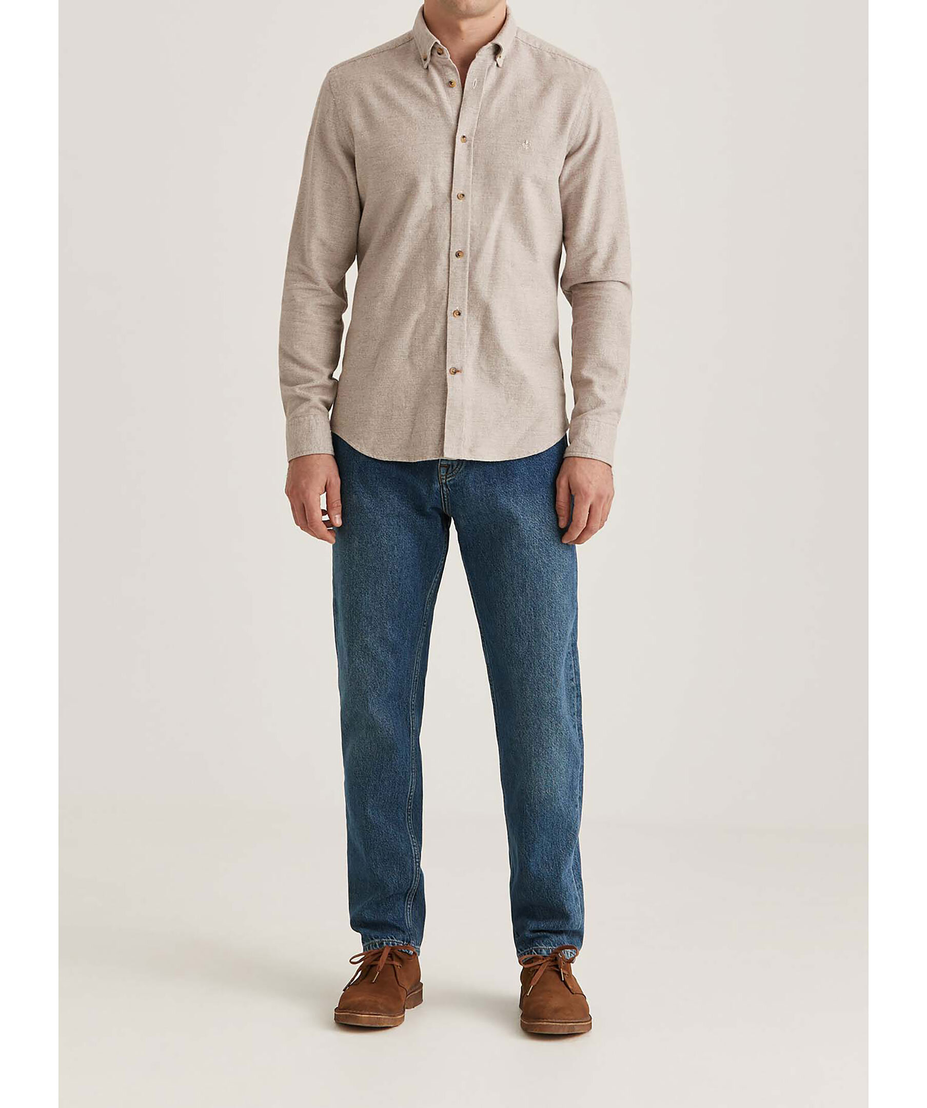 Modellen är 187 cm och bär storlek M. Vit och beige rutig skjorta i flanell från Morris. Button down-krage. Stängs framtill med knappar. Broderad logotyp på vänster bröst. Enkla manschetter. Patch med logotyp i sidan.