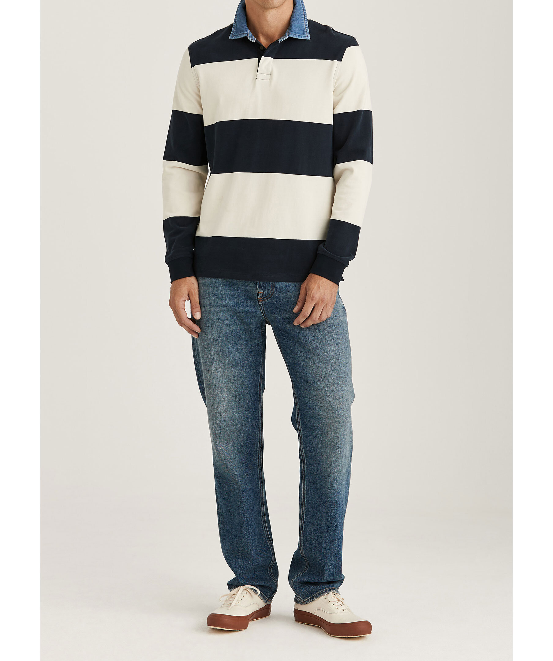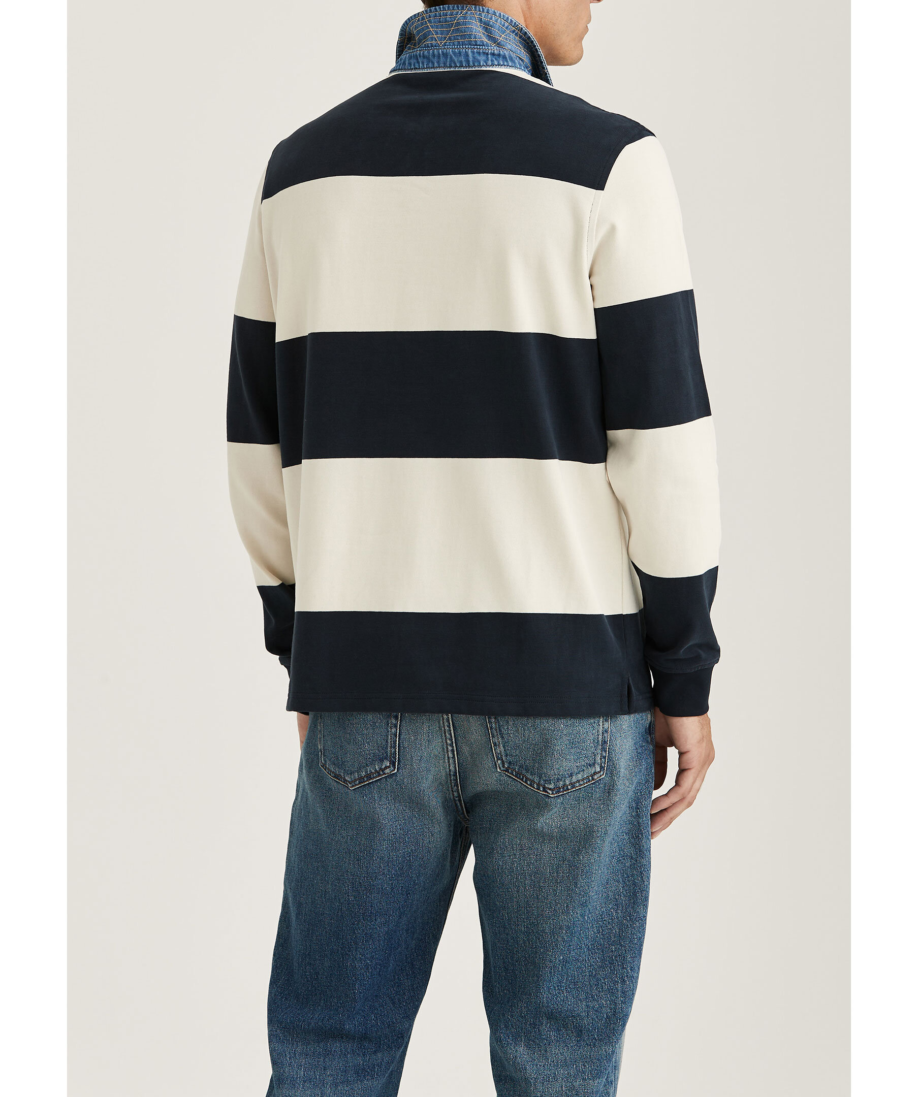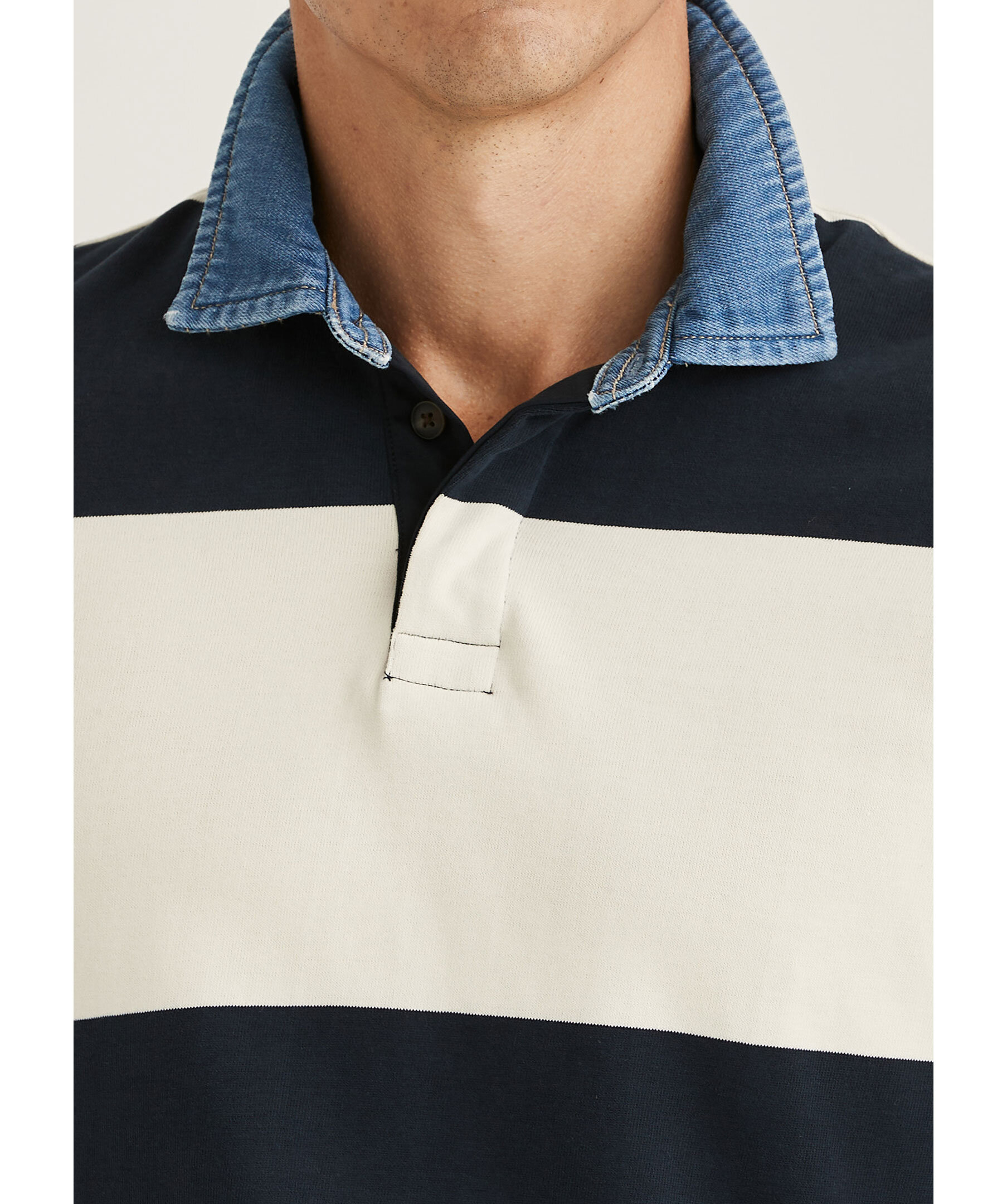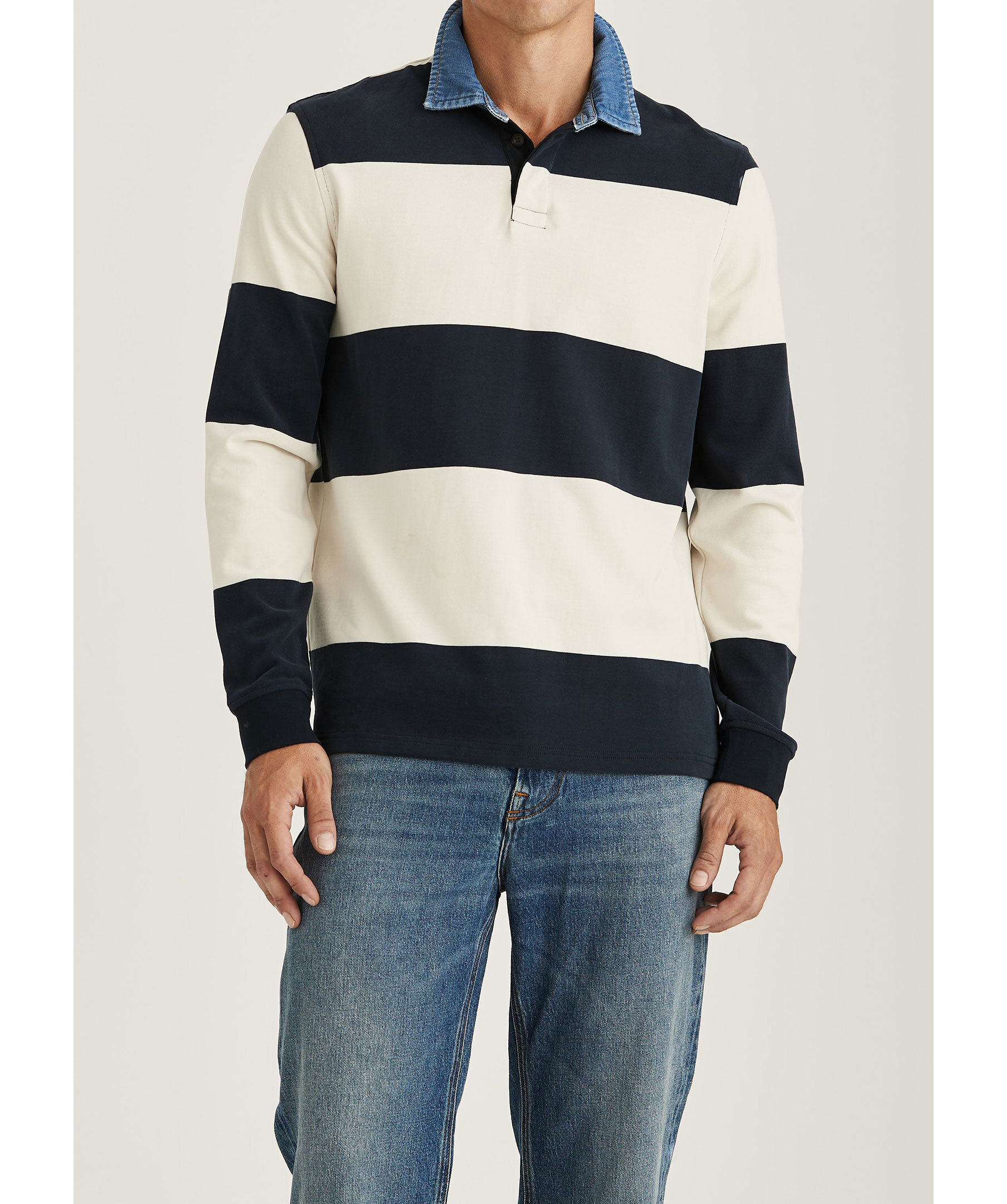 Benvit och blårandig rugbytröja från Morris. Tröjan har krage i bomullsdenim, dolda knappar och är tillverkad i borstat bomullstyg.