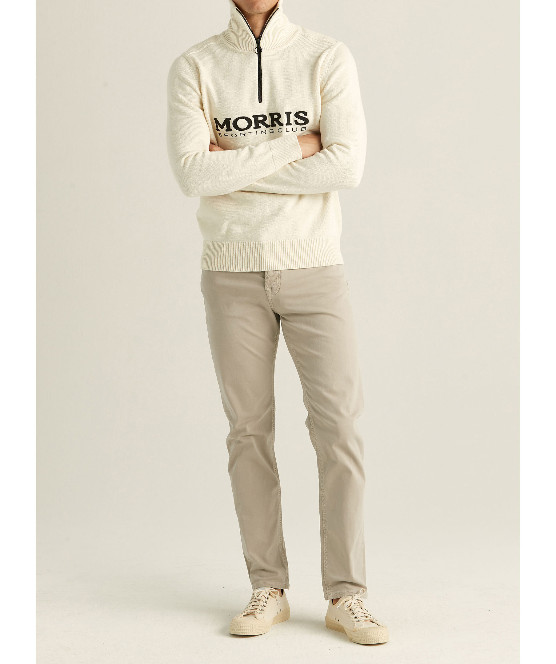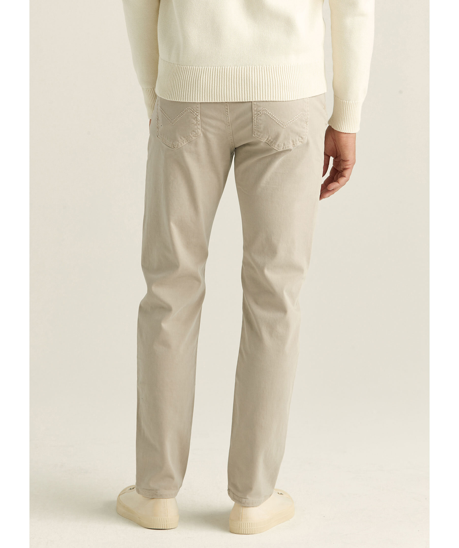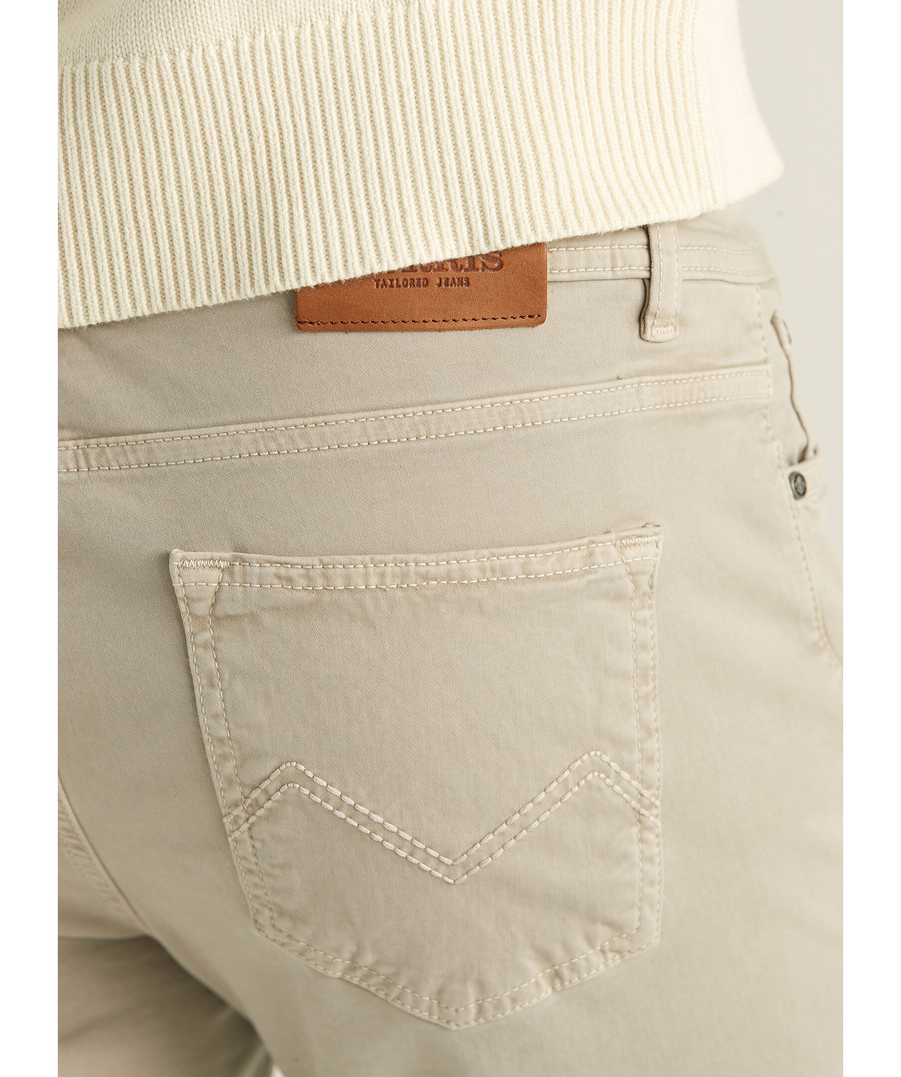Beigea jeans från Morris. Broderad logotyp på myntfickan, fem-ficksmodell, slim fit modell med något vidare benslut samt etikett i läder baktill.