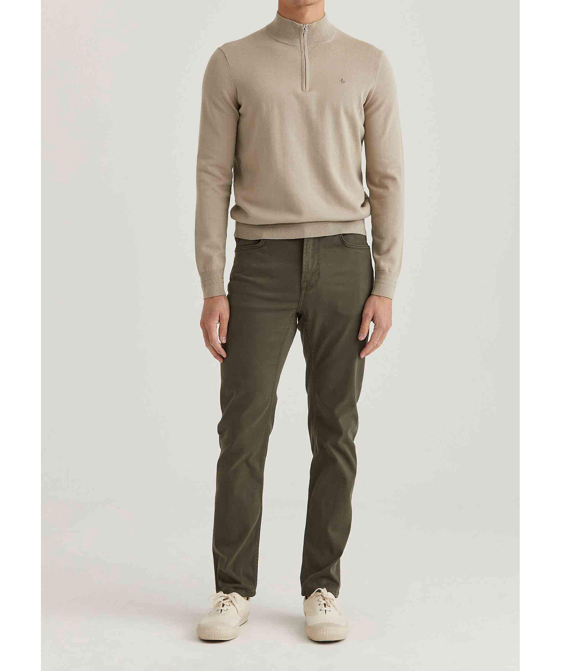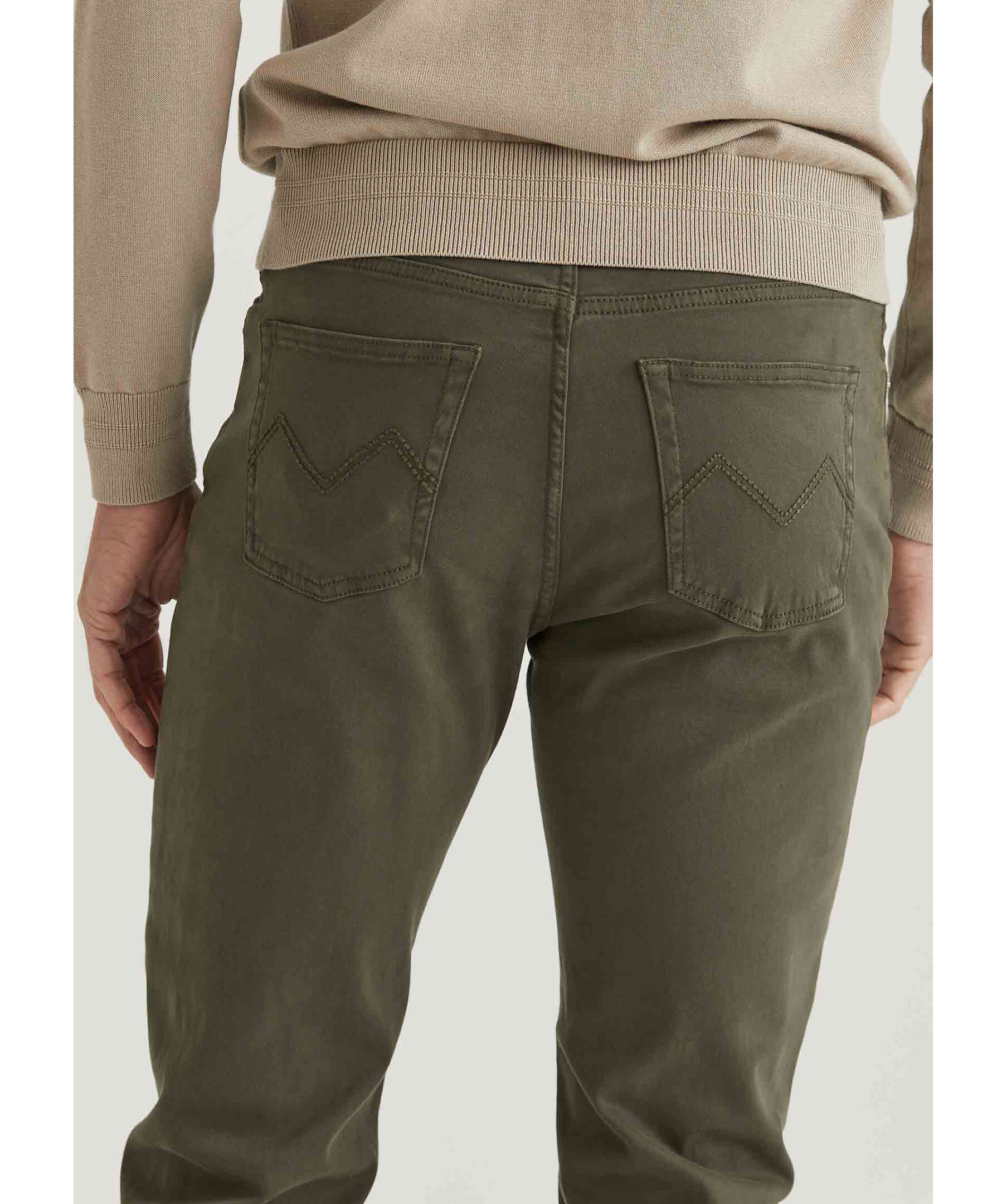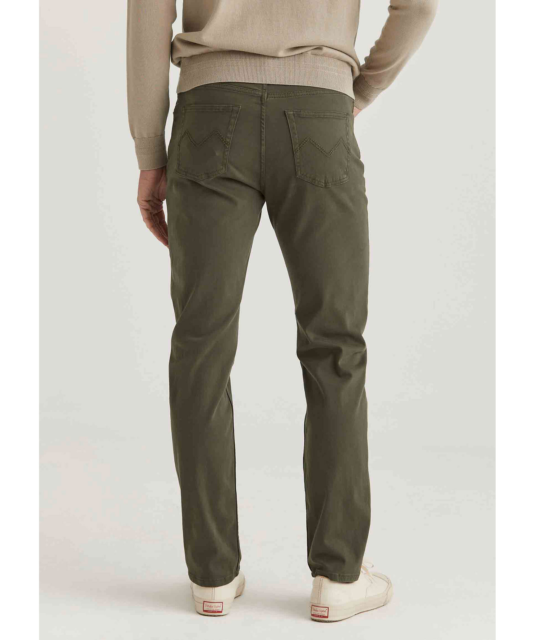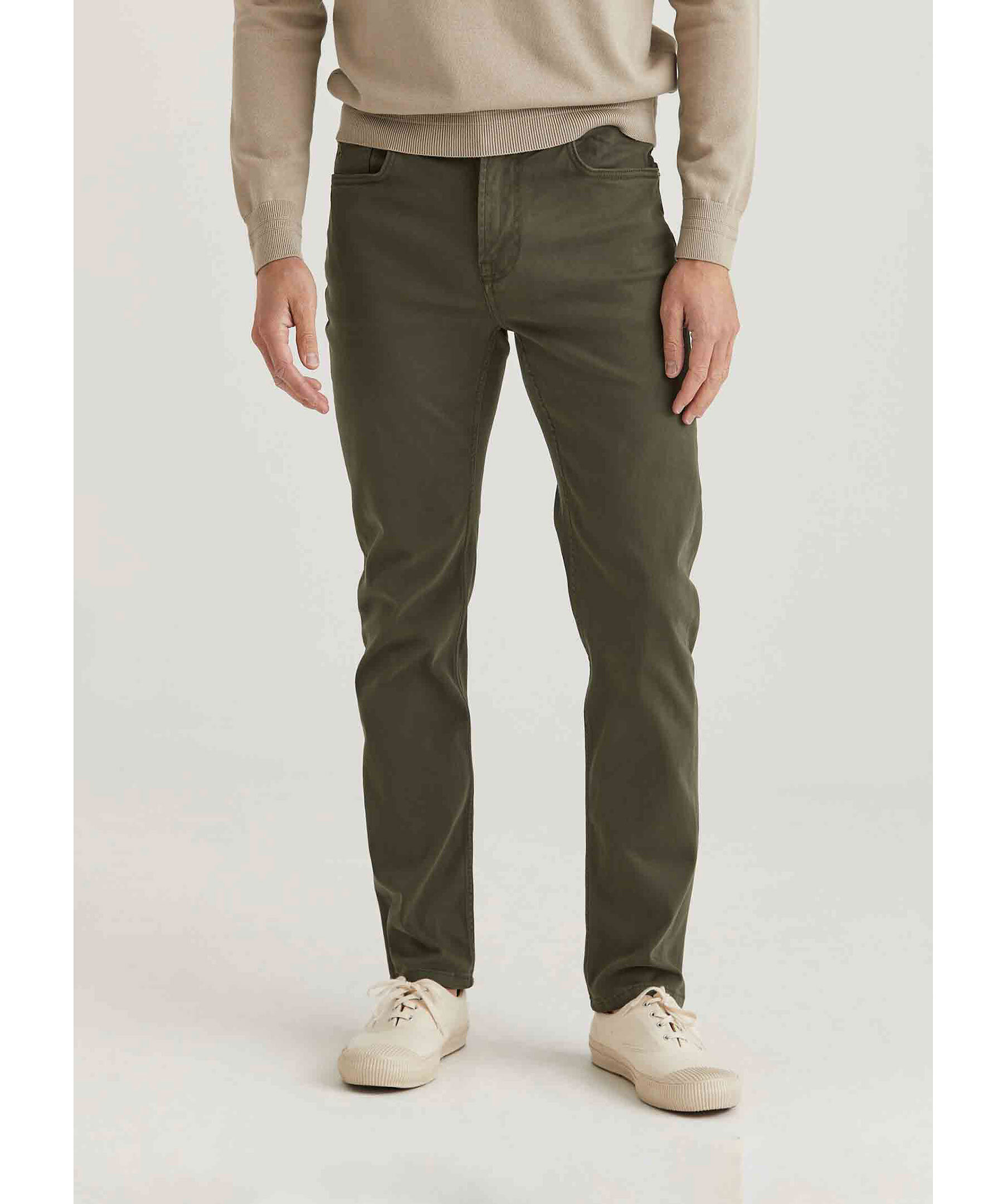 Olivgröna chinos från Morris. Tillverkad i en borstad bomullssatäng med medelhög midja och ett smalt ben. Byxorna stängs med knapp, har fem fickor och broderad Morris lilja på myntfickan framtill samt signaturbrodyr på bakfickor.