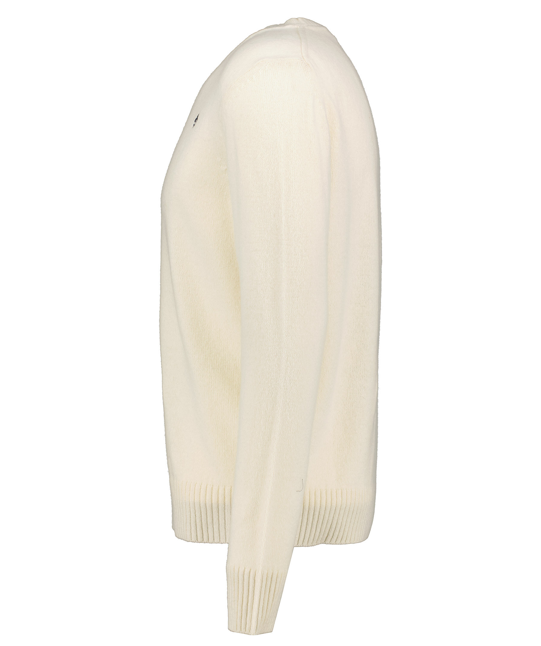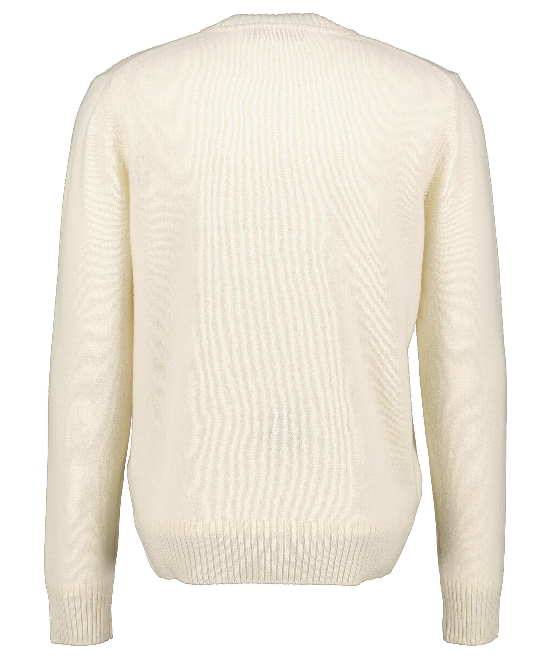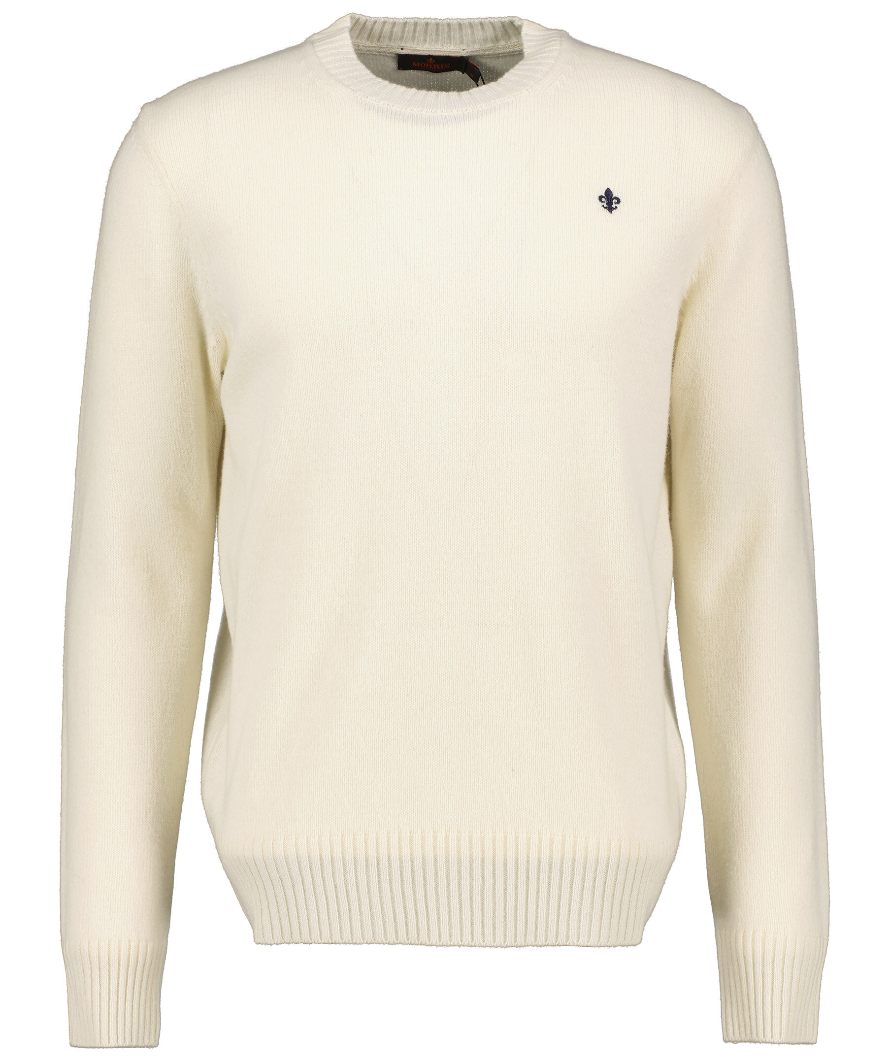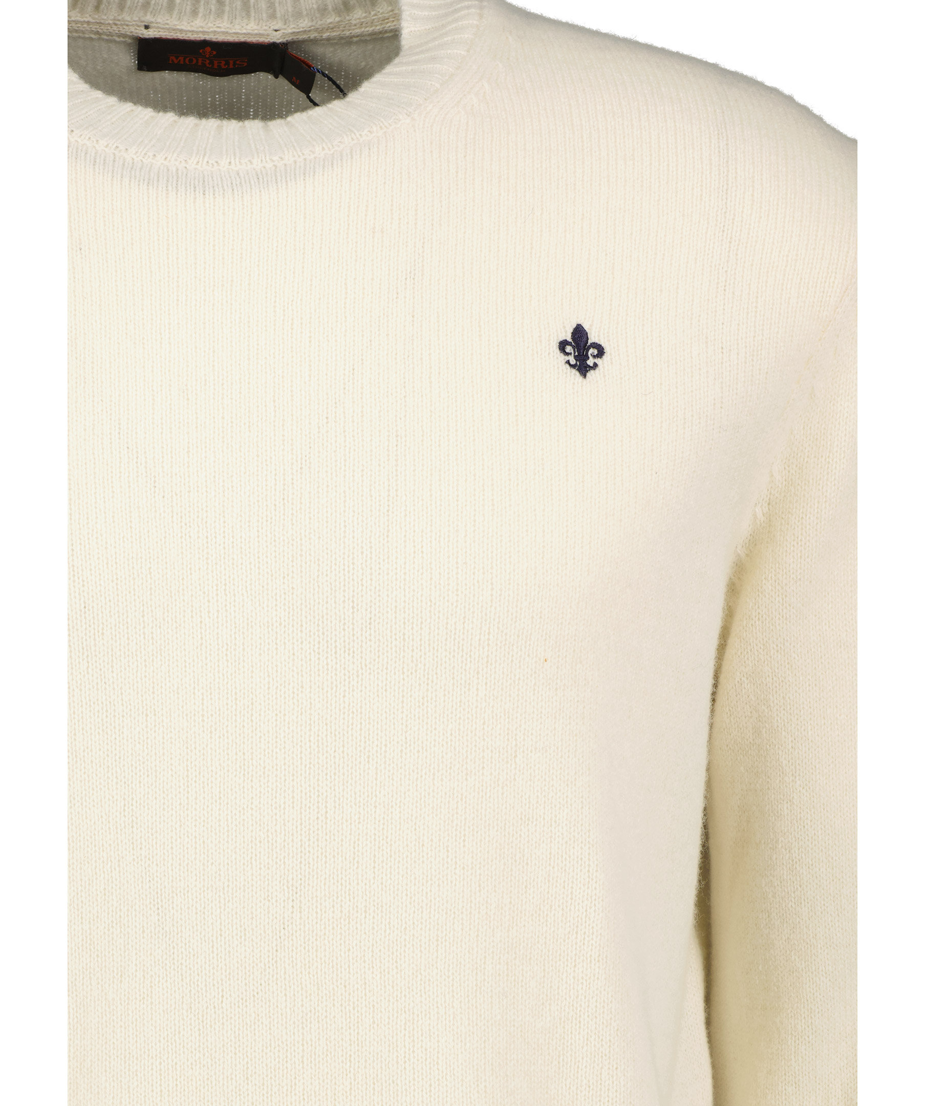 Benvit finstickad pullover från Morris. Tröjan har en rak passform som ger en avslappnad look. Gjord av 100% merinoull. Broderad logotyp, ribbstickade muddar vid halsring, ärm och plaggslut.