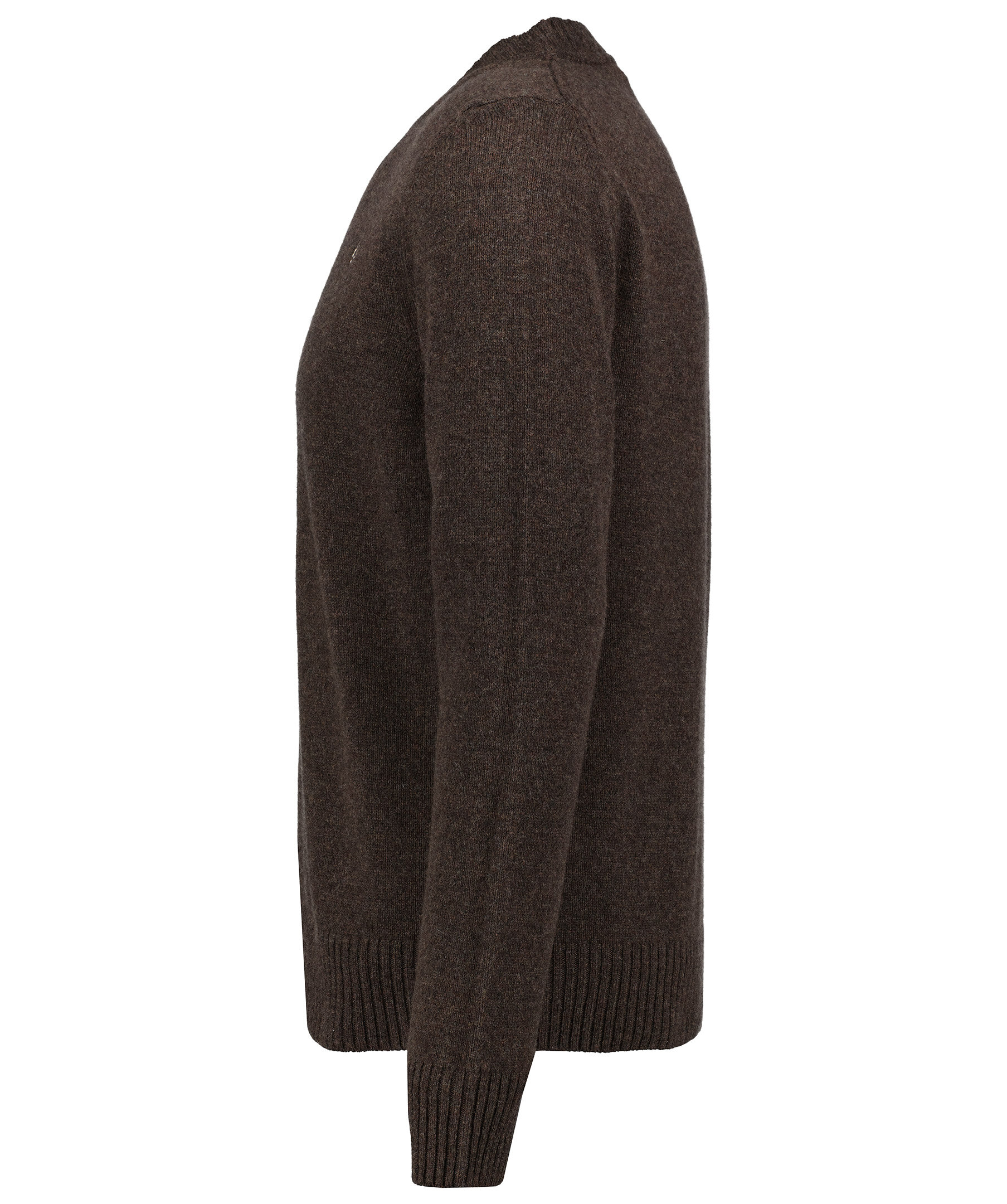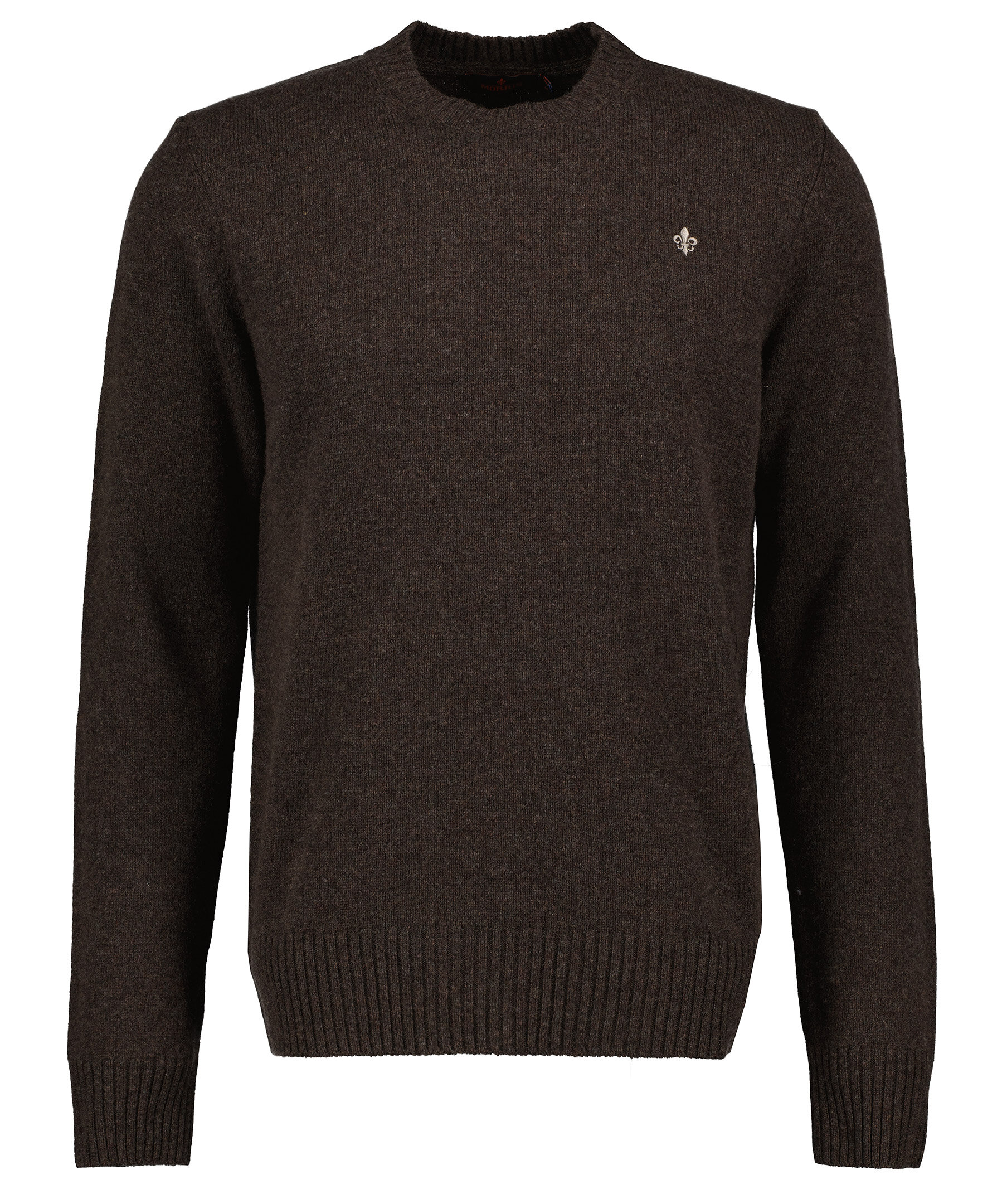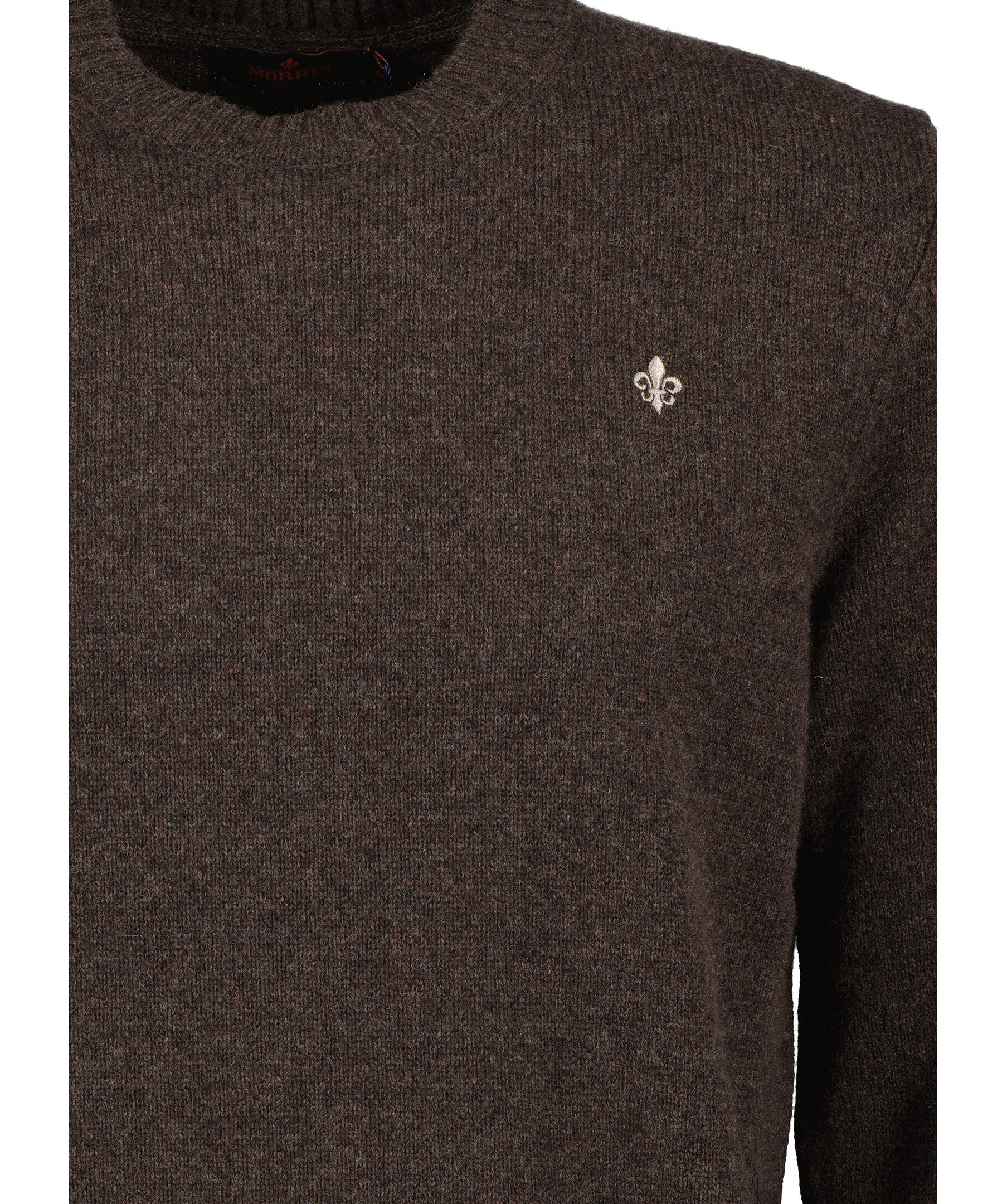 Brun finstickad pullover från Morris. Tröjan har en rak passform som ger en avslappnad look. Gjord av 100% merinoull. Broderad logotyp, ribbstickade muddar vid halsring, ärm och plaggslut.
