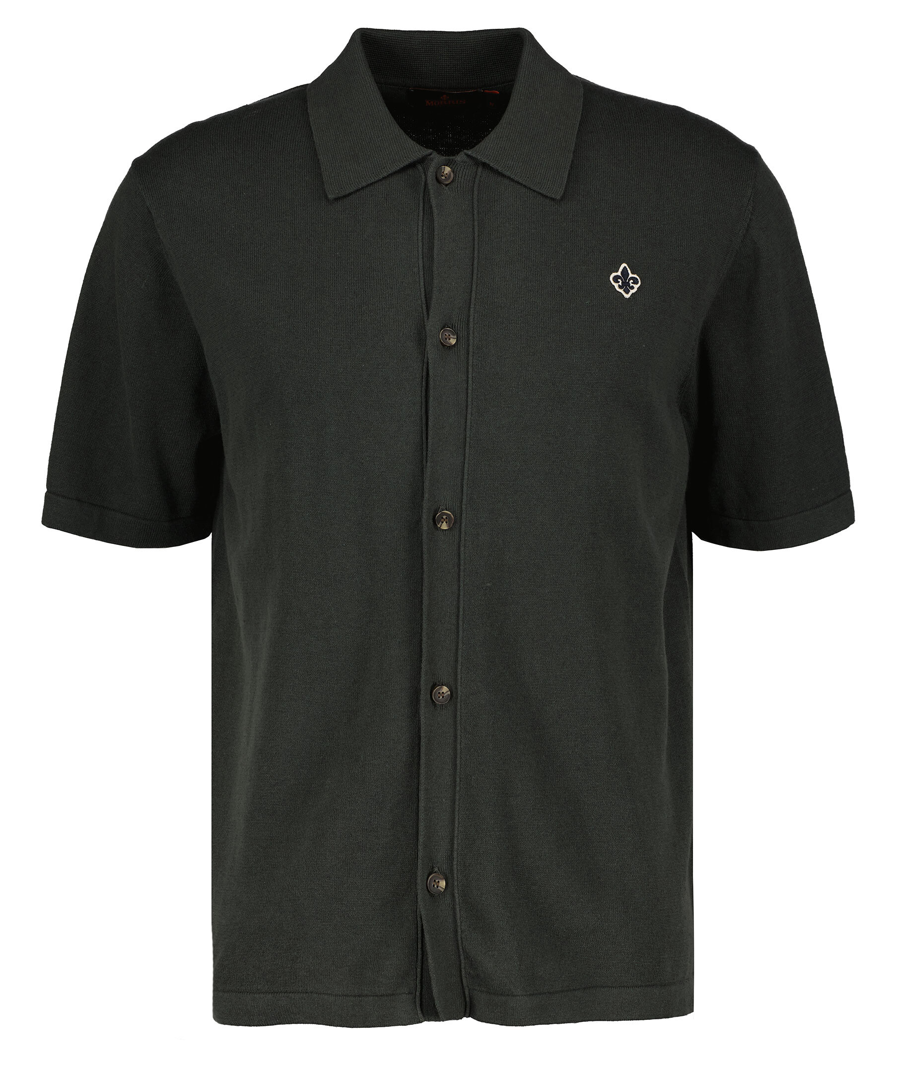 Mörkgrön pikétröja från Morris. Knappar framtill längs hela tröjan. Tillverkad i Bomull och linne blandning. Broderad patch med logotyp på vänster bröst.